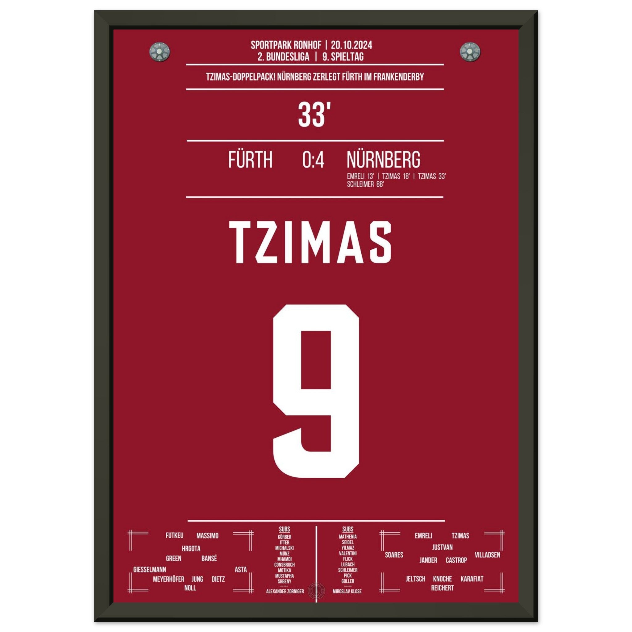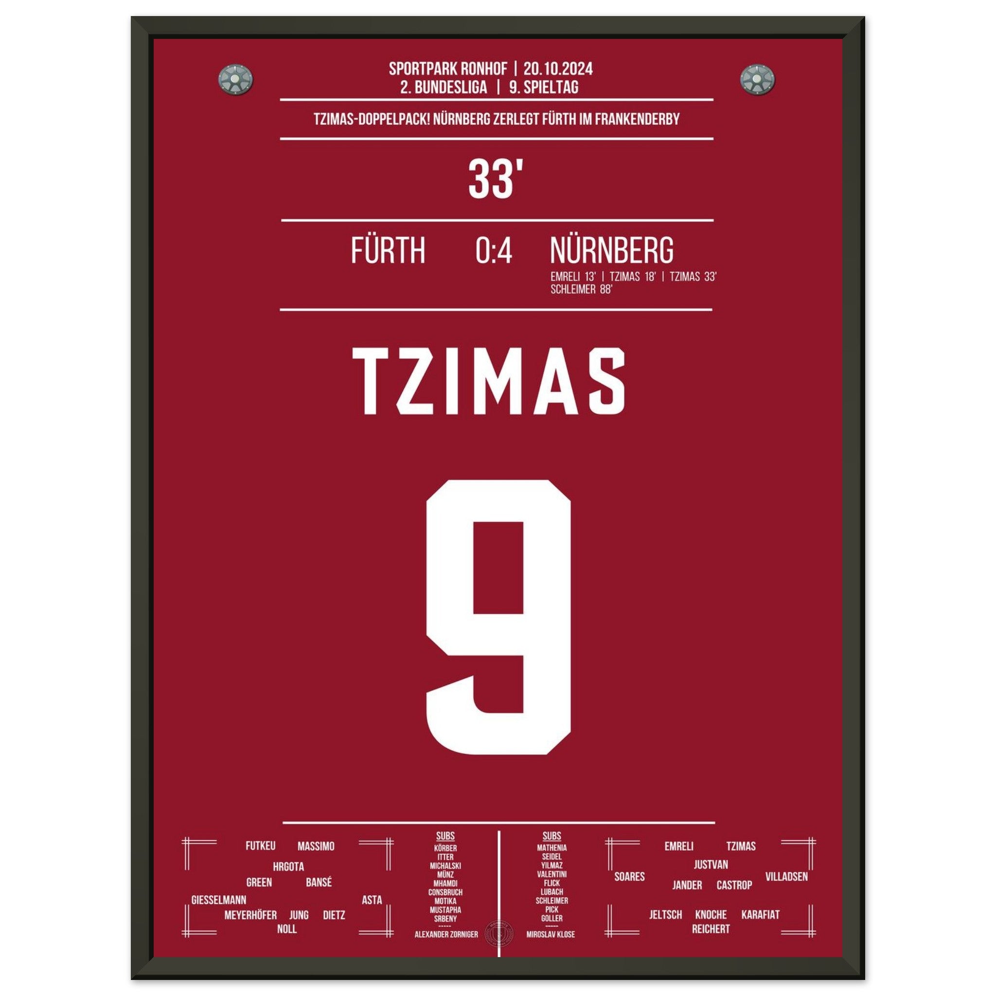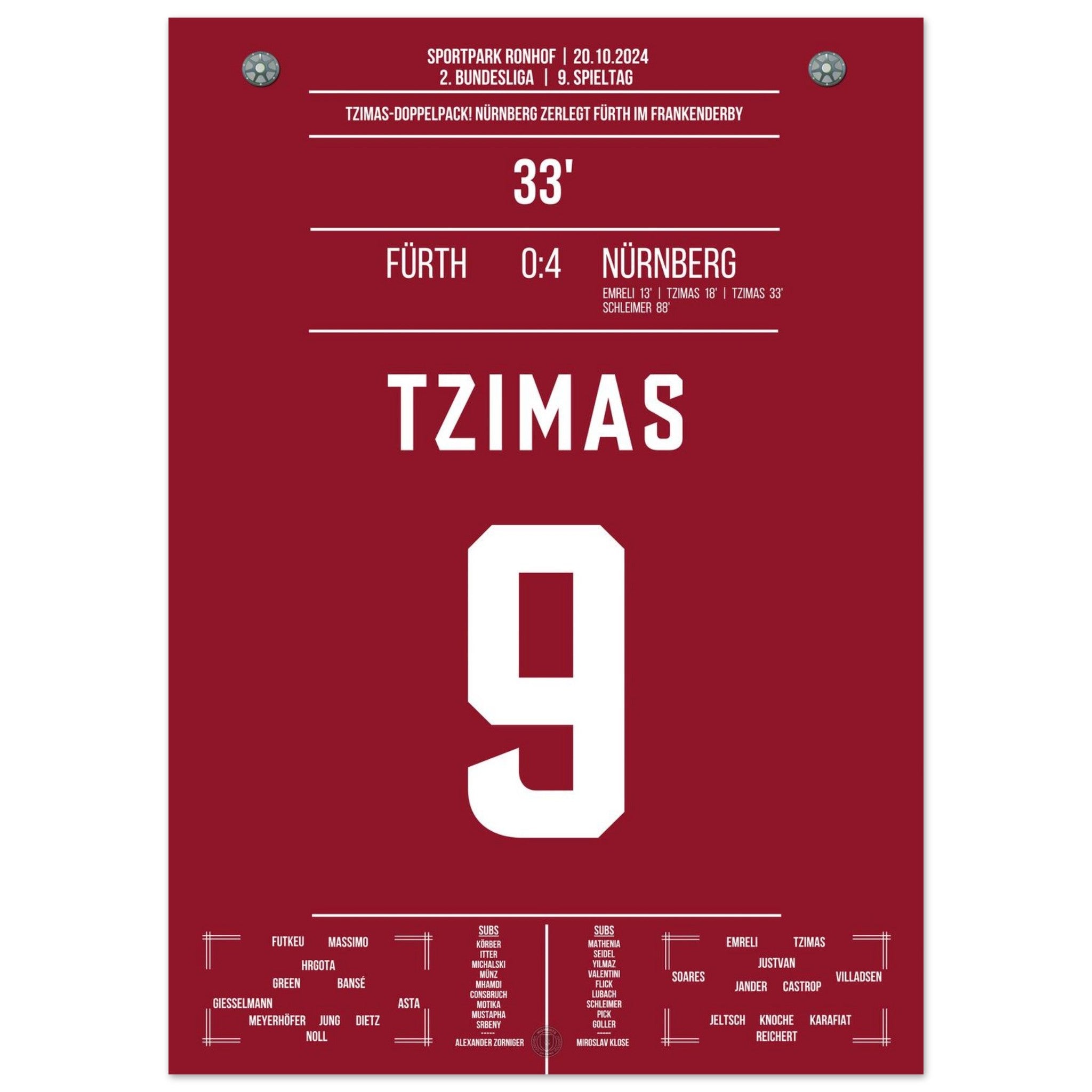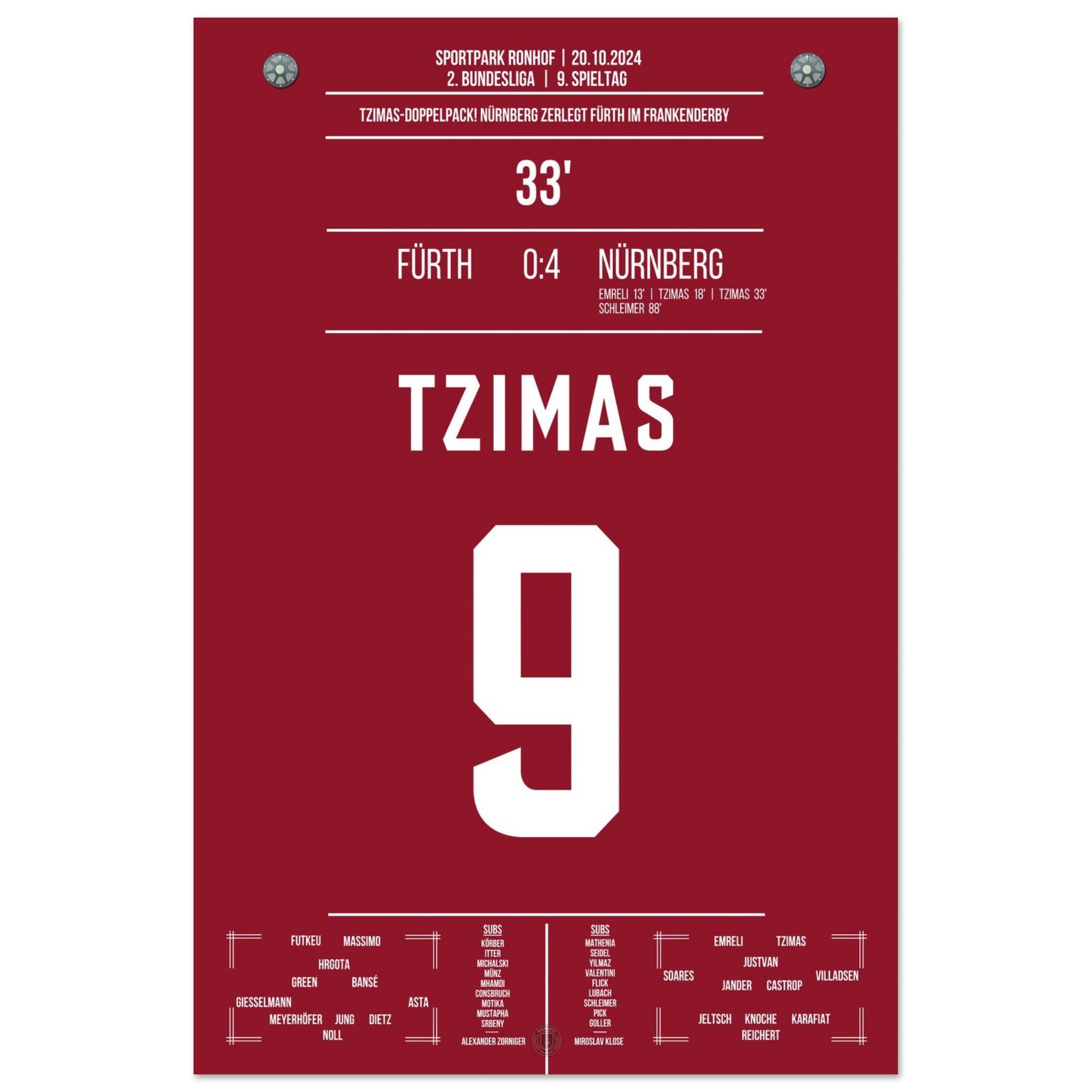 20.Oktober 2024 – Fürth vs. Nürnberg 0:24: Im prestigeträchtigen Frankenderby trifft Tzimas doppelt und entscheidet die Partie fast im Alleingang. Mit seinem Doppelpack sorgt er für grenzenlosen Jubel im Gästeblock und sichert Nürnberg den Derbysieg. Unser Poster hält diesen besonderen Moment im rot-schwarzen Derby-Triumph fest.