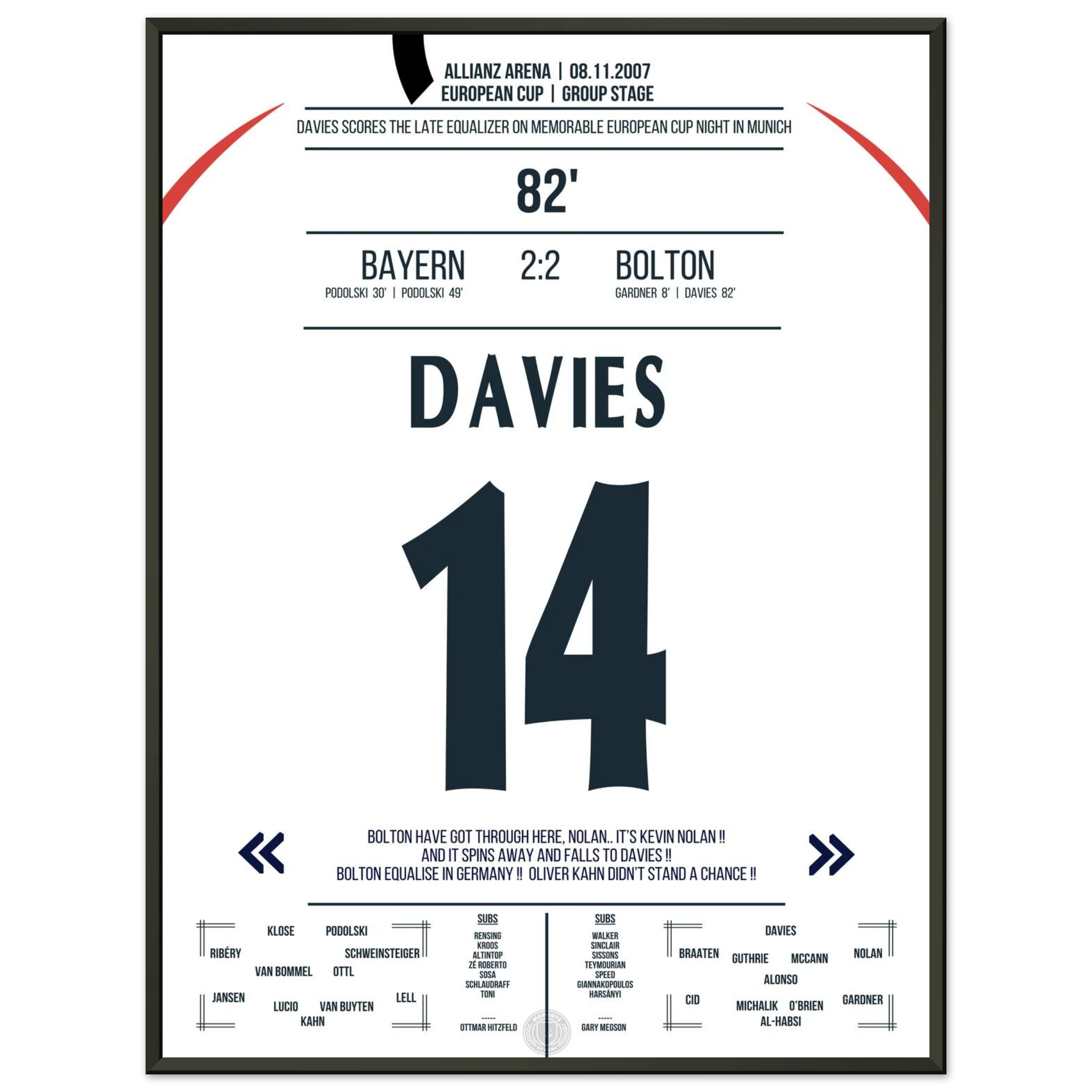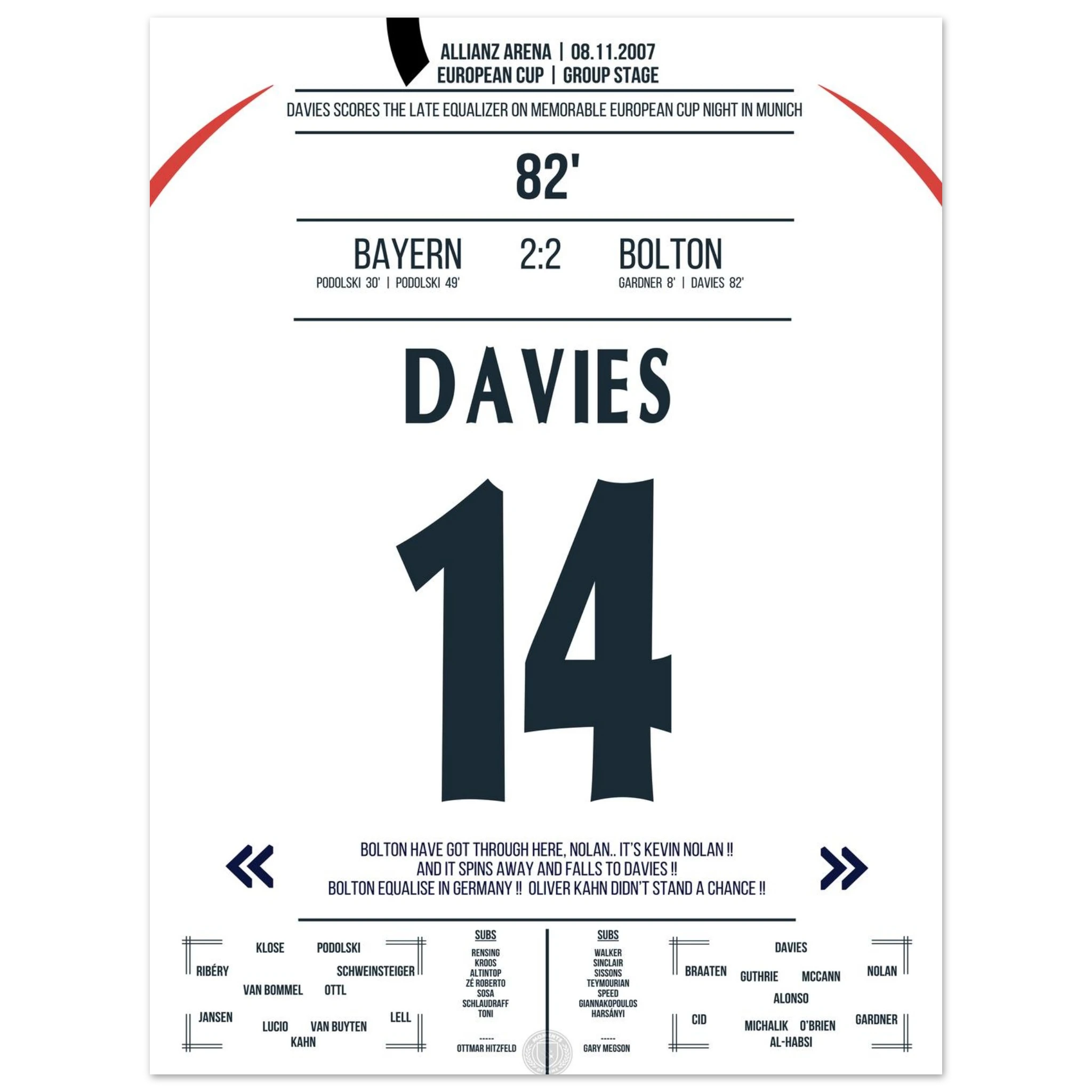 Ein denkwürdiger Europapokalabend in München: Trotz drückender Überlegenheit kassiert Bayern kurz vor Schluss den Ausgleich. In der 82. Minute trifft Kevin Davies nach einem energischen Konter und sichert Bolton ein überraschendes 2:2 gegen den Favoriten.