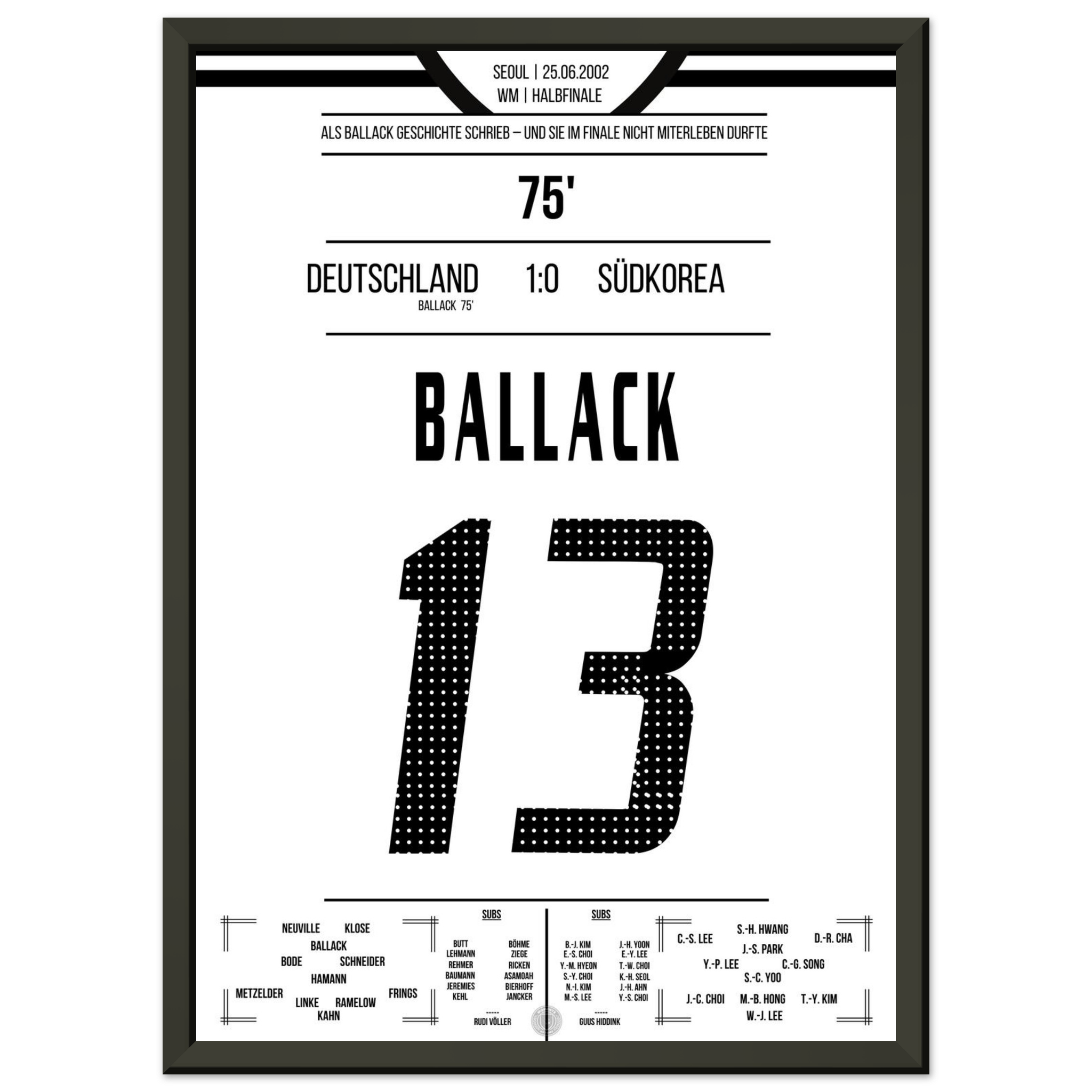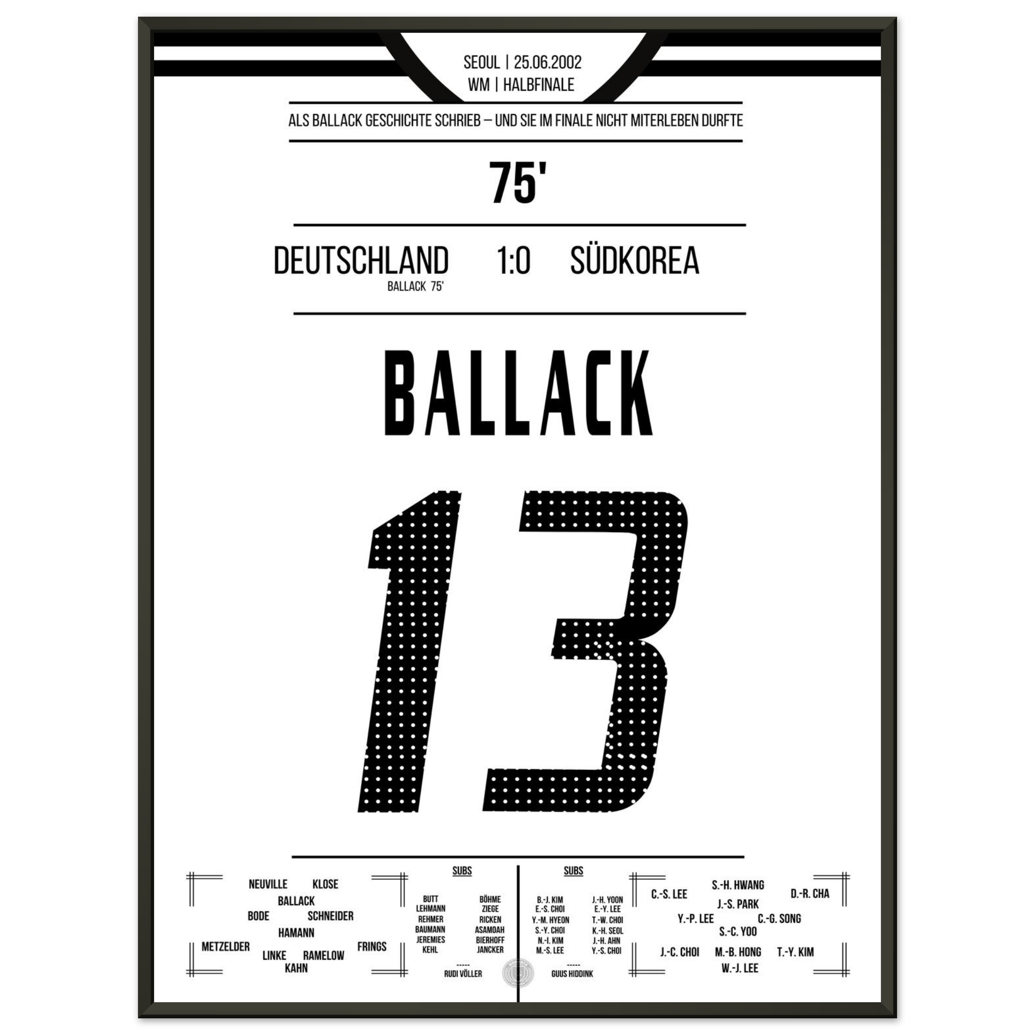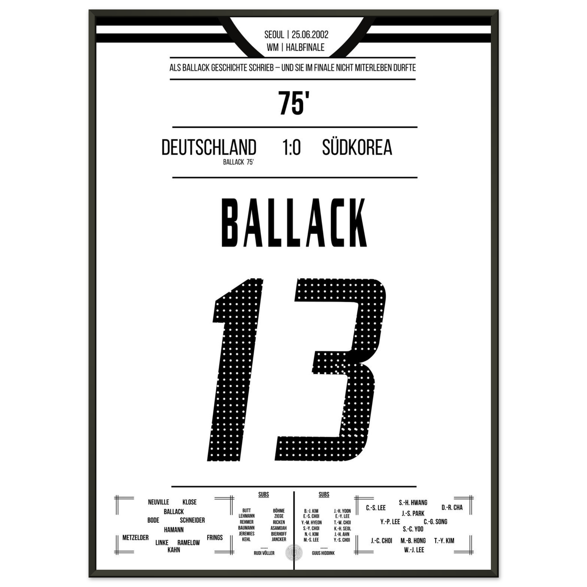 25. Juni 2002 – Deutschland vs. Südkorea 1:0: Im WM-Halbfinale trifft Michael Ballack in der 75. Minute zum entscheidenden 1:0 – und bringt Deutschland ins Finale. Trotz Gelbsperre für das Endspiel opfert er sich für die Mannschaft. Unser Poster verewigt diesen heroischen Ballack-Moment auf dem Weg ins WM-Finale 2002.
