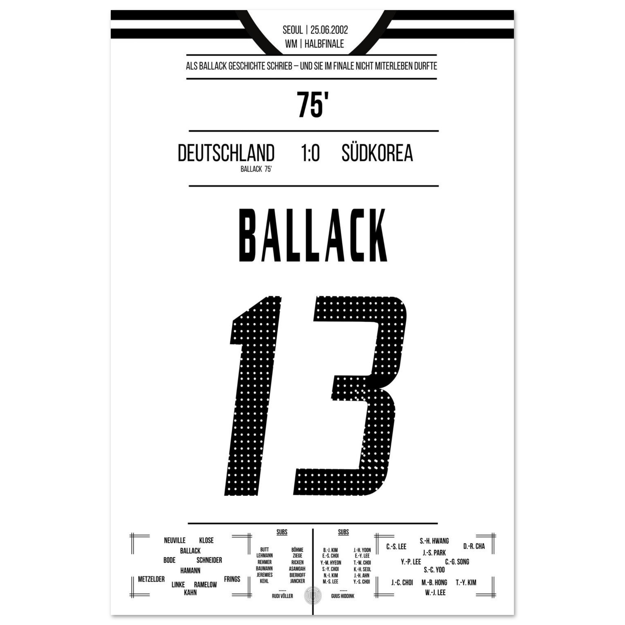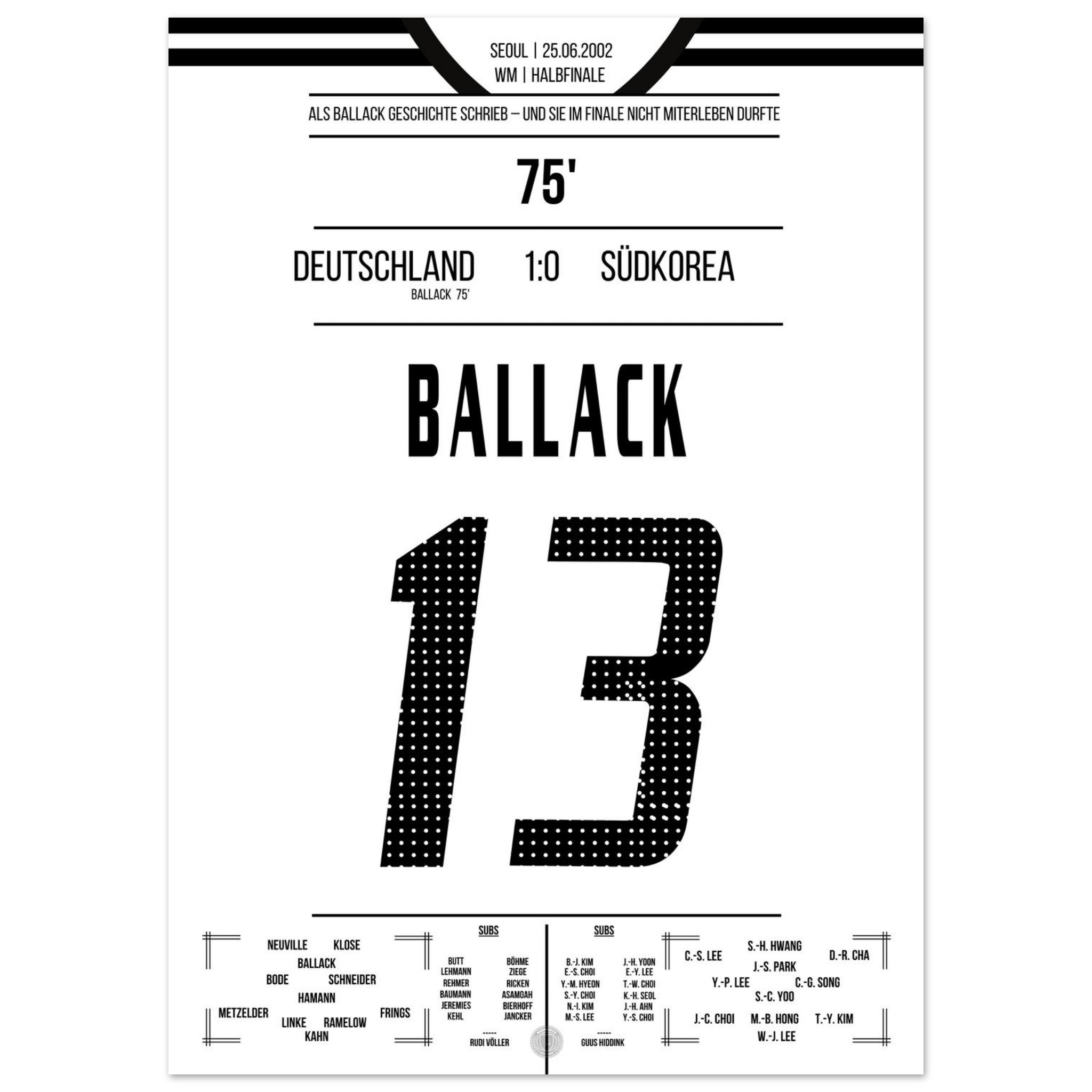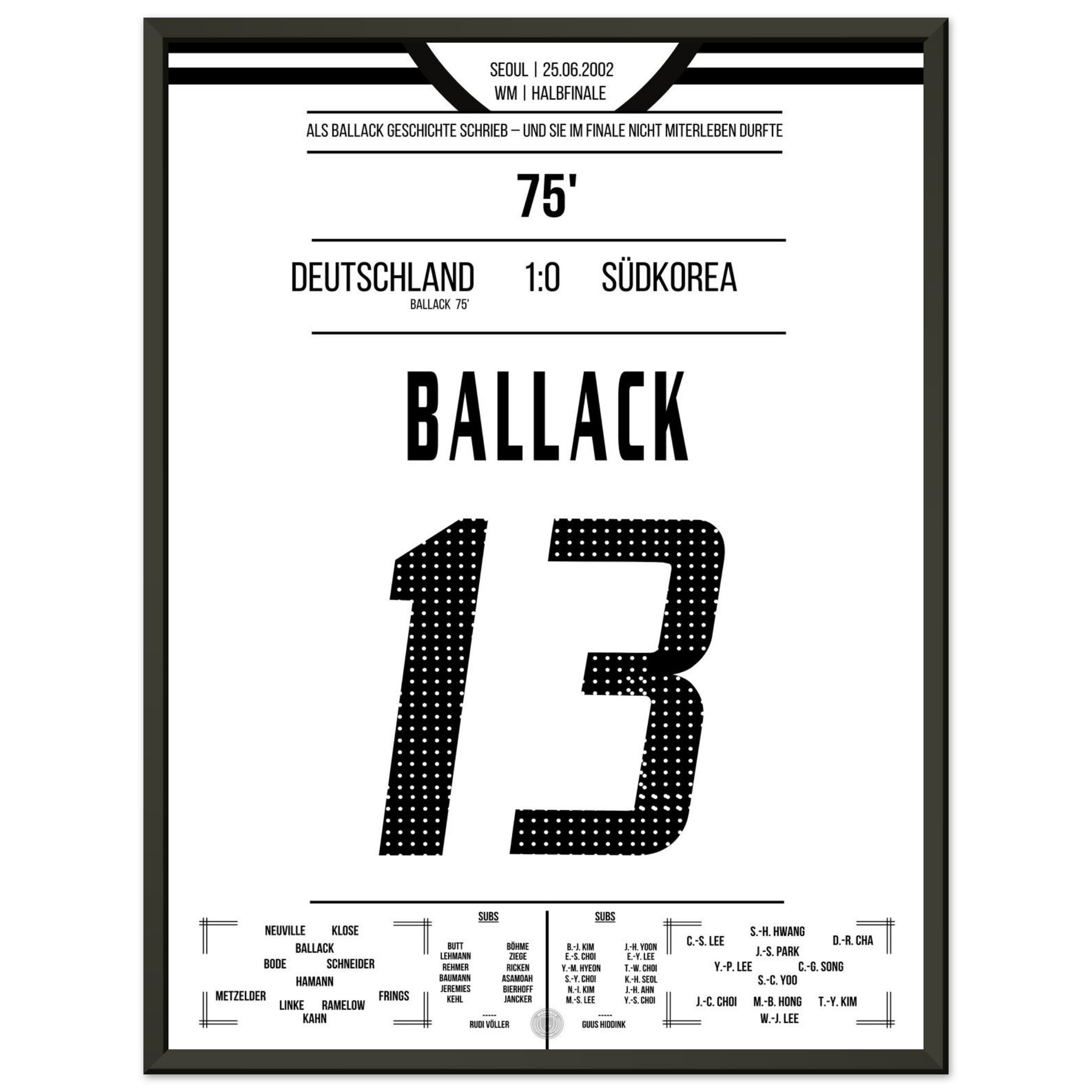 25. Juni 2002 – Deutschland vs. Südkorea 1:0: Im WM-Halbfinale trifft Michael Ballack in der 75. Minute zum entscheidenden 1:0 – und bringt Deutschland ins Finale. Trotz Gelbsperre für das Endspiel opfert er sich für die Mannschaft. Unser Poster verewigt diesen heroischen Ballack-Moment auf dem Weg ins WM-Finale 2002.
