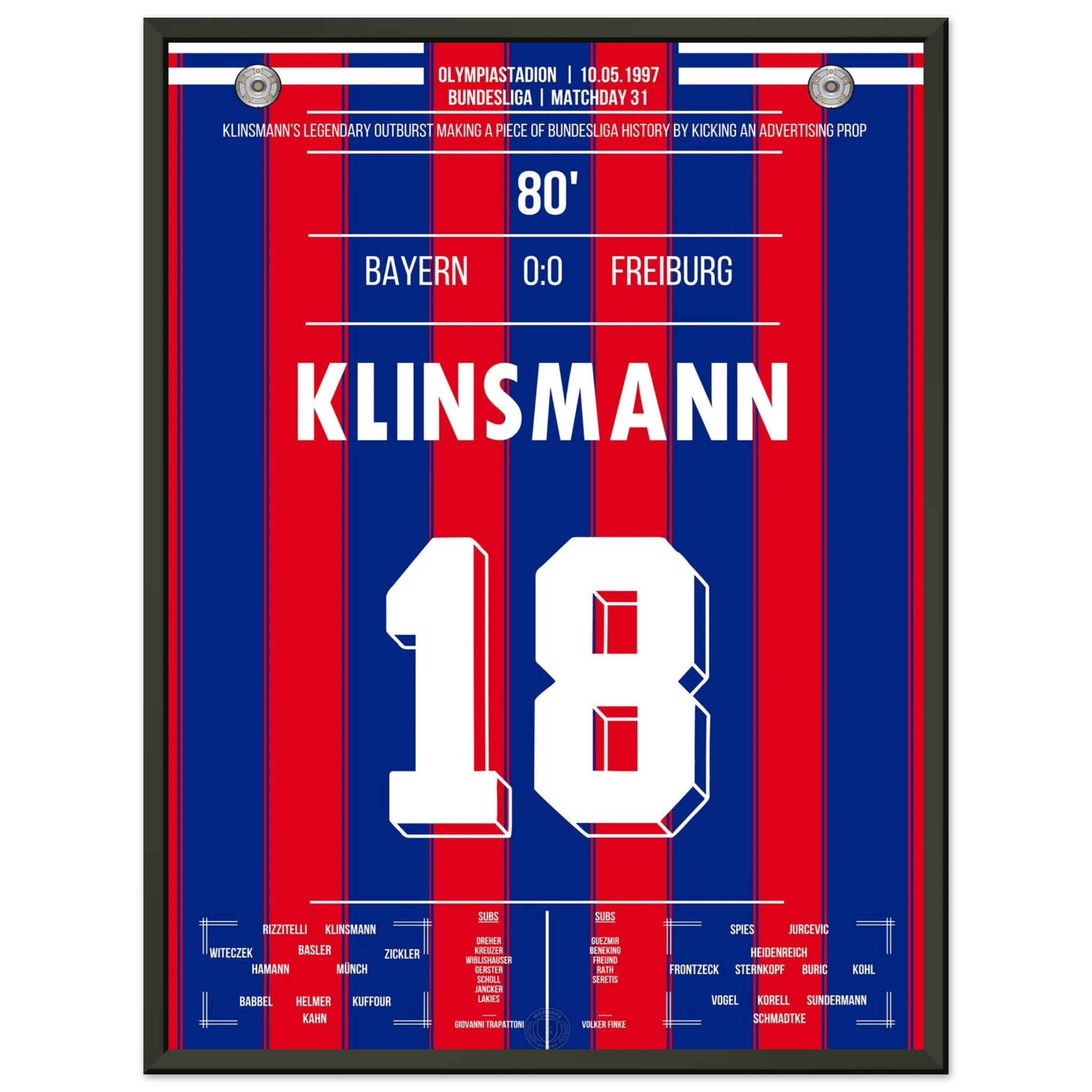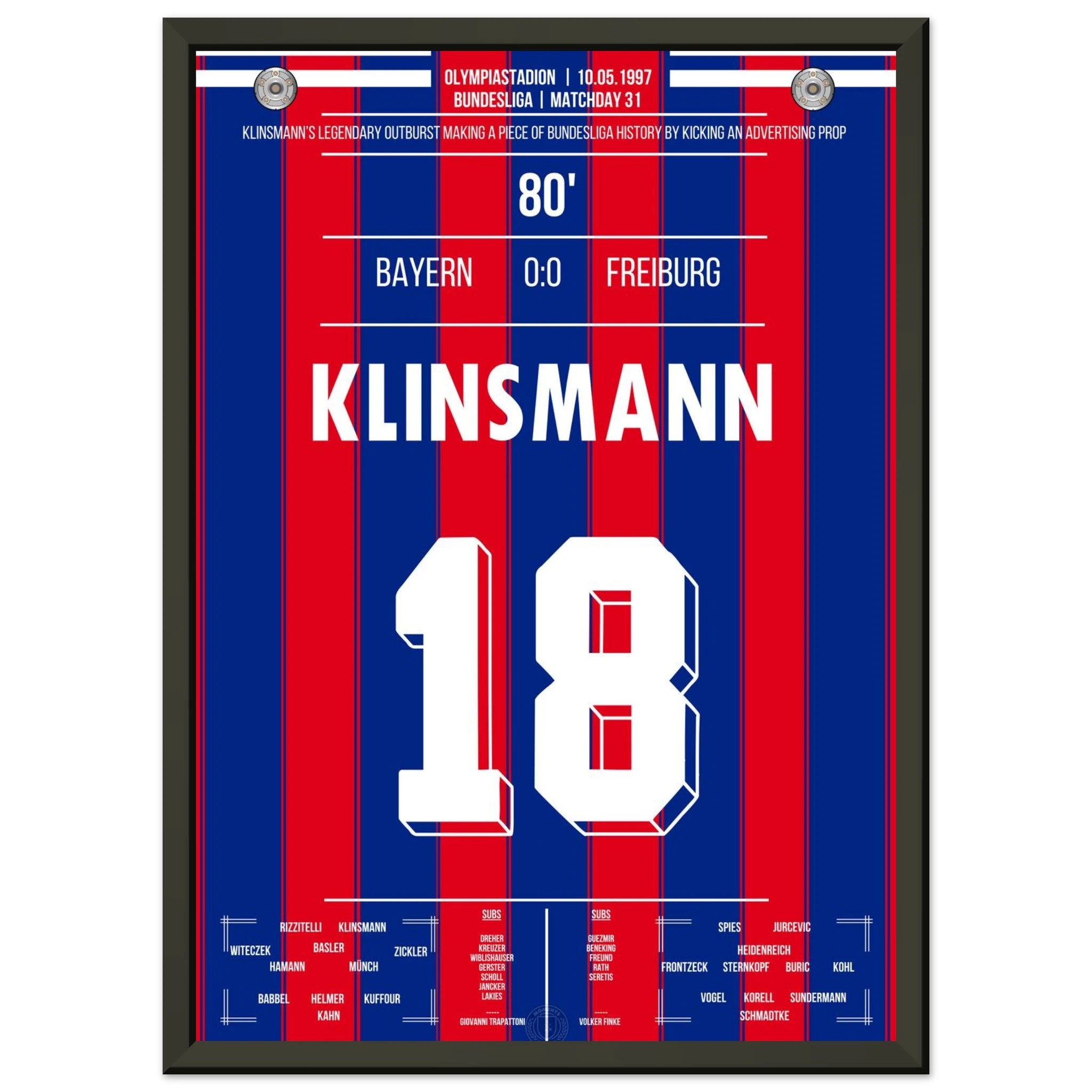 Ein torloses Remis mit legendärem Nachspiel: Nach seiner Auswechslung verliert Jürgen Klinsmann die Nerven und tritt wutentbrannt gegen eine Werbetonne – ein ikonischer Moment zwischen Frust und Leidenschaft.