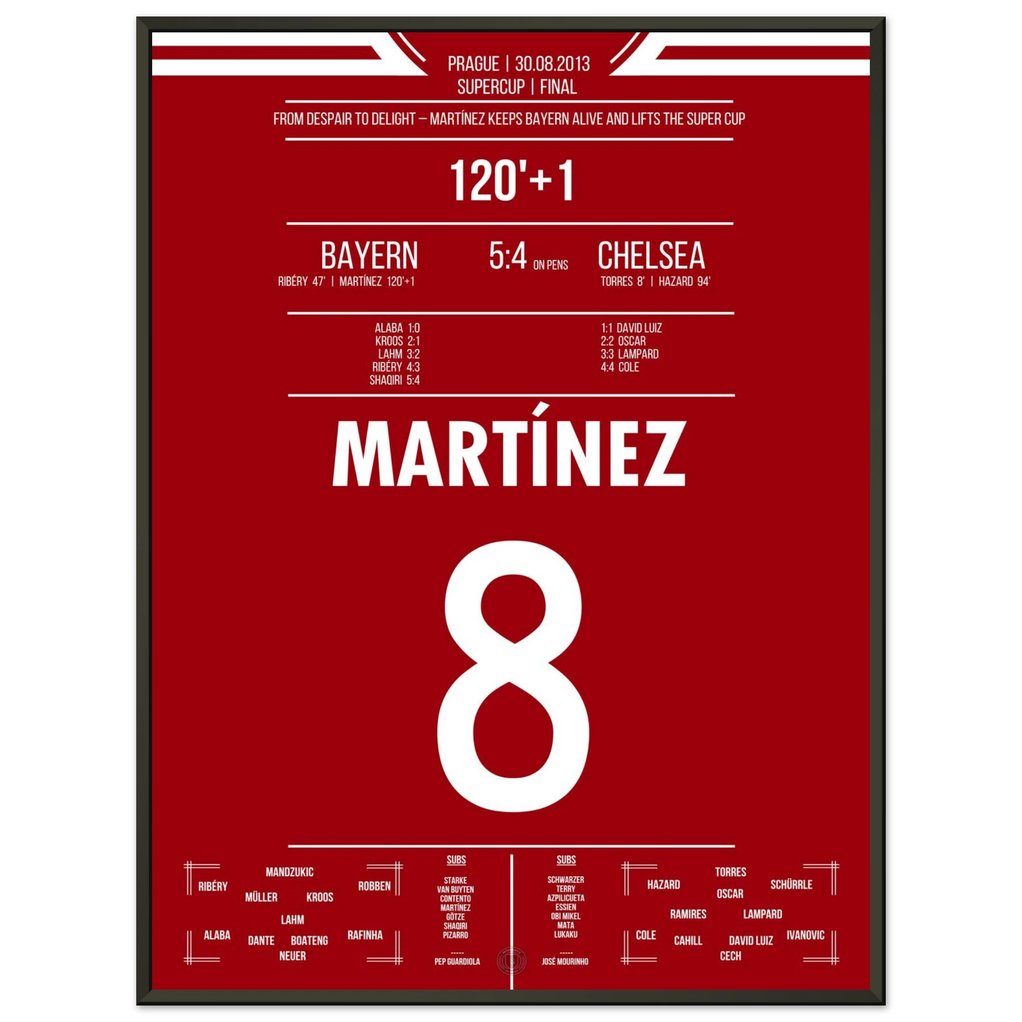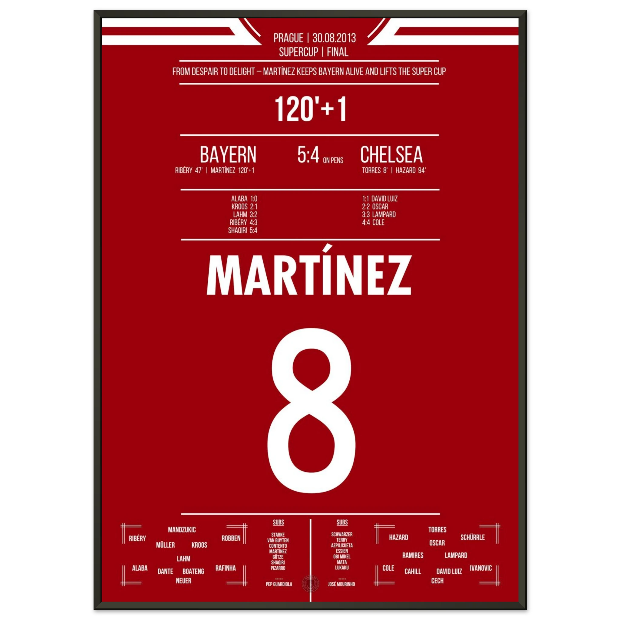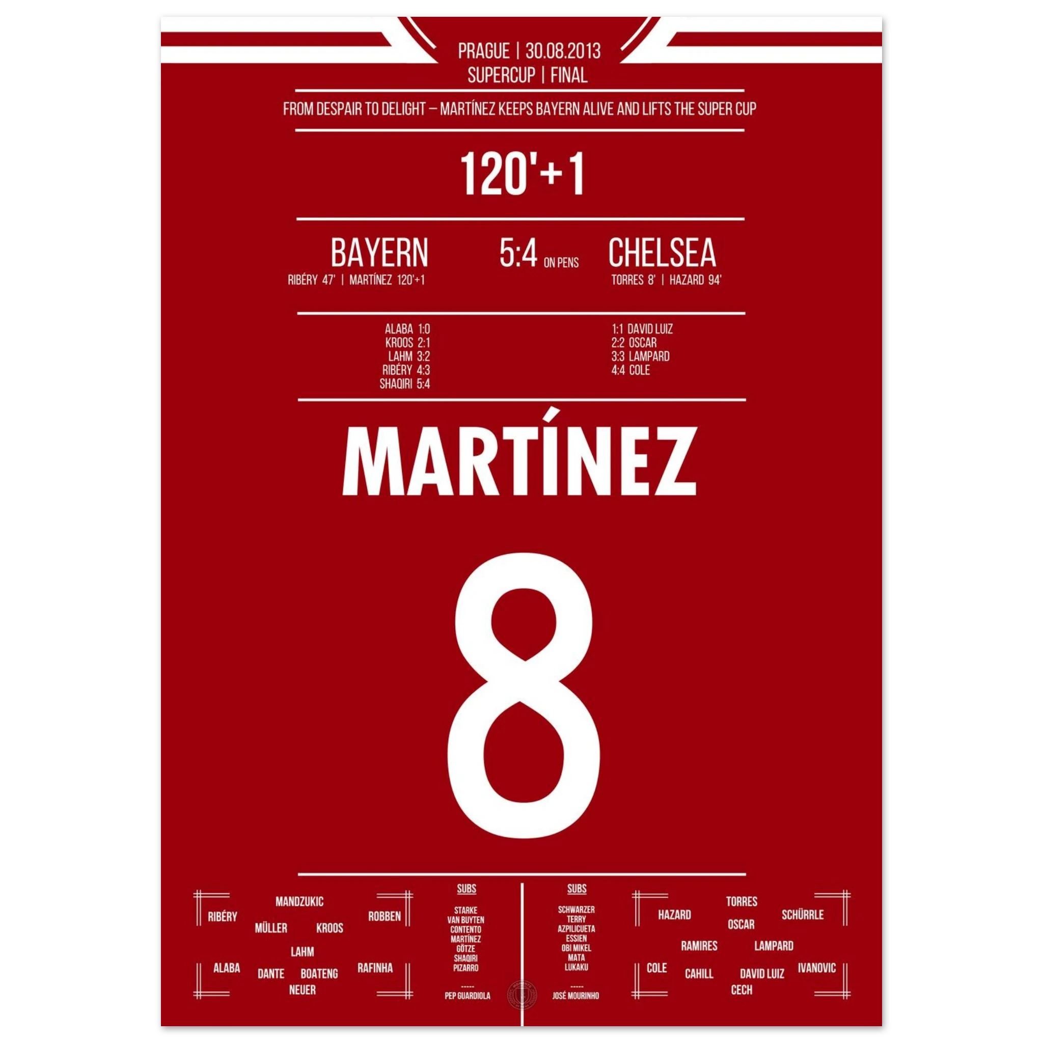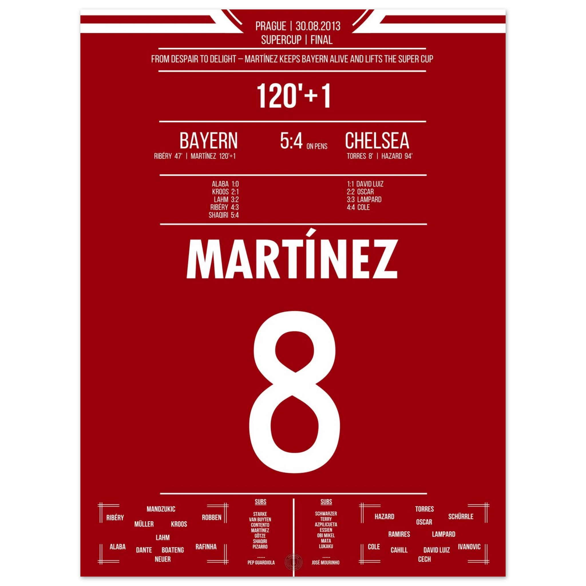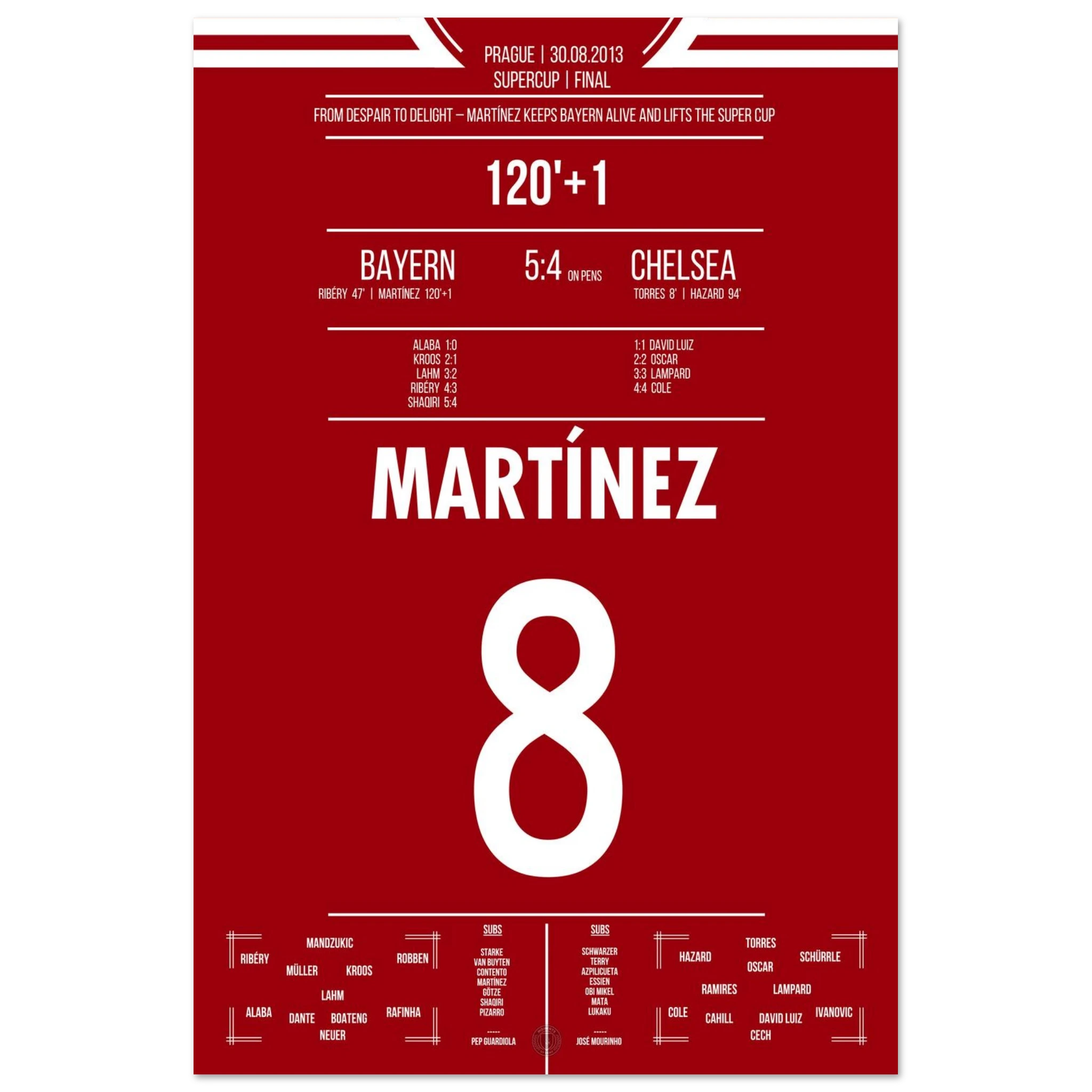 Im europäischen Supercup sorgt Javi Martínez in der 121. Minute für Ekstase: Mit seinem Treffer in der Nachspielzeit der Verlängerung rettet er München ins Elfmeterschießen. Dort behalten die Roten die Nerven und sichern sich den Titel gegen Chelsea.