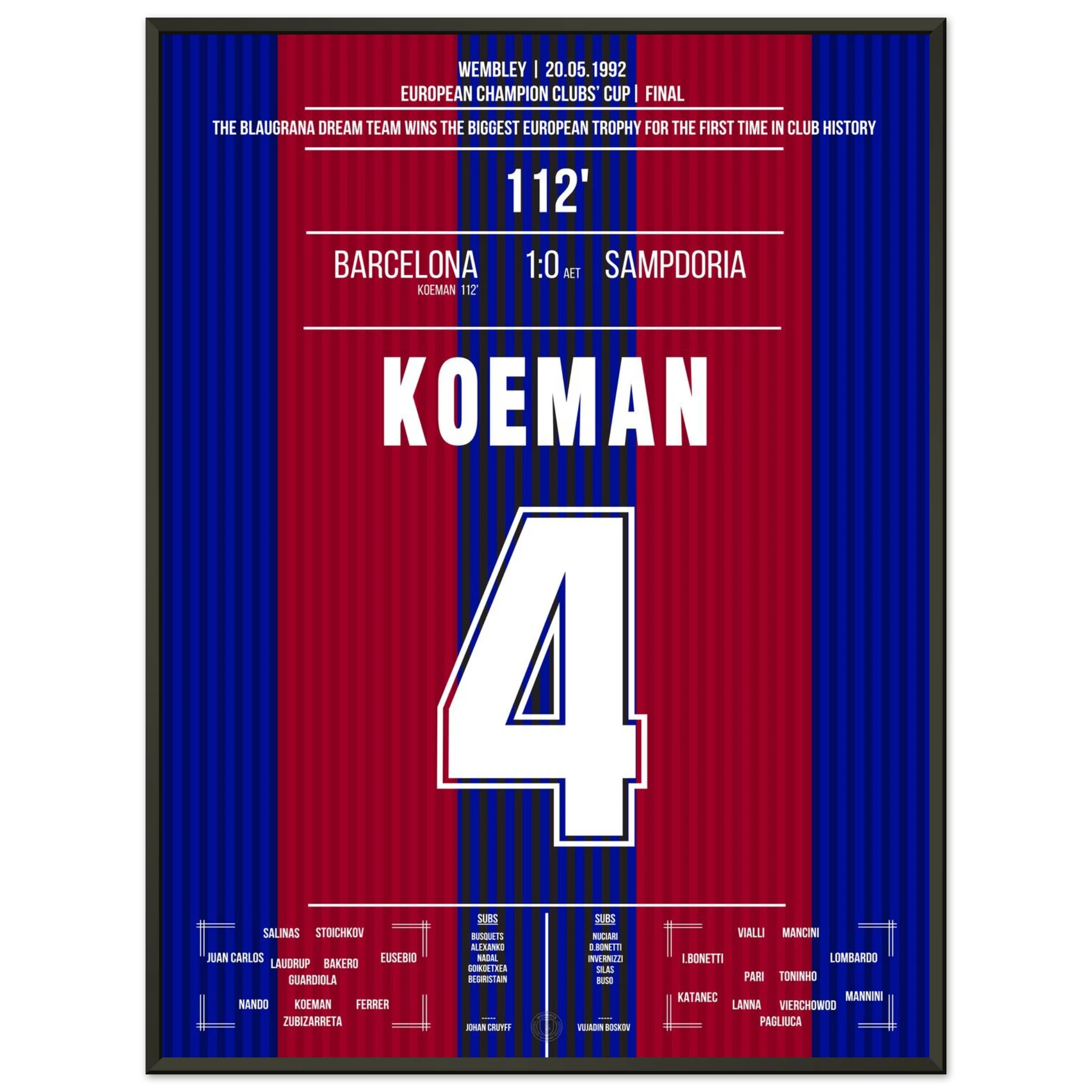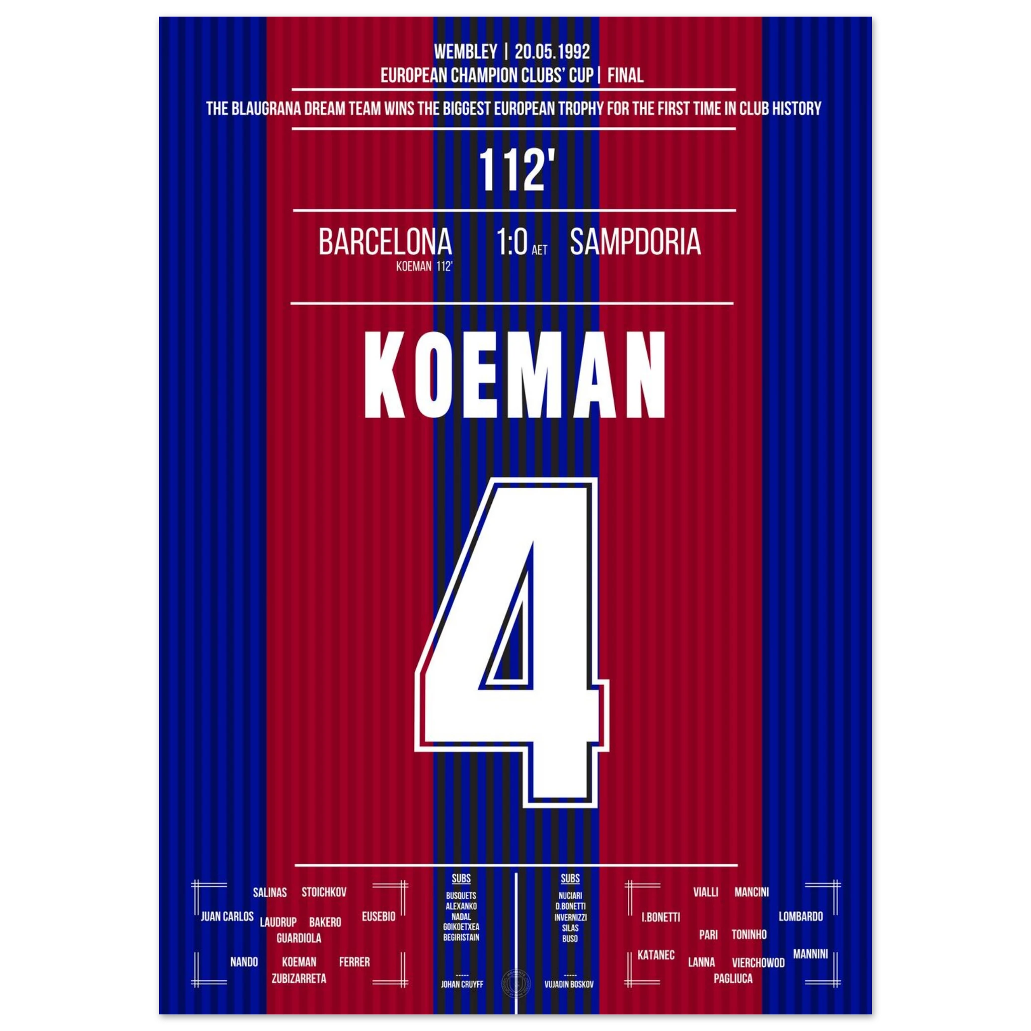 Im Wembley-Stadion trifft Ronald Koeman in der 112. Minute per brachialem Freistoß zum 1:0-Sieg gegen Sampdoria – und schenkt Barcelona den ersten Europapokal der Landesmeister der Vereinsgeschichte. Ein historischer Schlag, ein ewiger Moment.