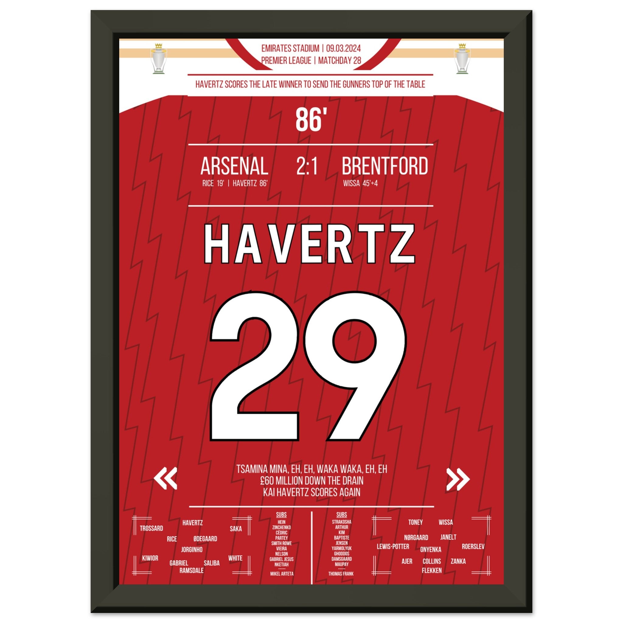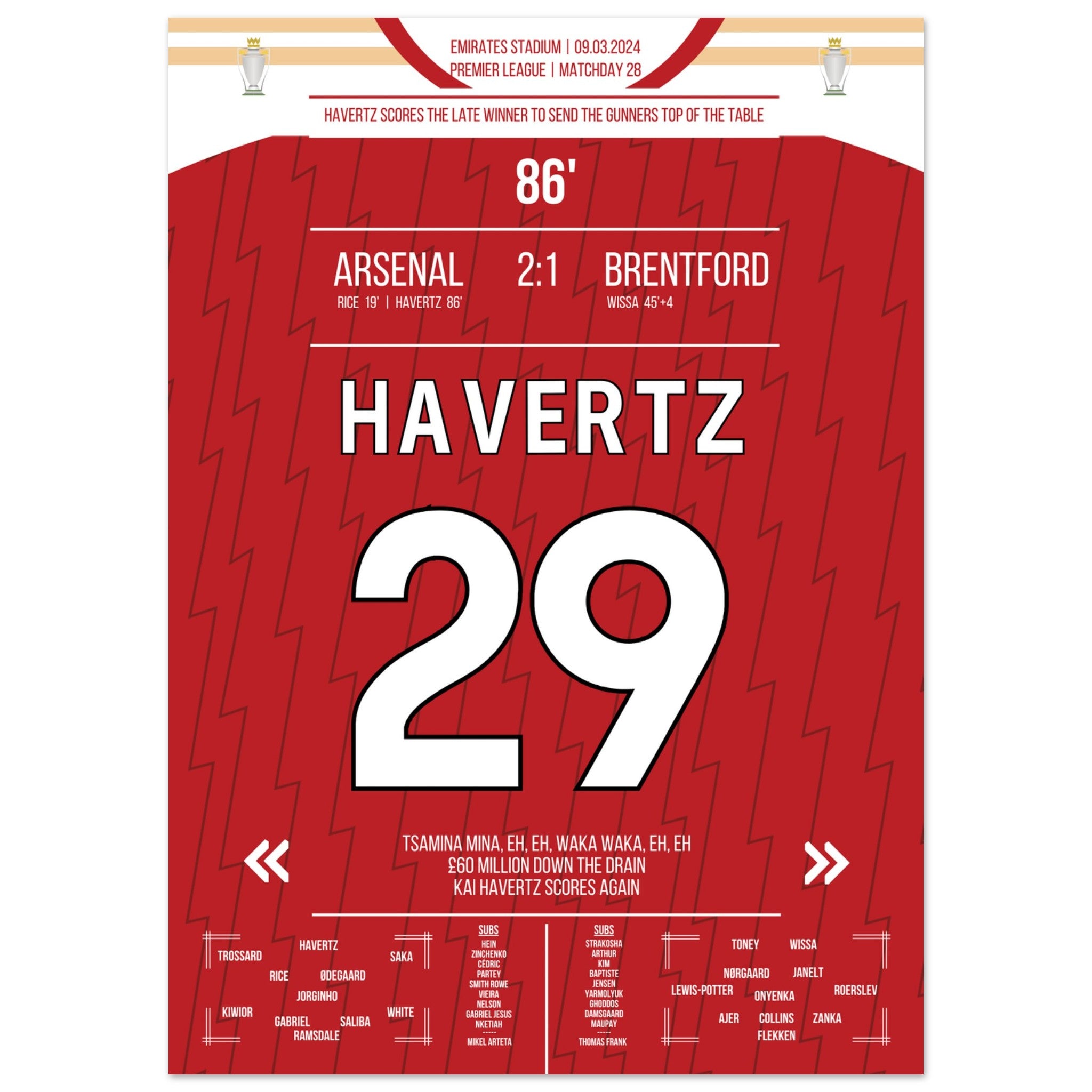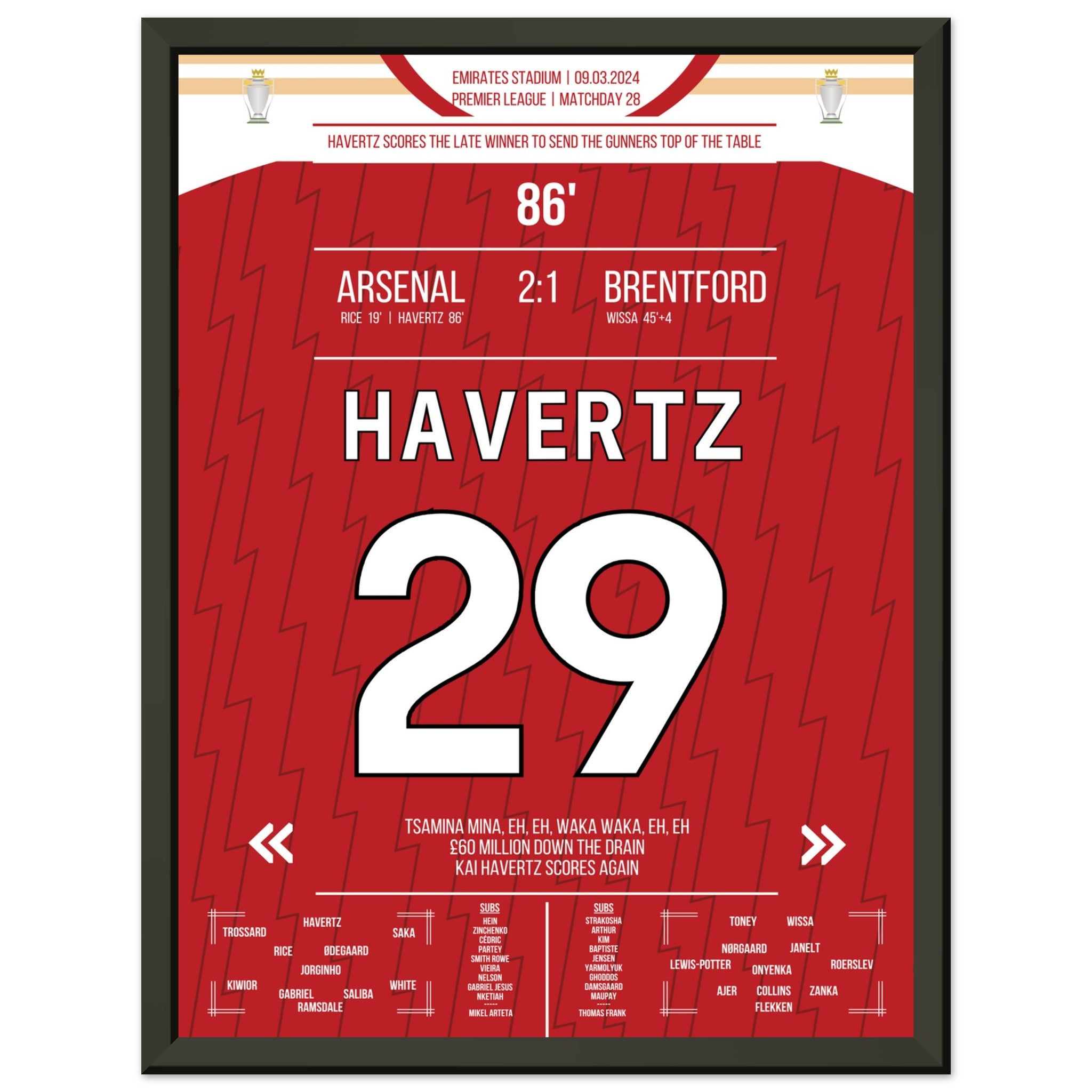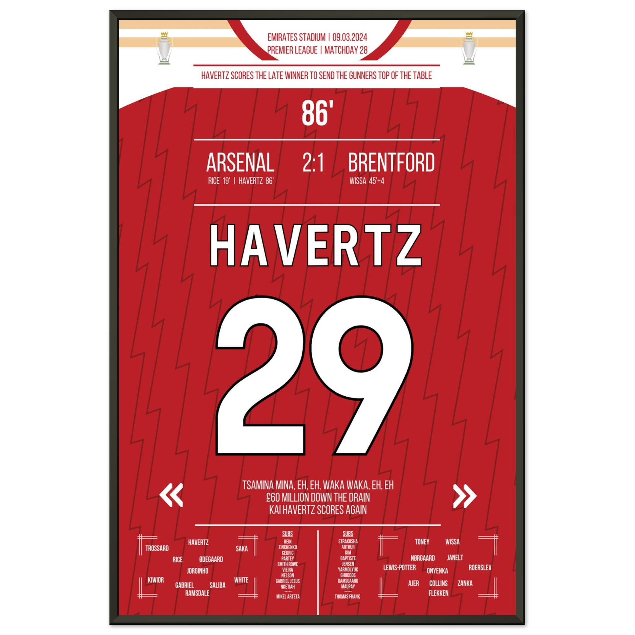 Havertz scores the Gunners a late winning goal to the top of the table.