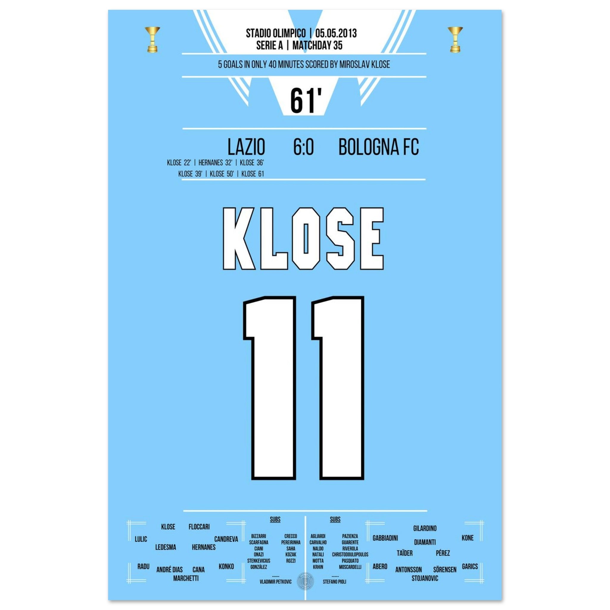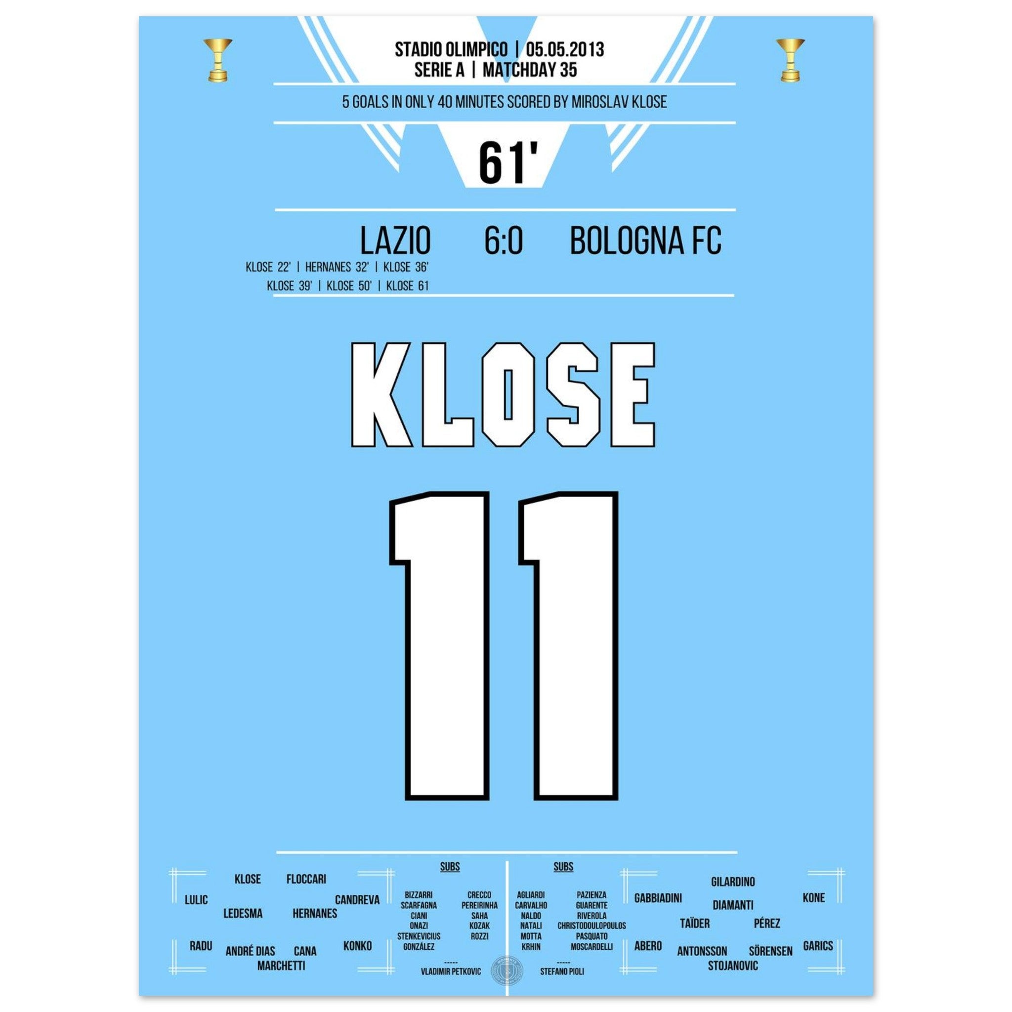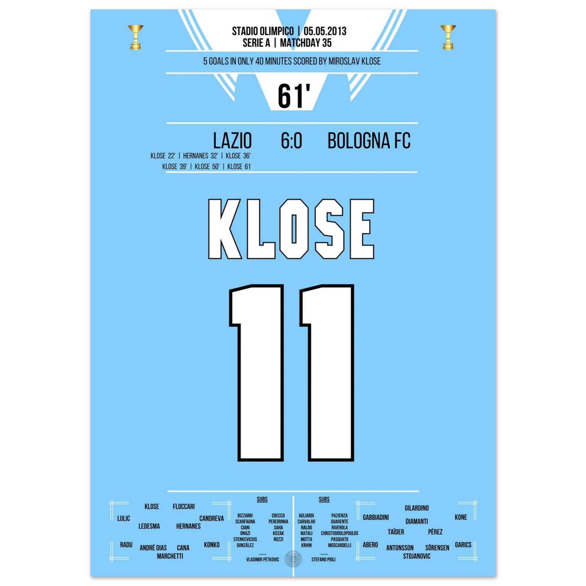 Klose scores a historic five-goal haul against Bologna single-handedly.