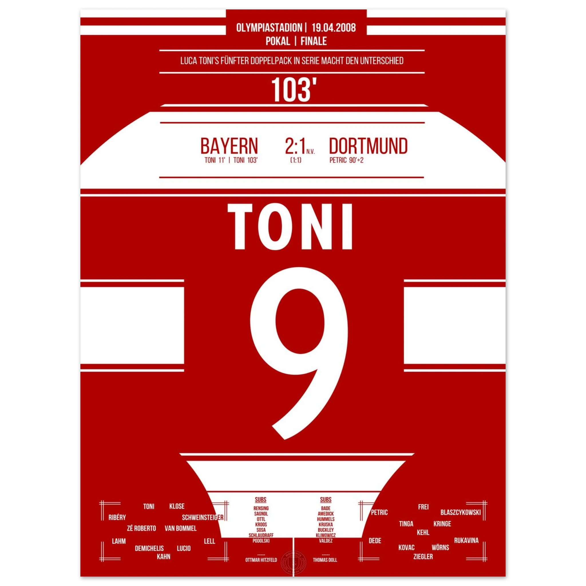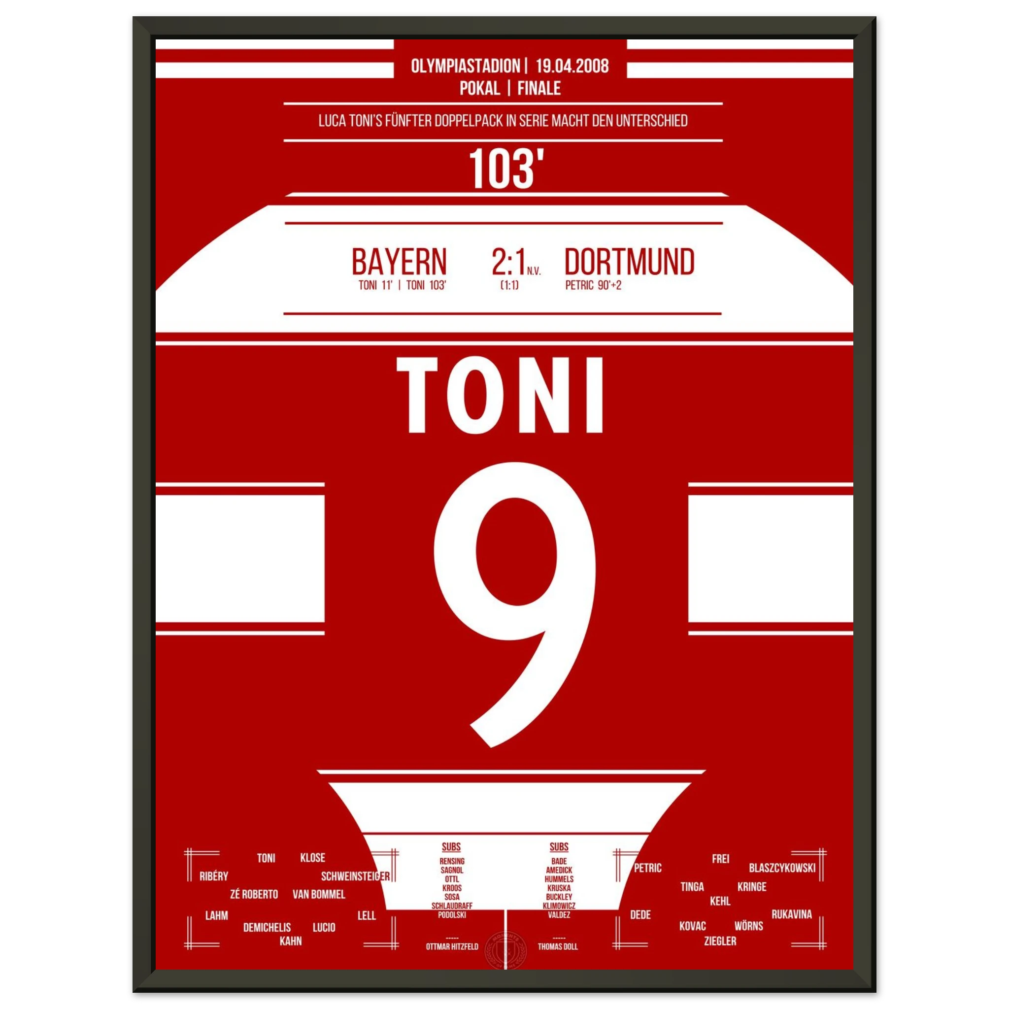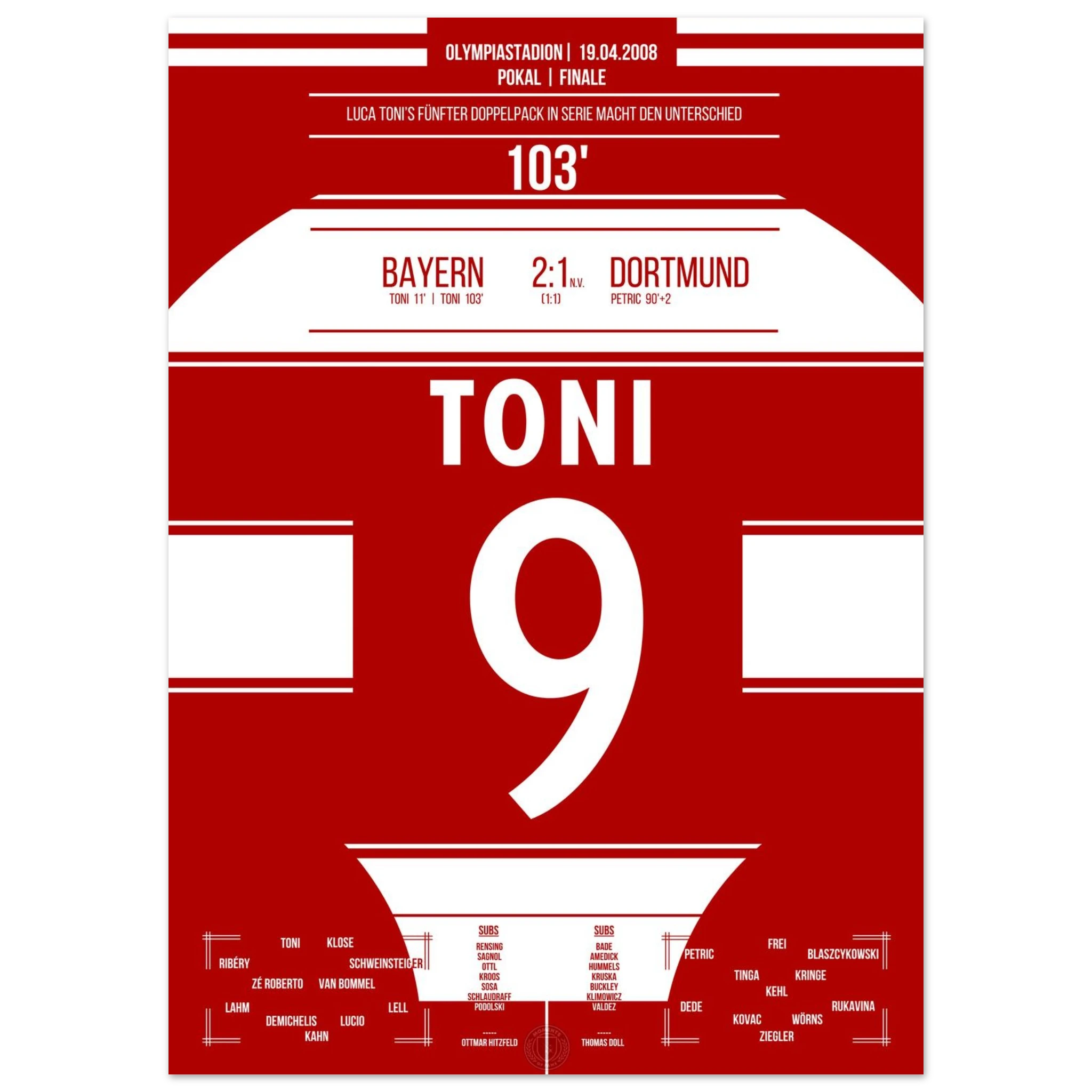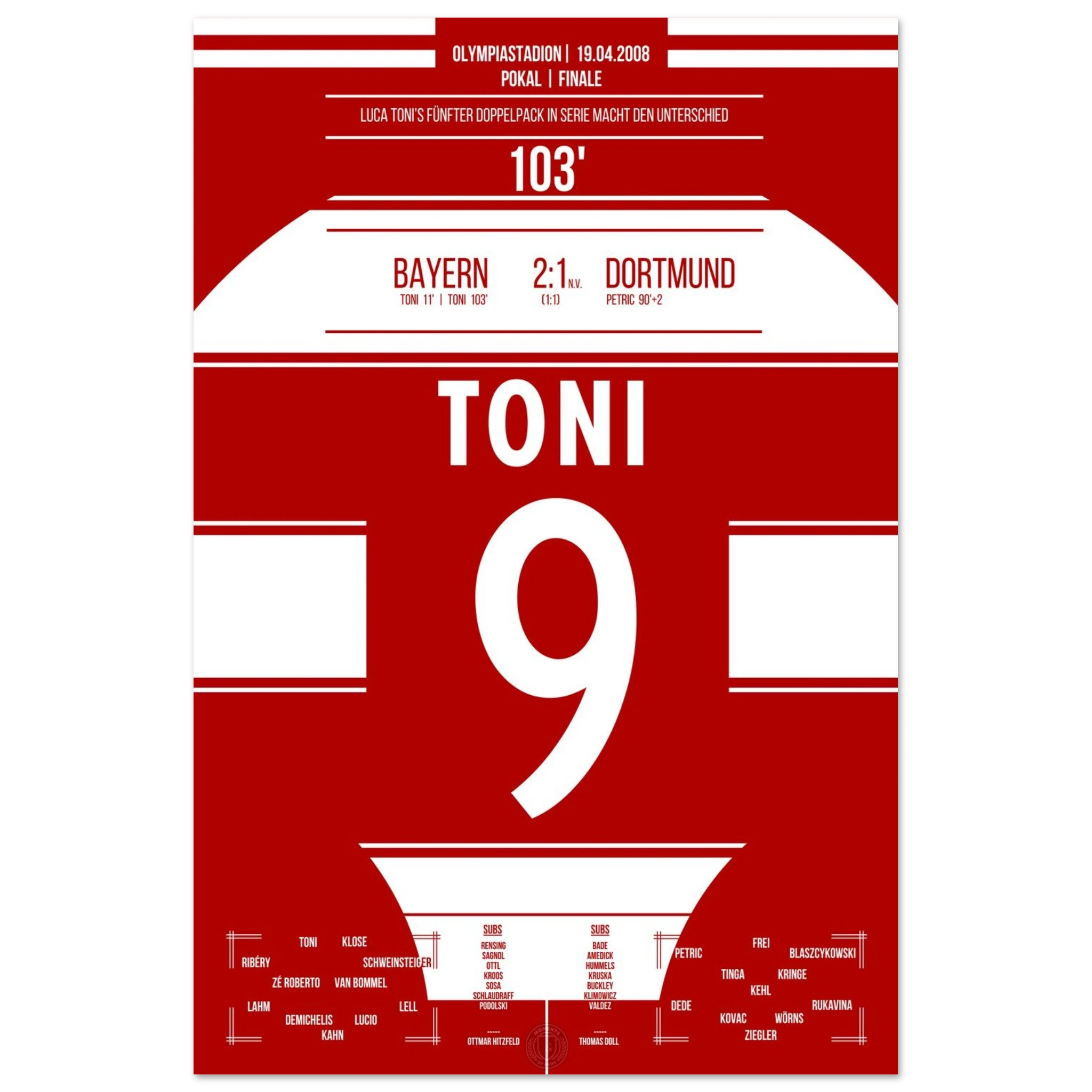 Im packenden Pokalfinale liefert Dortmund den Bayern einen großen Kampf. Nach dem späten Ausgleich durch Petrić geht es in die Verlängerung – dort entscheidet Luca Toni in der 103. Minute die Partie.