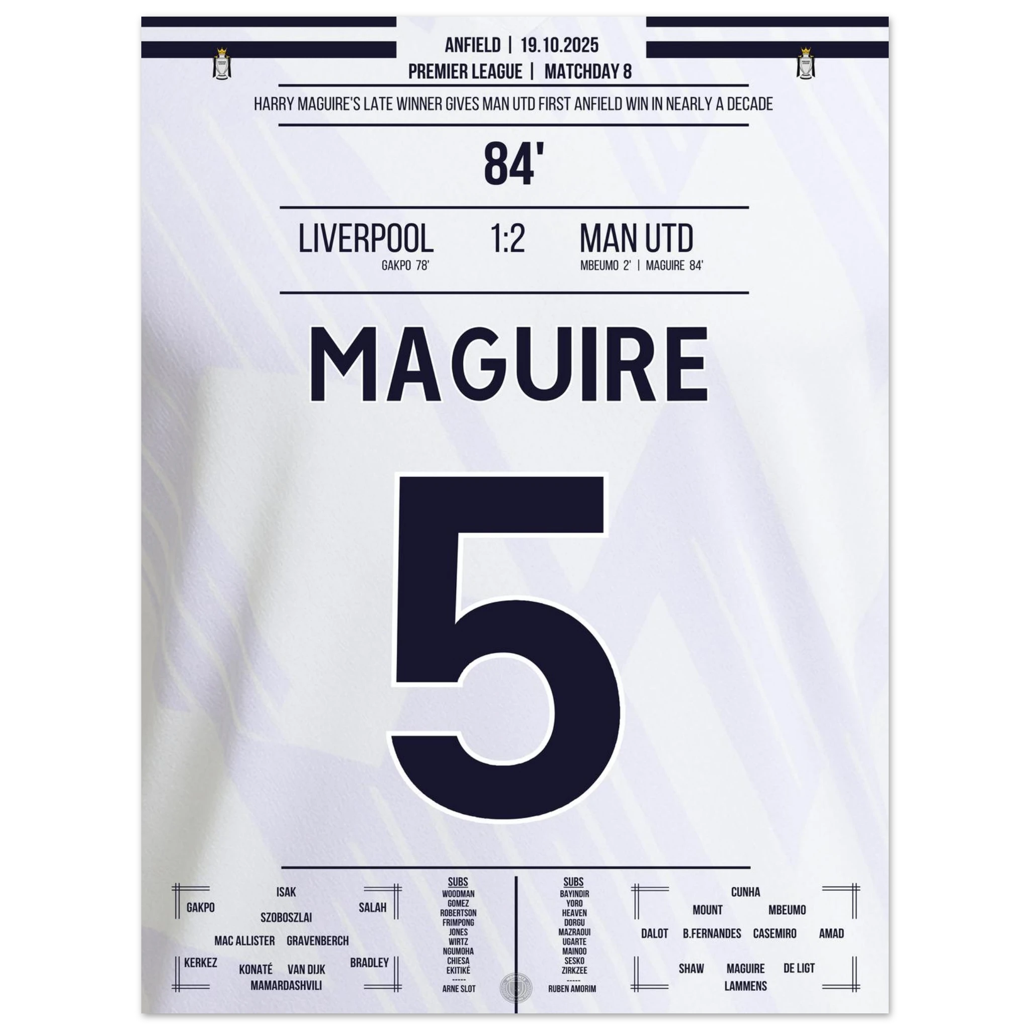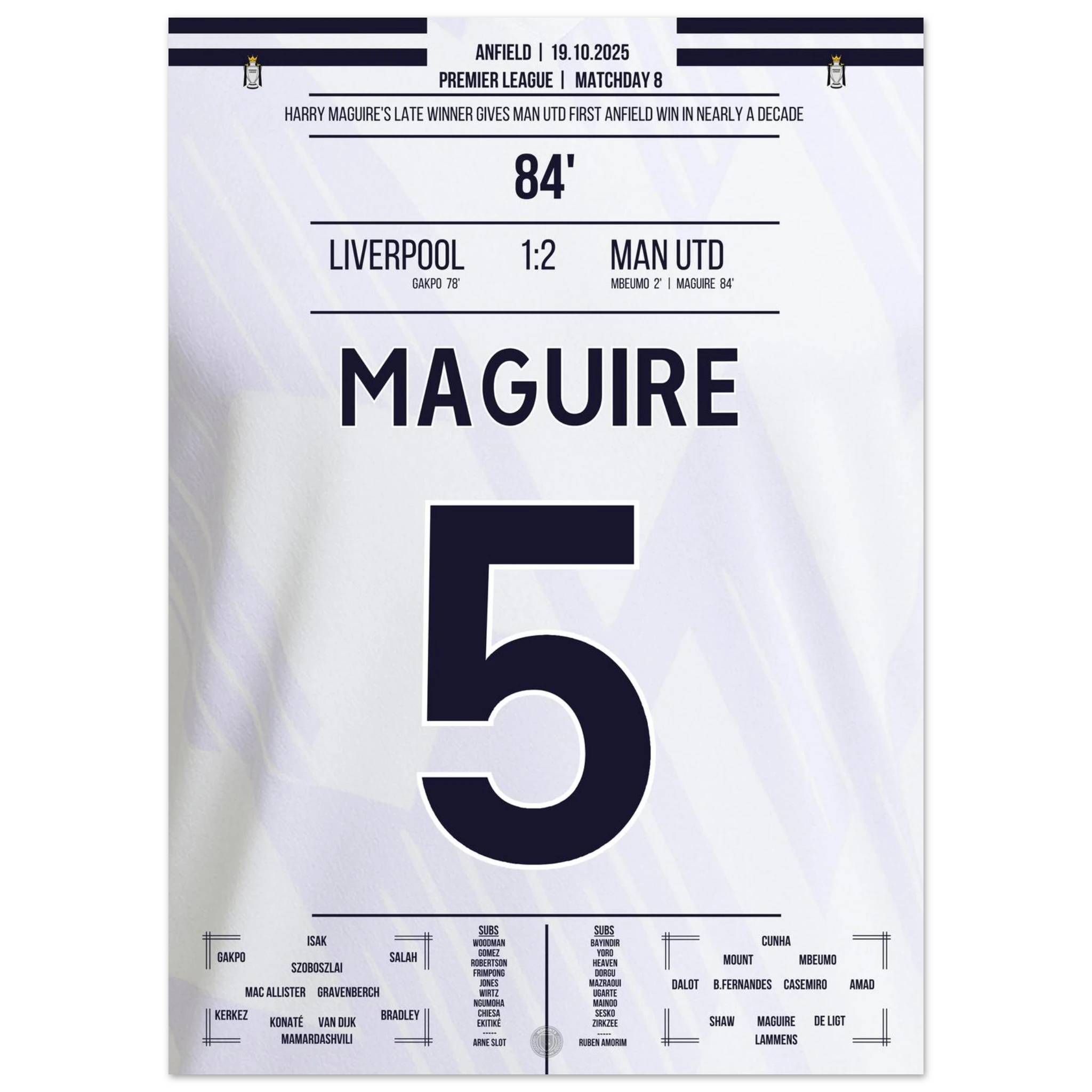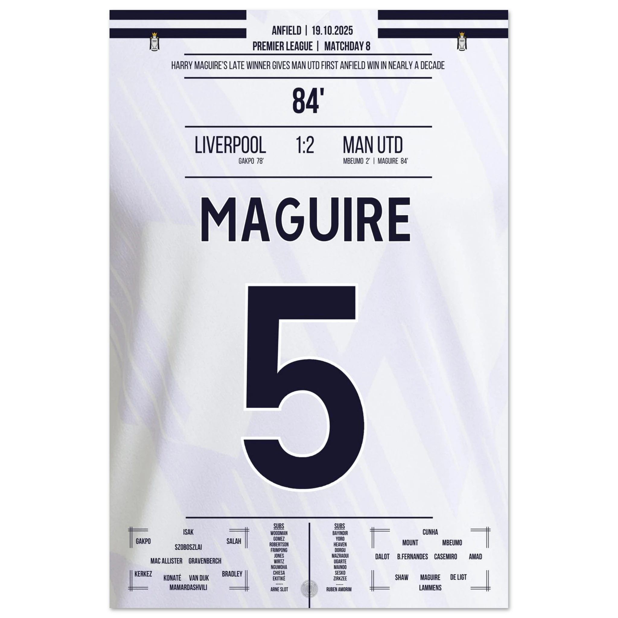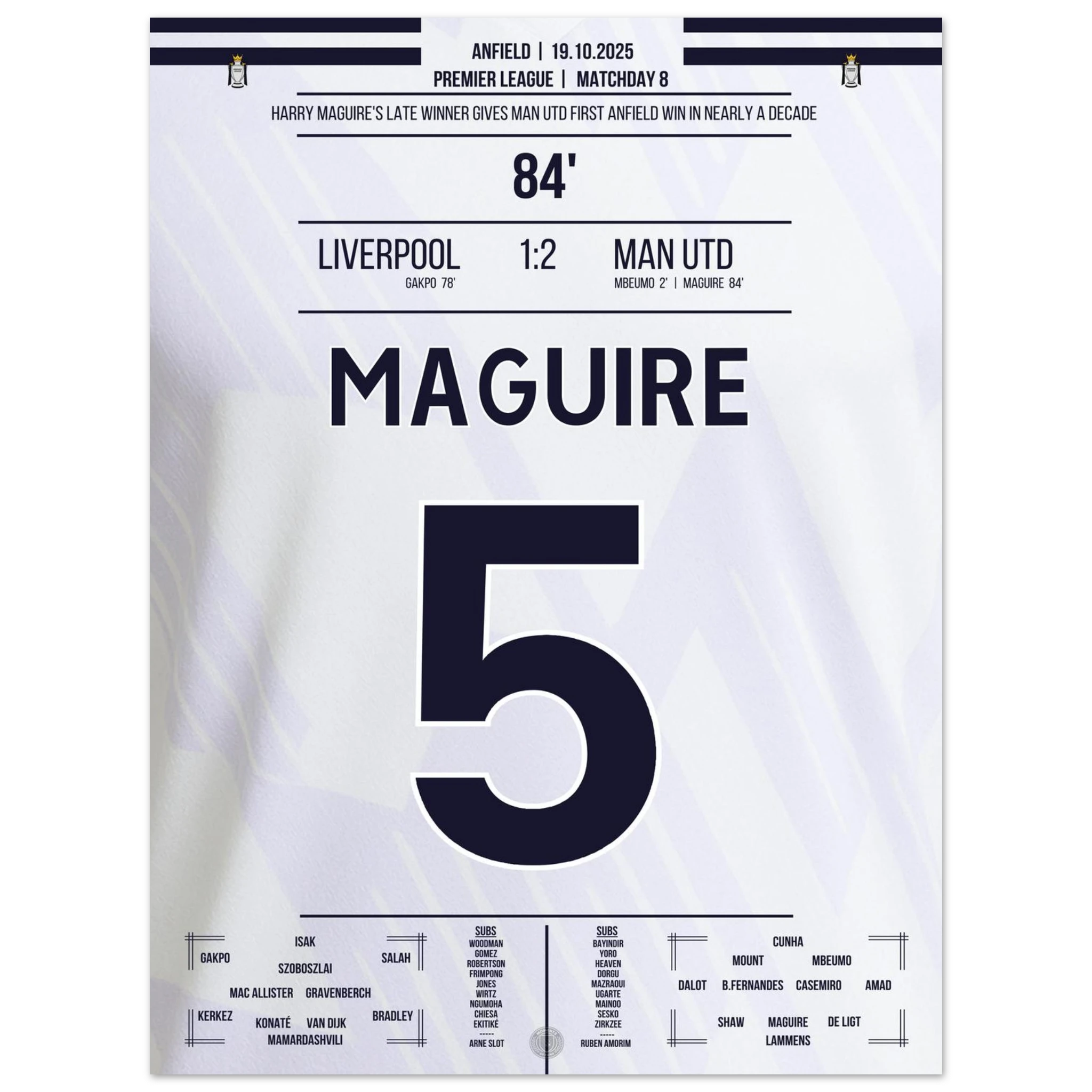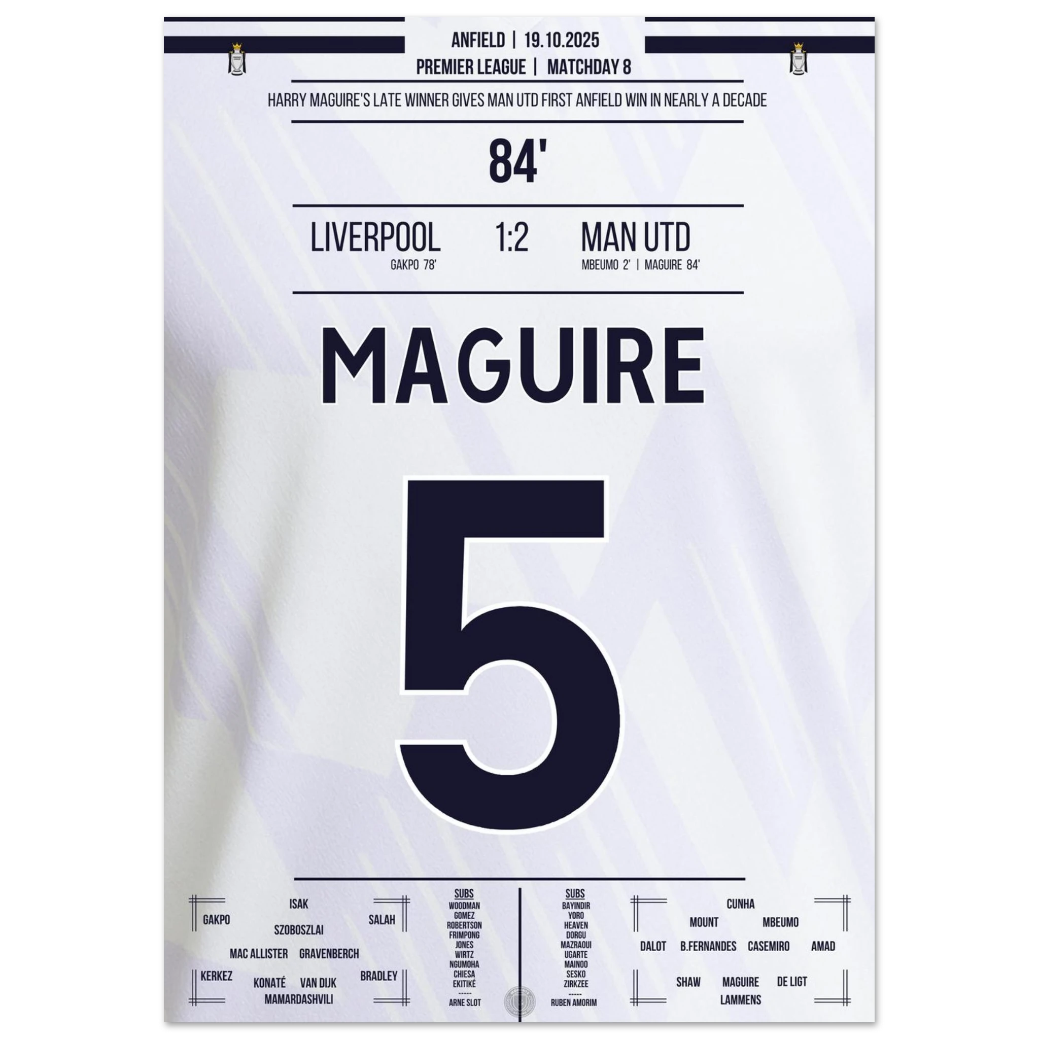 Unser Poster hält diesen historischen Moment fest – Kopfball, Kopf von Maguire, Triumph über Anfield.