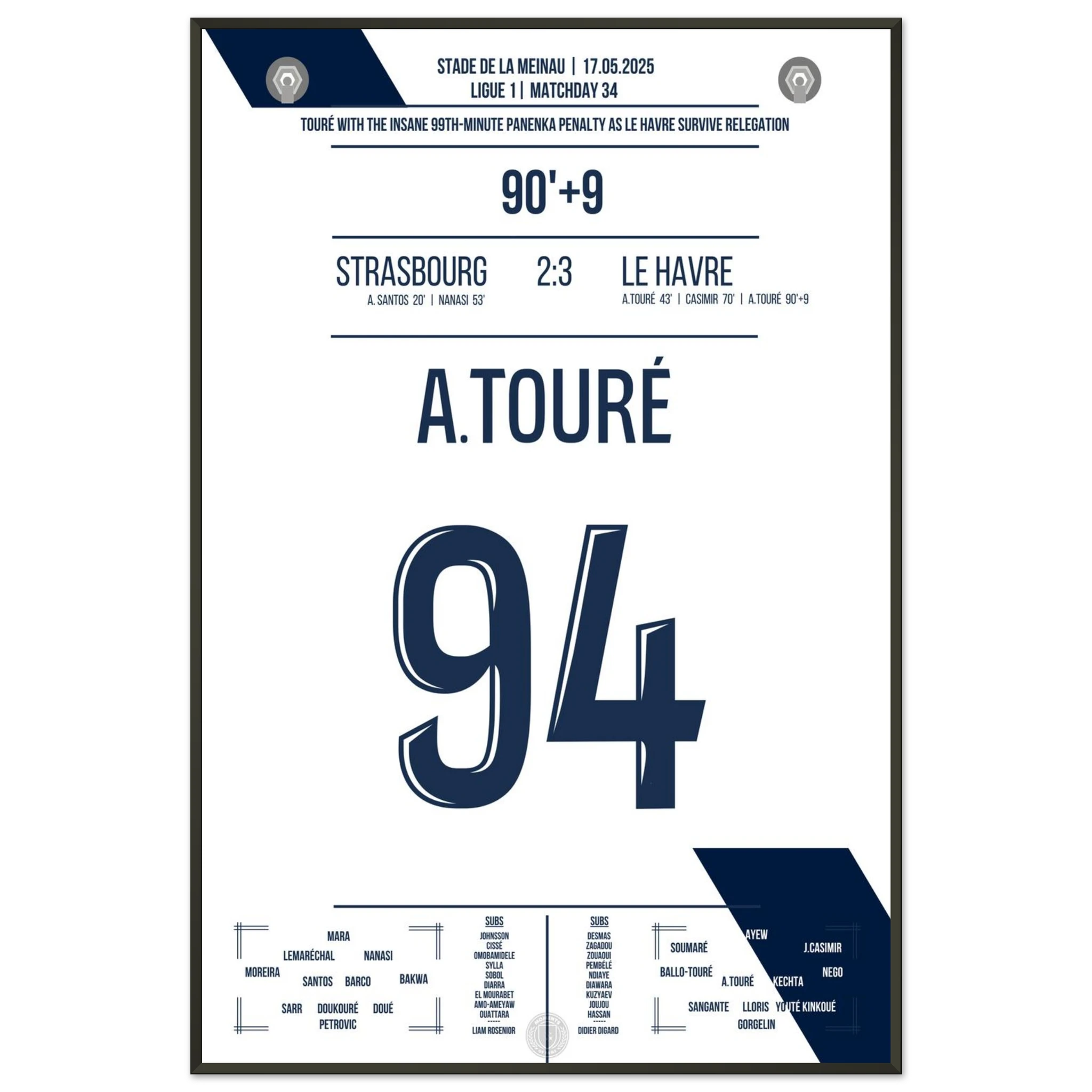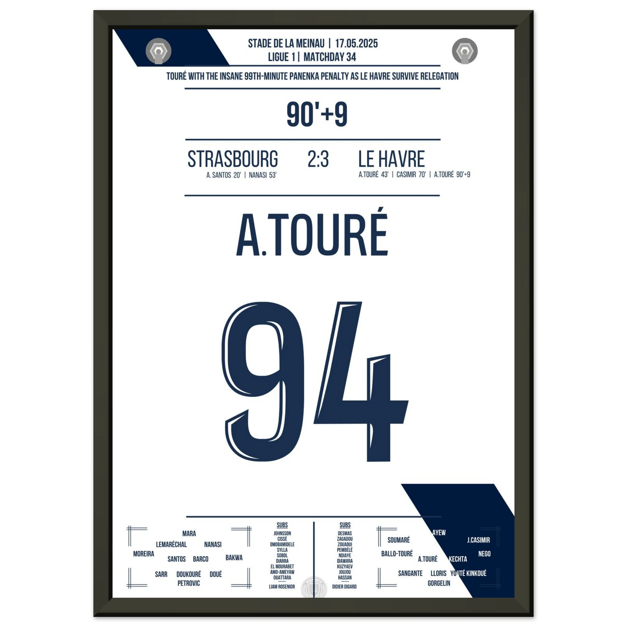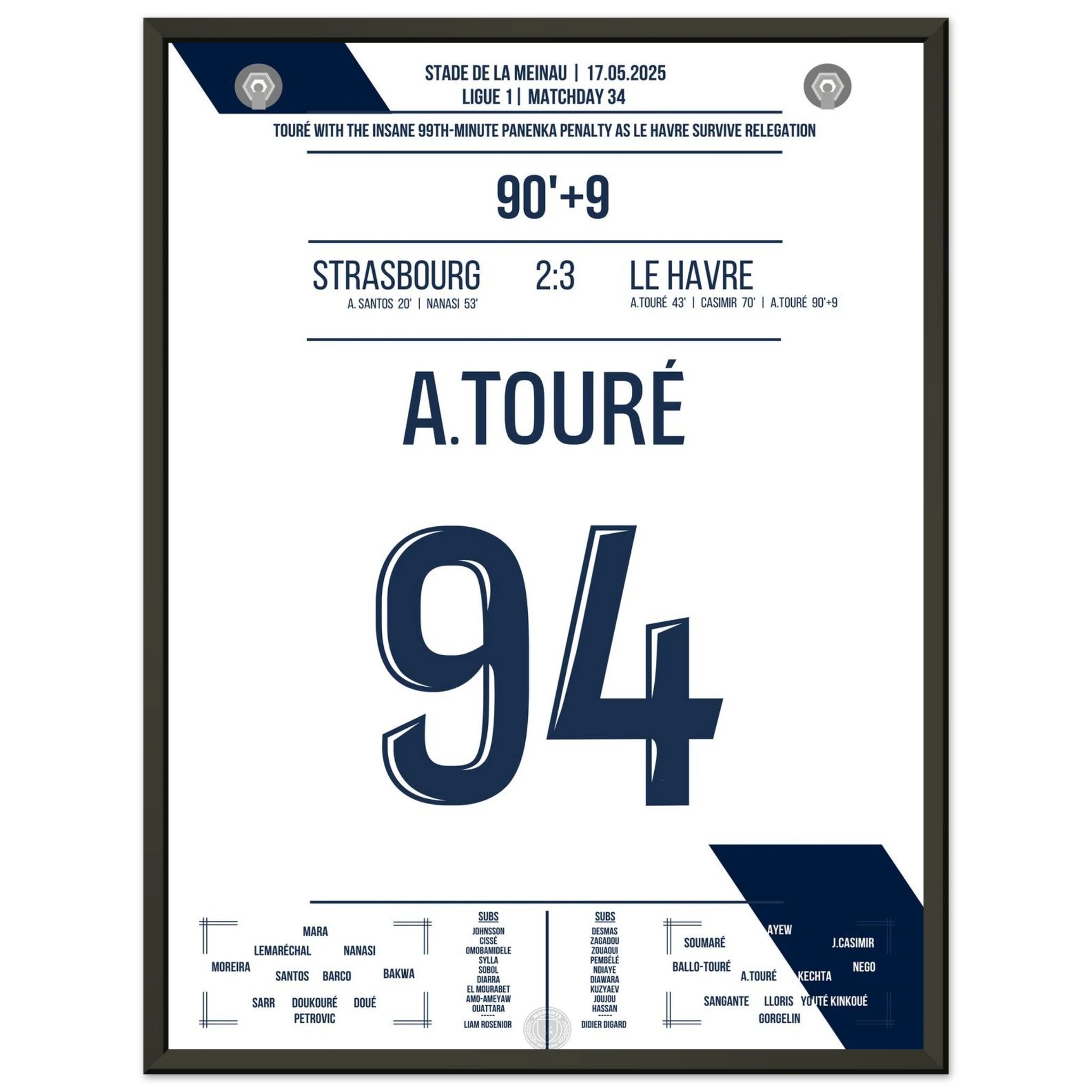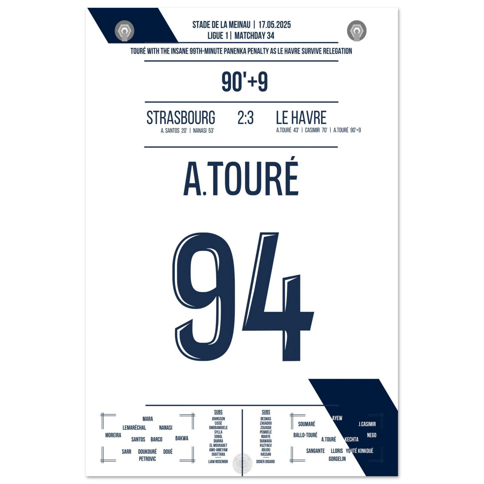17. Mai 2025 – Strasbourg vs. Le Havre 2:3: In einem atemberaubenden Abstiegskrimi sorgt Touré in der 99. Minute für den Schockmoment im Stade de la Meinau. Sein Last-Minute Elfmeter im Panenka-Stil sichert Le Havre den Klassenerhalt – und schreibt sich in die Geschichtsbücher ein. Unser Poster fängt diesen dramatischen Schlusspunkt in voller Emotion ein.