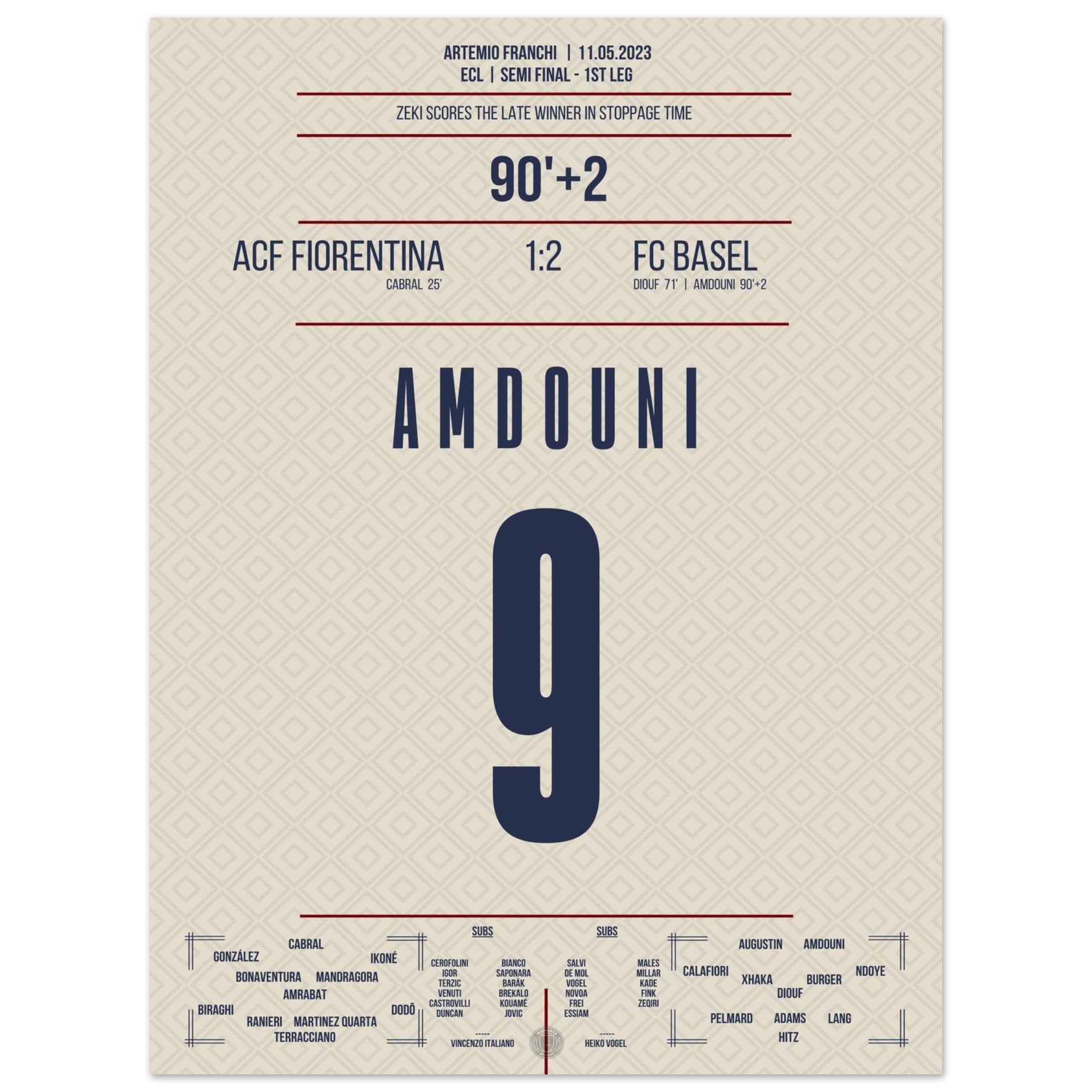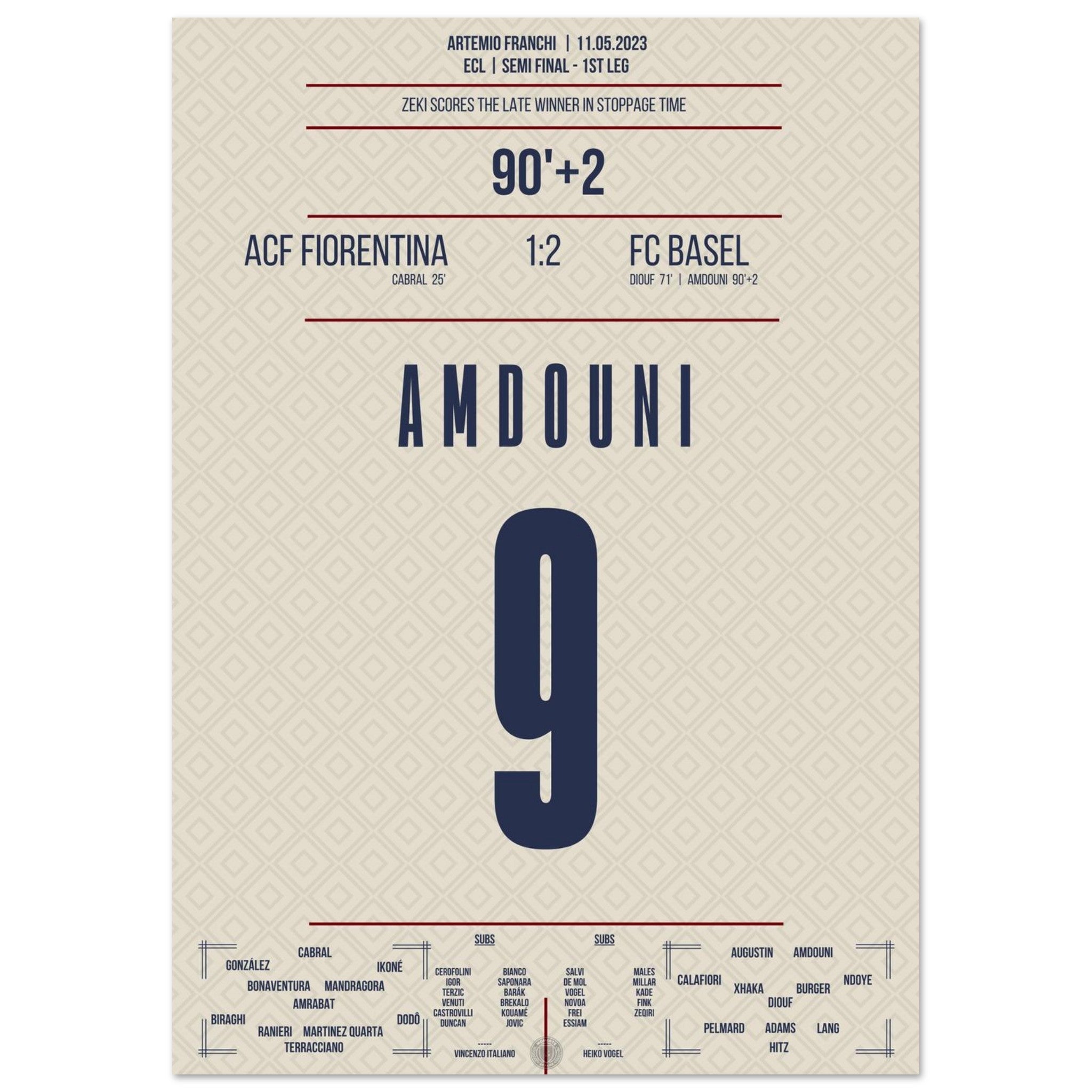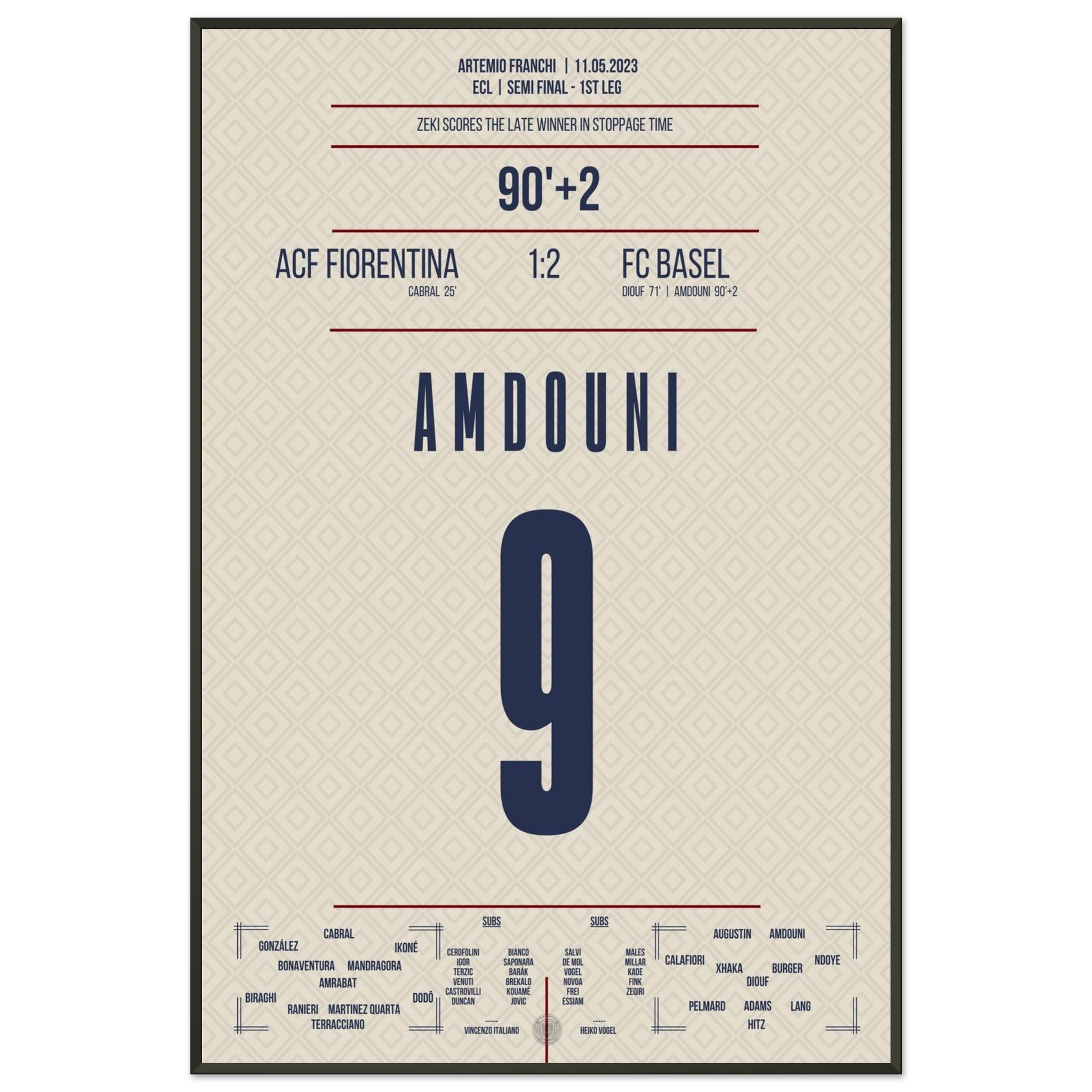 Zeki Amdouni scores in stoppage time to secure victory in the semifinal first leg against Fiorentina.