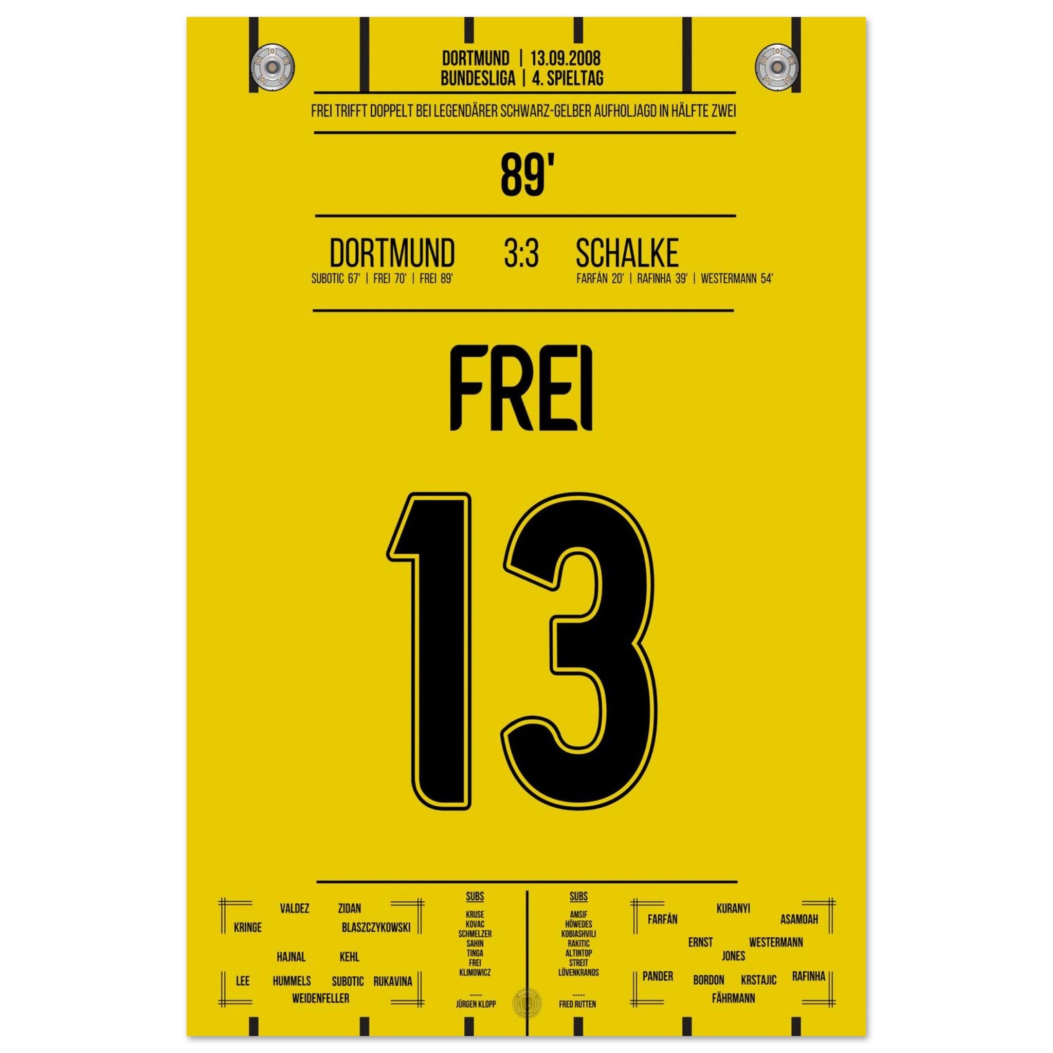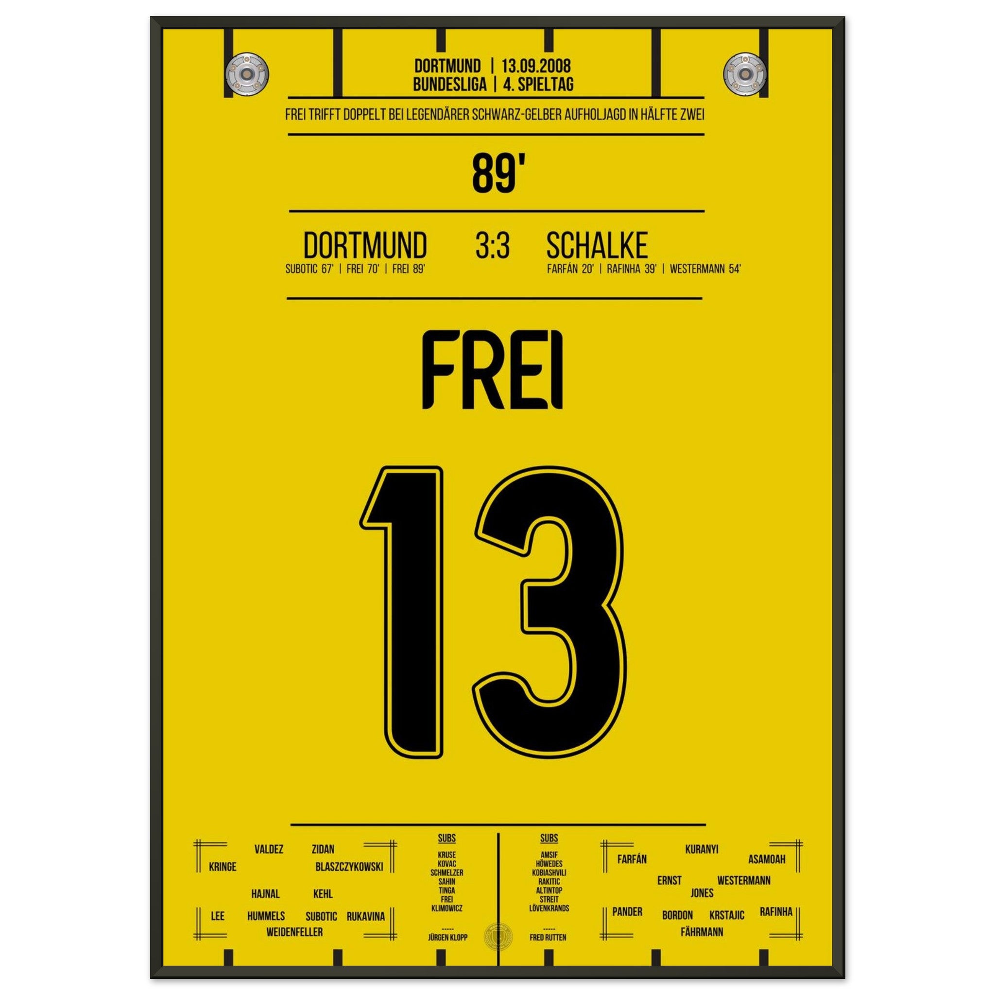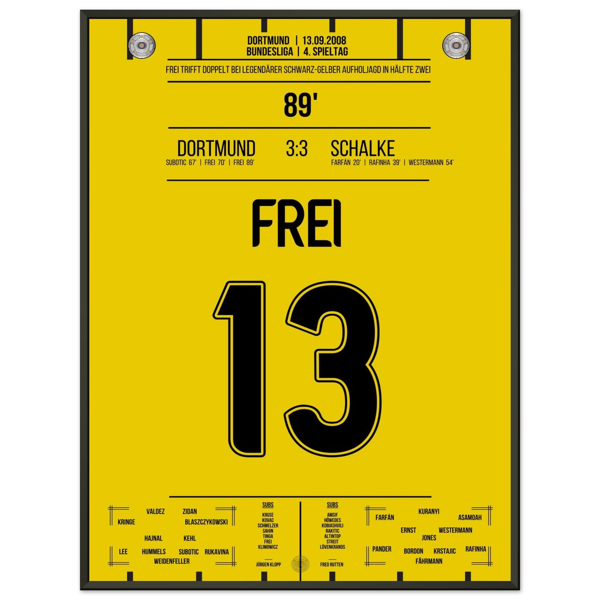 13. September 2008 – Dortmund vs. Schalke 3:3: Nach 0:3-Rückstand kämpft sich Dortmund im Derby mit Herz und Wahnsinn zurück – in der 89. Minute trifft Alex Frei zum umjubelten Ausgleich. Ein Derby für die Geschichtsbücher, eine Aufholjagd voller Leidenschaft. Unser Poster verewigt diesen magischen Moment in Schwarz-Gelb.