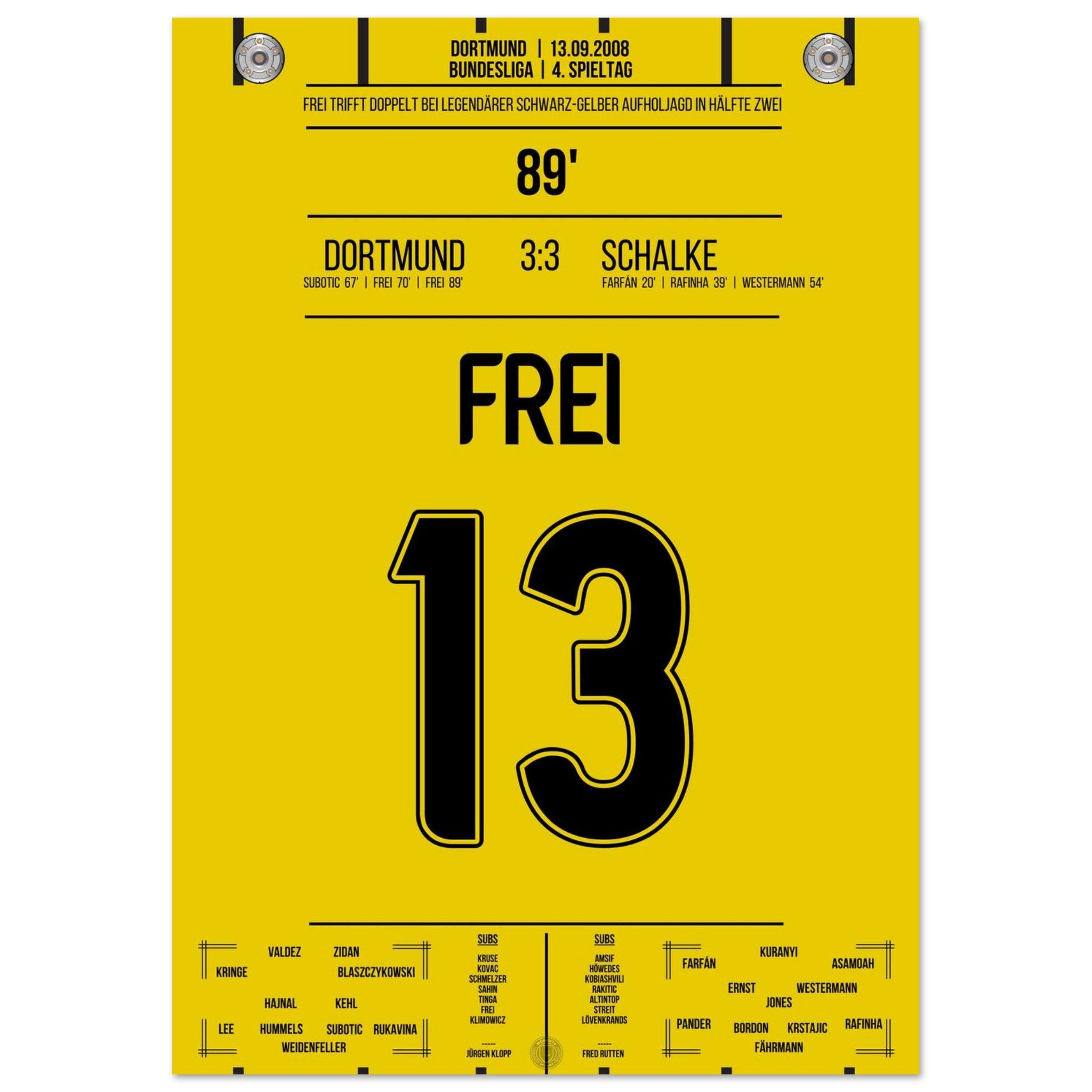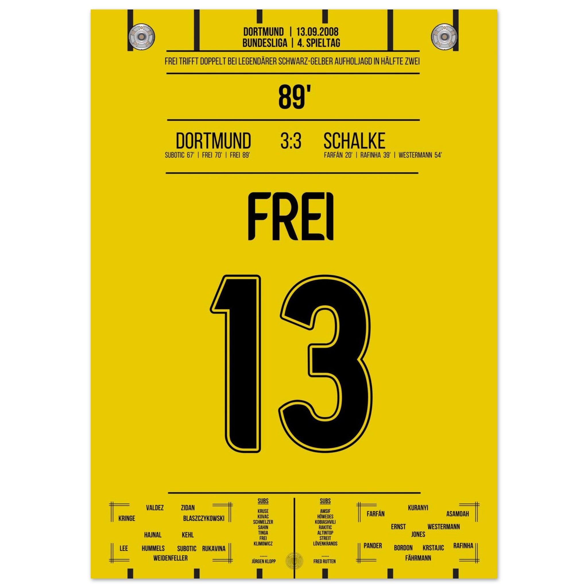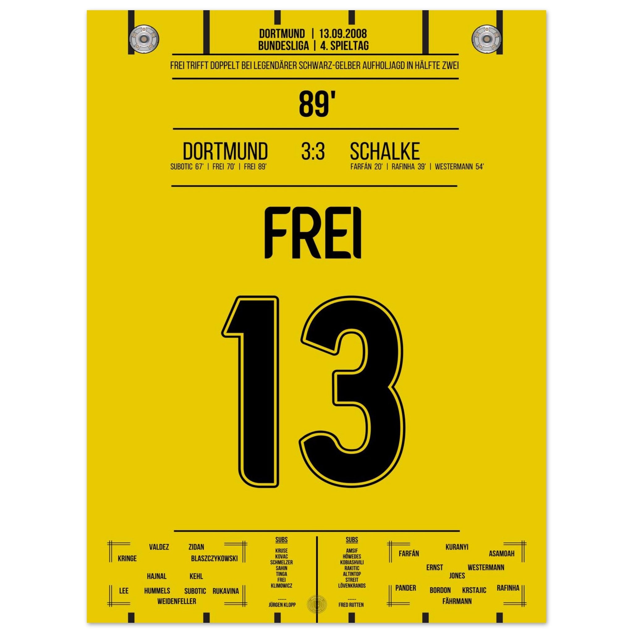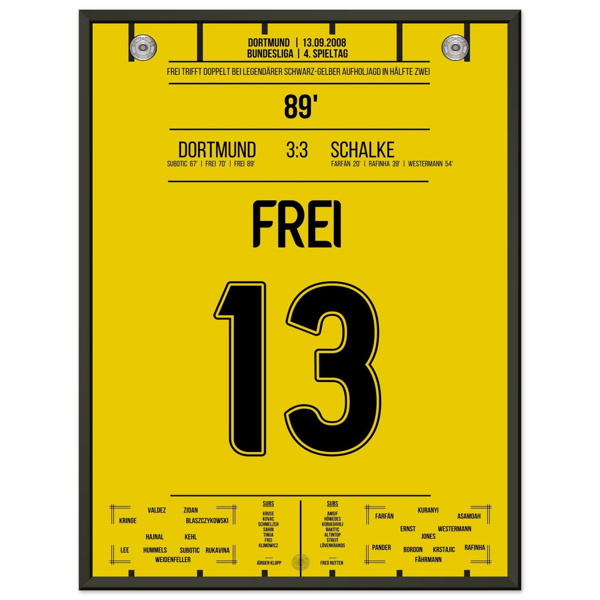 13. September 2008 – Dortmund vs. Schalke 3:3: Nach 0:3-Rückstand kämpft sich Dortmund im Derby mit Herz und Wahnsinn zurück – in der 89. Minute trifft Alex Frei zum umjubelten Ausgleich. Ein Derby für die Geschichtsbücher, eine Aufholjagd voller Leidenschaft. Unser Poster verewigt diesen magischen Moment in Schwarz-Gelb.