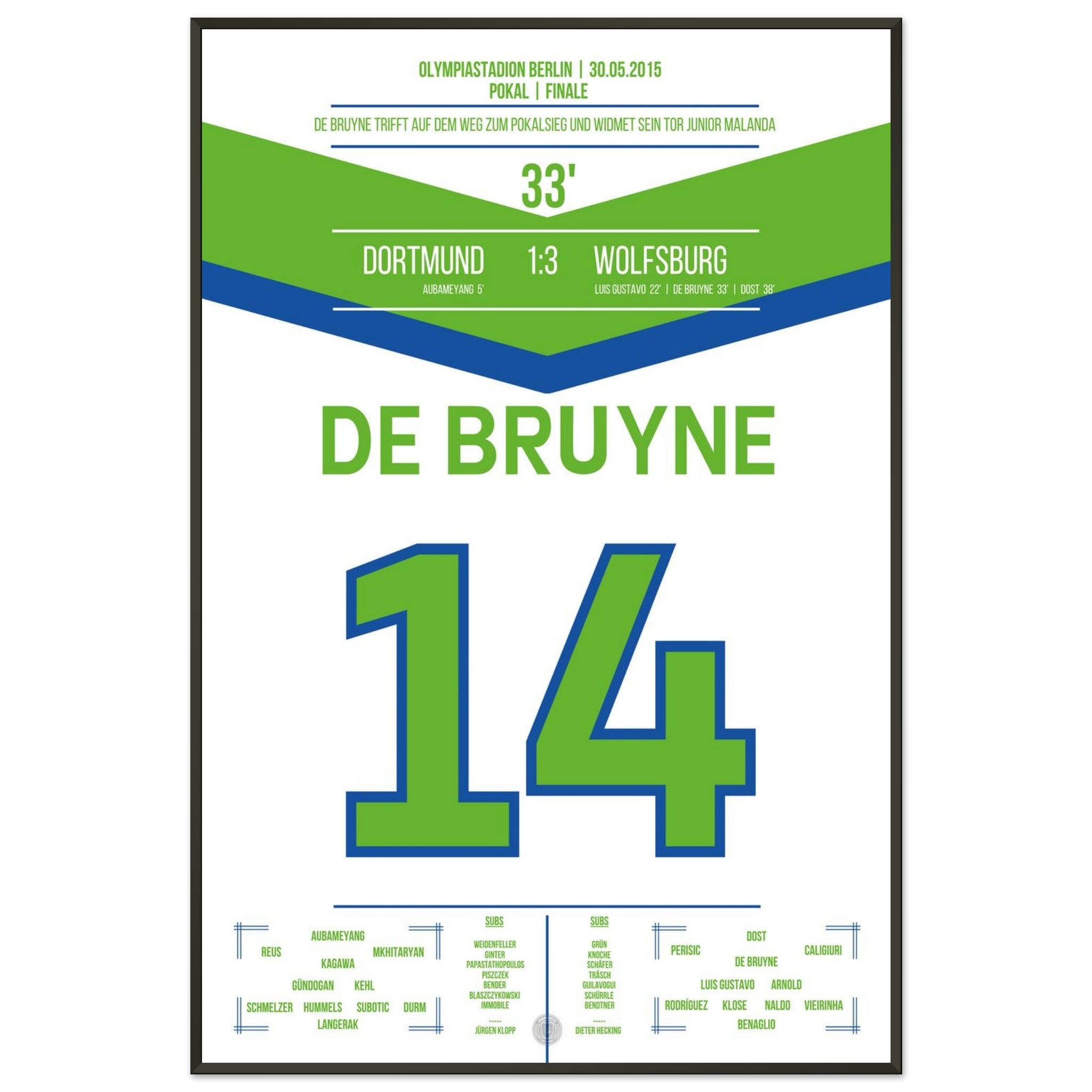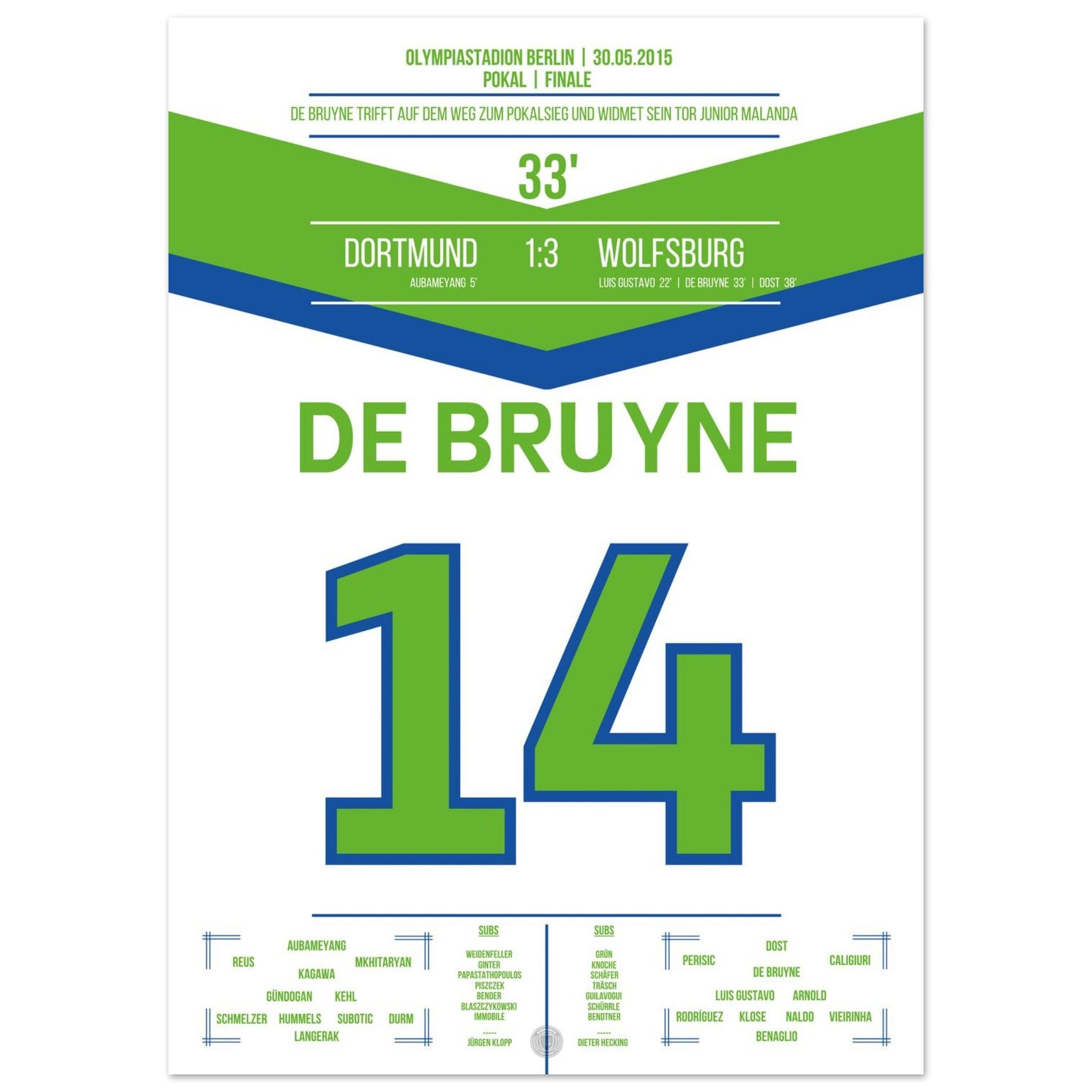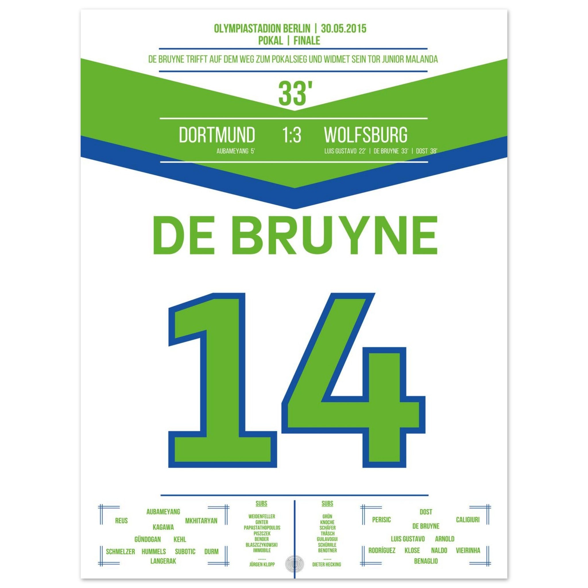 30. Mai 2015 – Berlin vs. Dortmund 3:1: In der 33. Minute trifft Kevin De Bruyne und bringt Wolfsburg im Pokalfinale gegen Dortmund auf die Siegerstraße. Sein Treffer leitet den ersten Pokalsieg der Vereinsgeschichte ein. Unser Poster verewigt diesen historischen Moment im Olympiastadion.