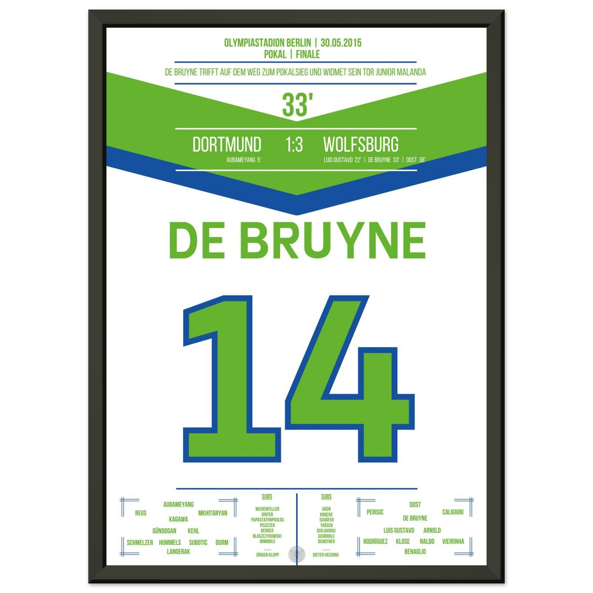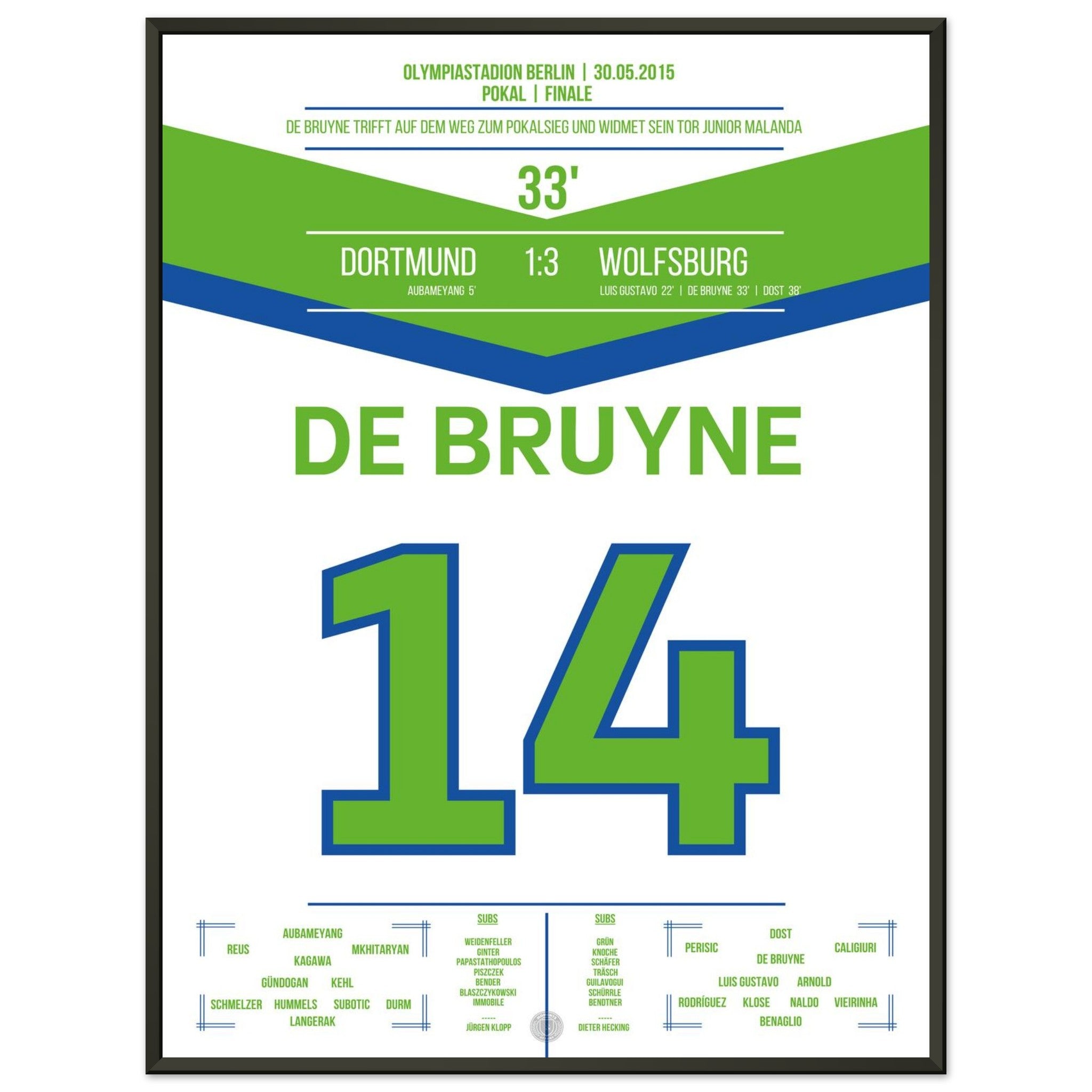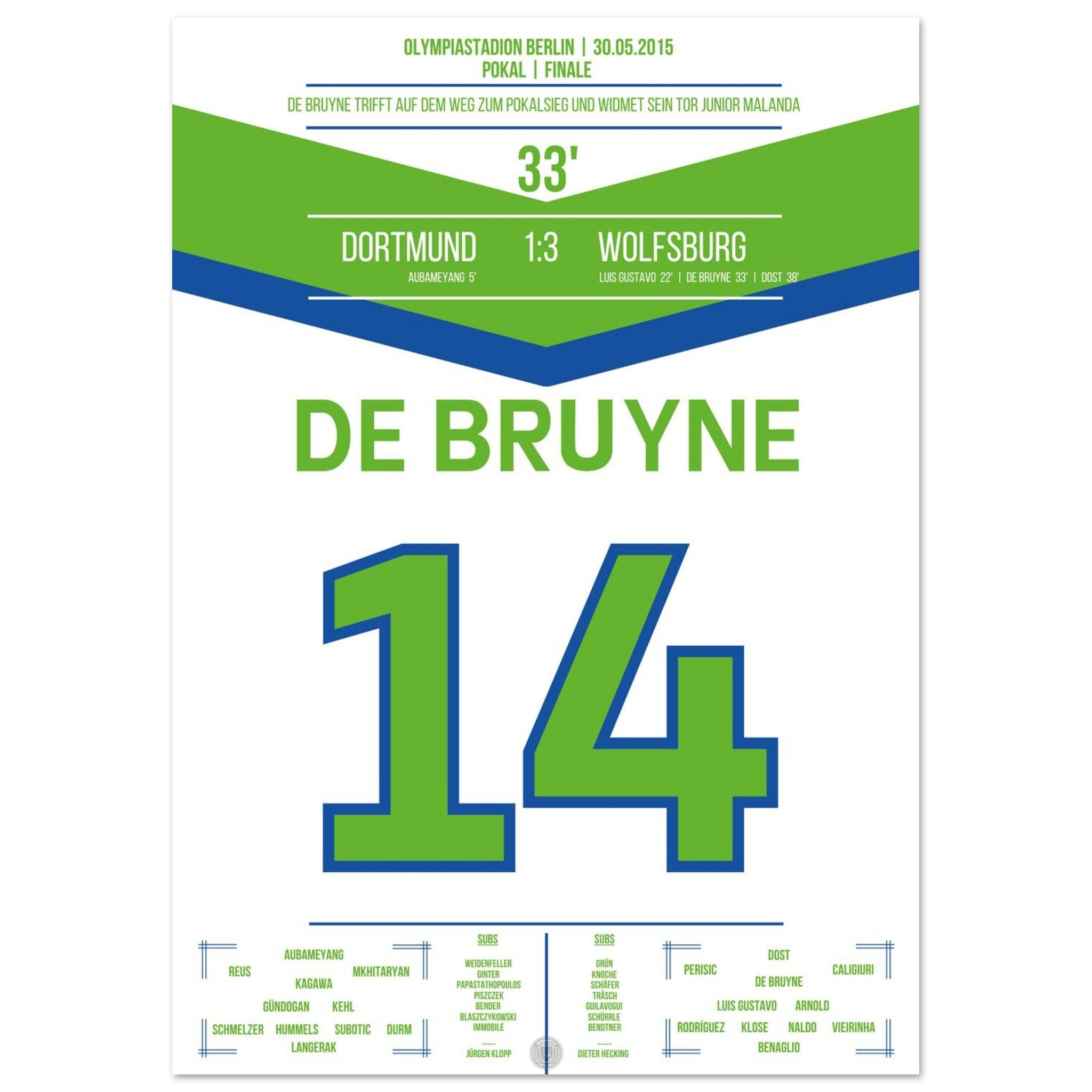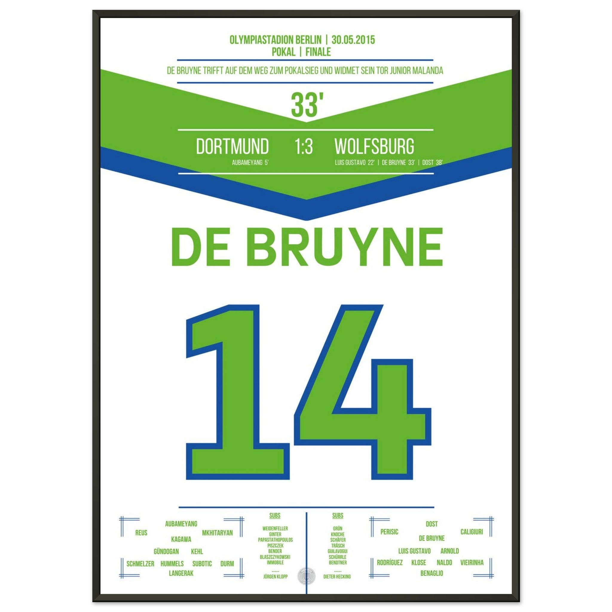 30. Mai 2015 – Berlin vs. Dortmund 3:1: In der 33. Minute trifft Kevin De Bruyne und bringt Wolfsburg im Pokalfinale gegen Dortmund auf die Siegerstraße. Sein Treffer leitet den ersten Pokalsieg der Vereinsgeschichte ein. Unser Poster verewigt diesen historischen Moment im Olympiastadion.
