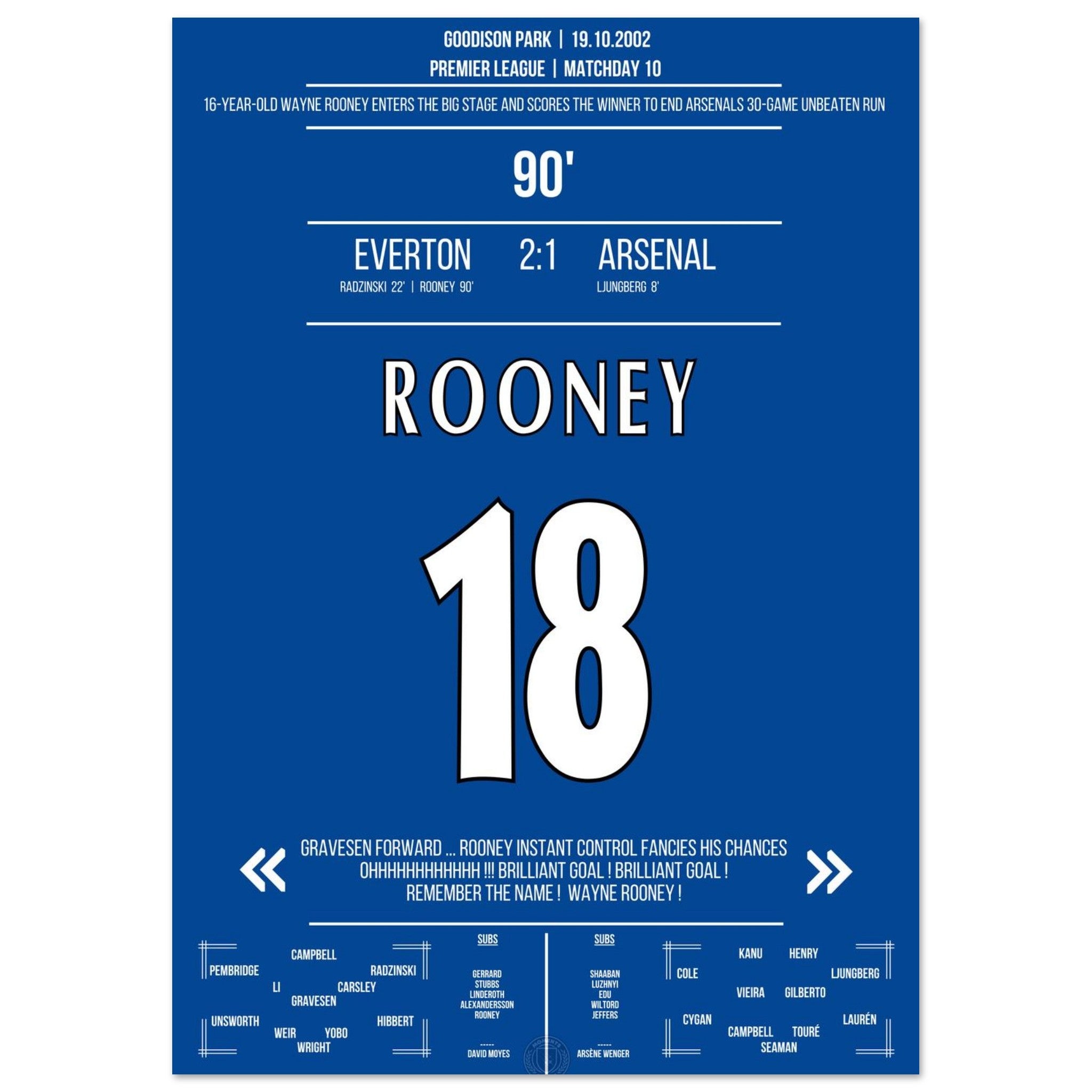 Wayne Rooney zündet in der 90. Minute einen Geniestreich aus der Distanz – und beendet Arsenals 30-Spiele-Serie ohne Niederlage. „Remember the name!“ – der Beginn einer legendären Karriere.