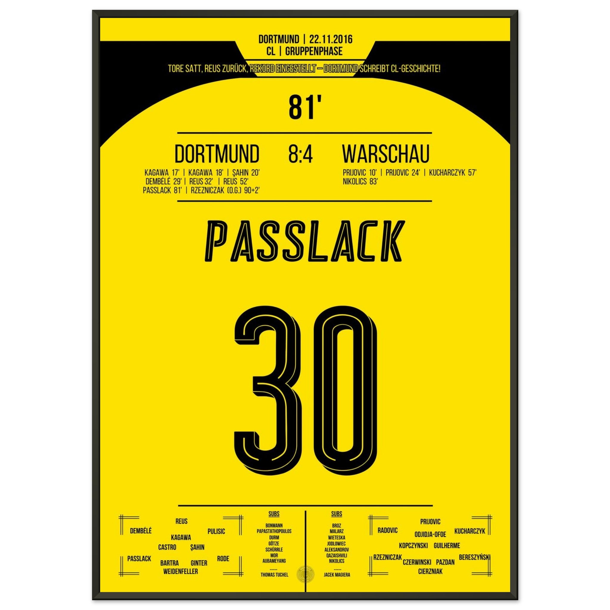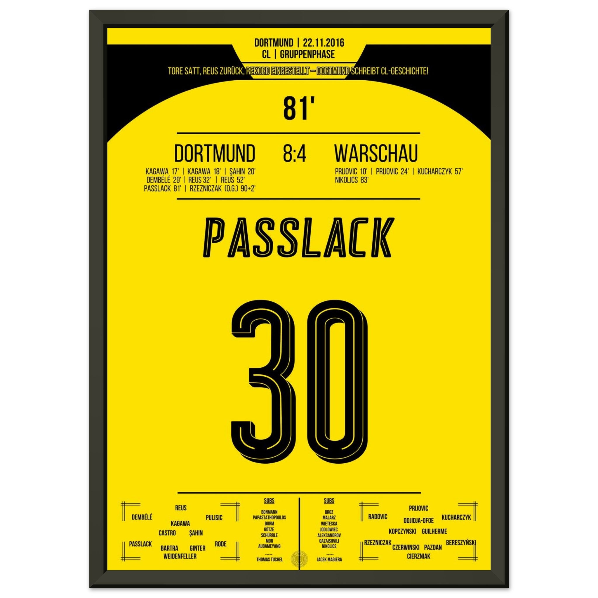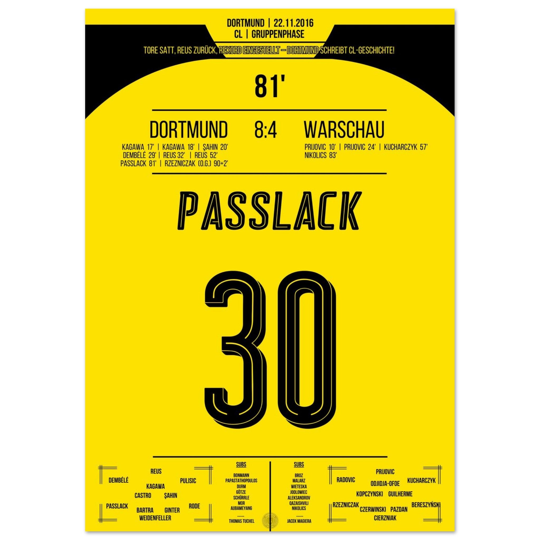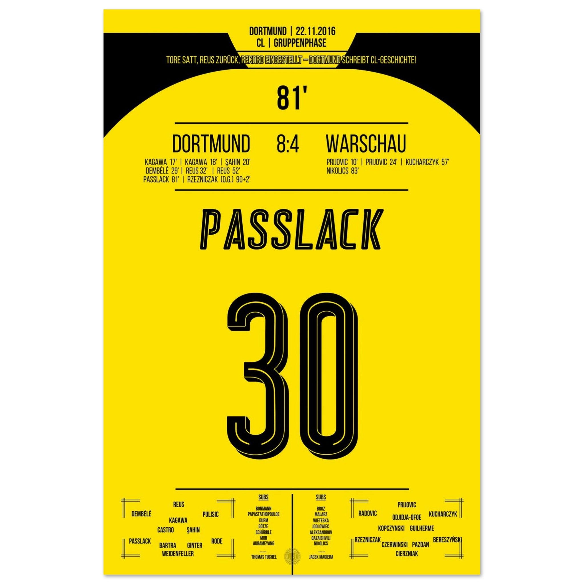 22. November 2016 – Dortmund vs. Warschau 8:4: An einem völlig verrückten CL-Abend liefert Dortmund ein Offensivspektakel für die Geschichtsbücher – 12 Tore, Rekordspiel! Reus & Co. lassen das Stadion beben. Unser Poster hält dieses torreiche Fußballfest für immer fest.