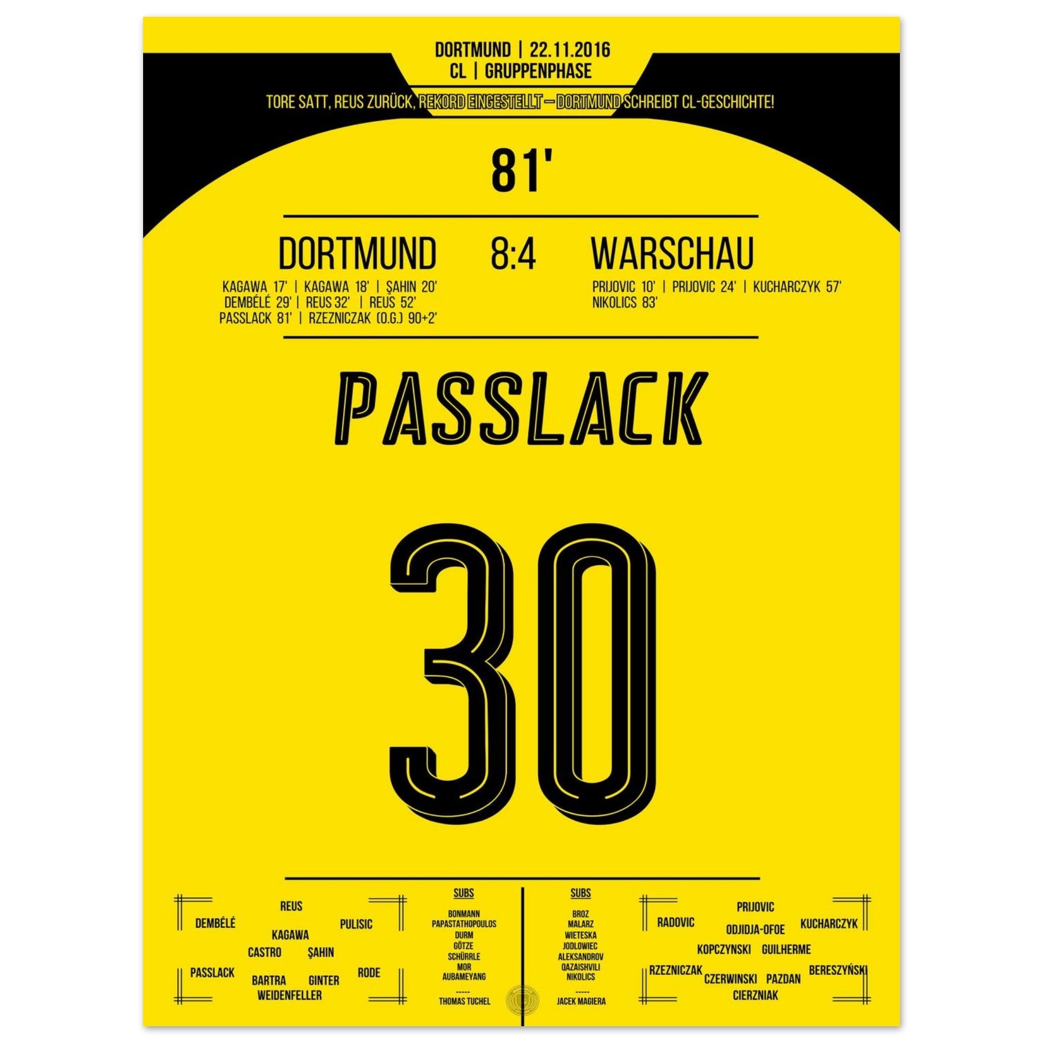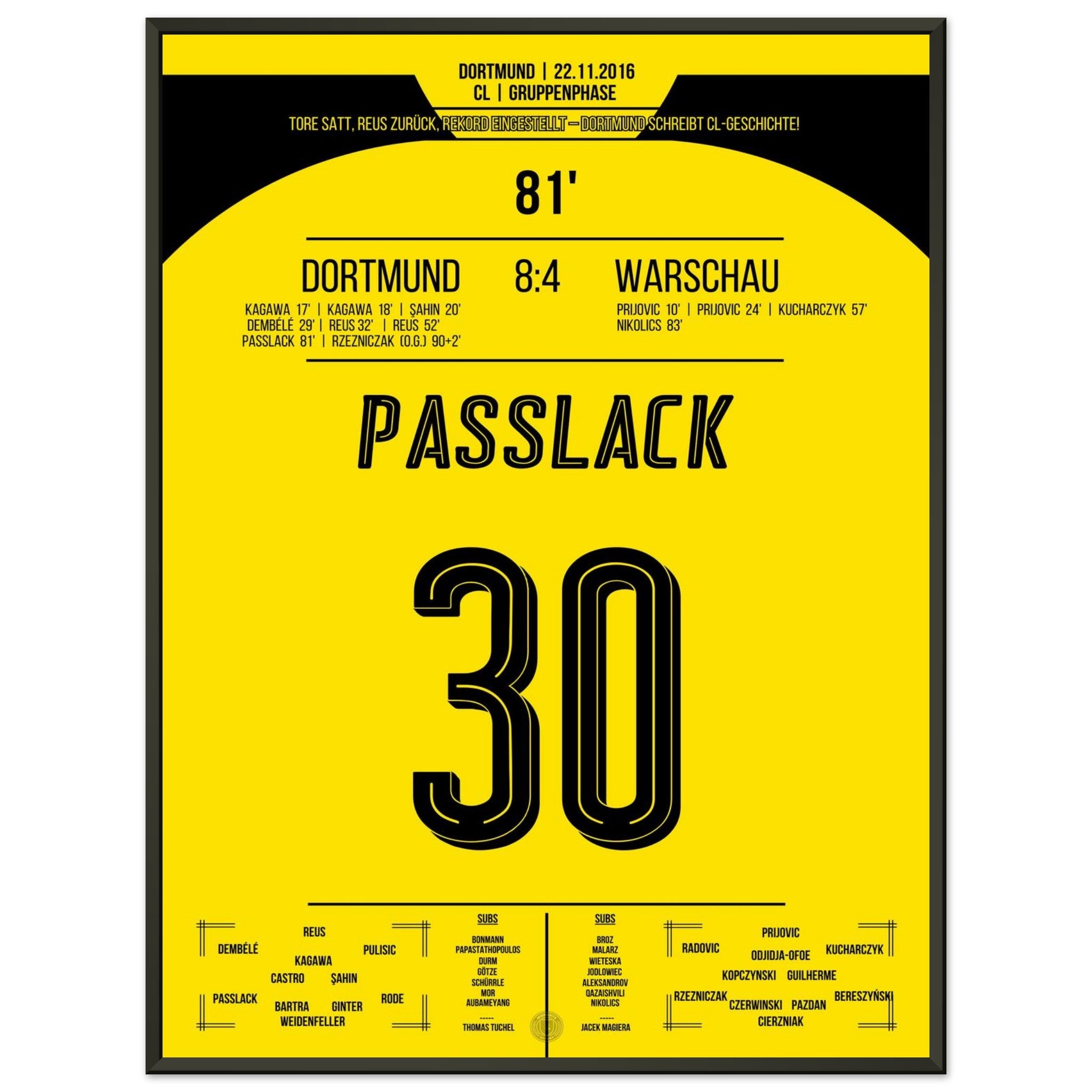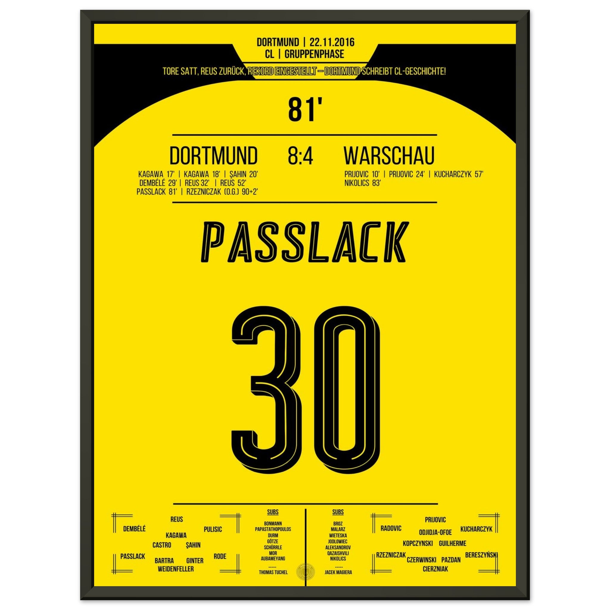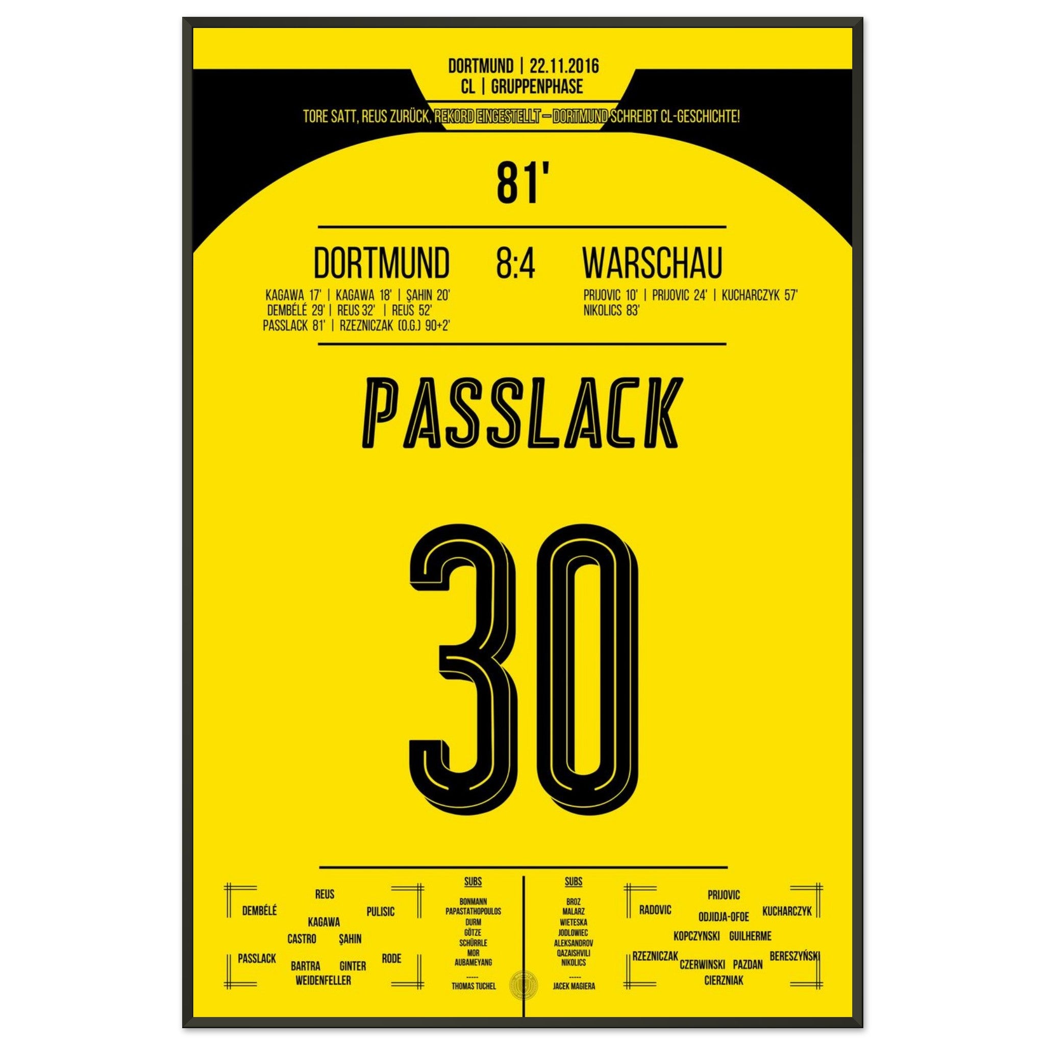 22. November 2016 – Dortmund vs. Warschau 8:4: An einem völlig verrückten CL-Abend liefert Dortmund ein Offensivspektakel für die Geschichtsbücher – 12 Tore, Rekordspiel! Reus & Co. lassen das Stadion beben. Unser Poster hält dieses torreiche Fußballfest für immer fest.