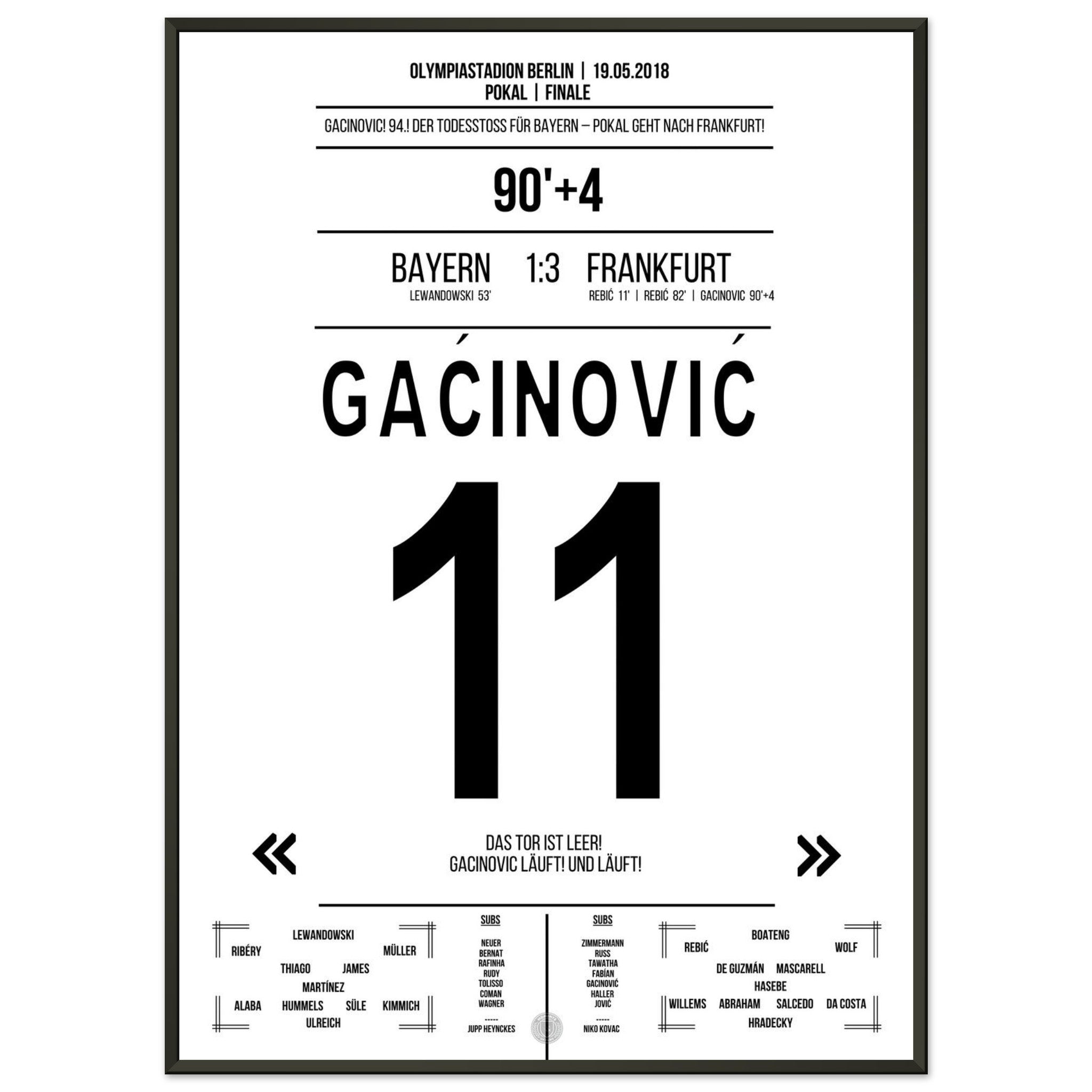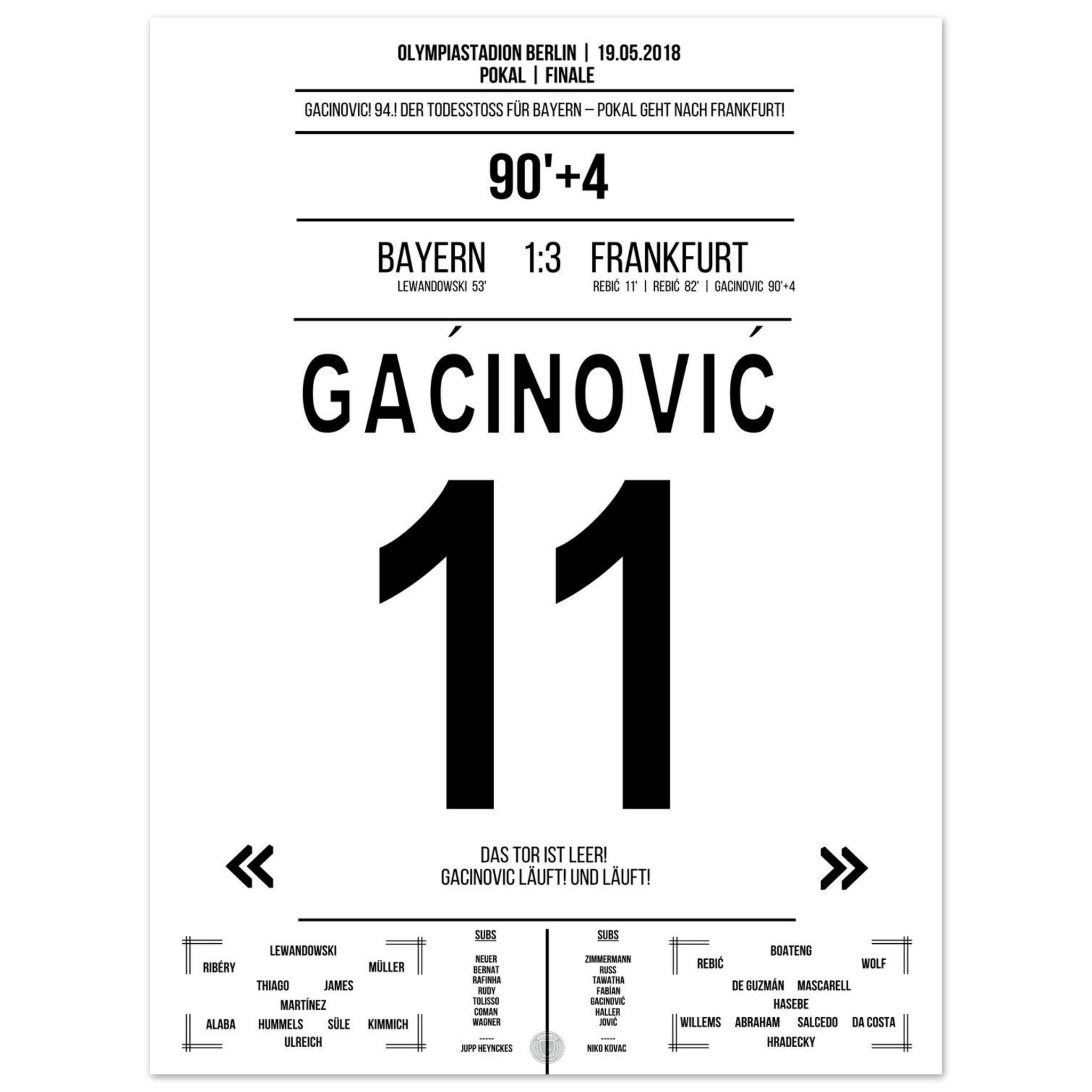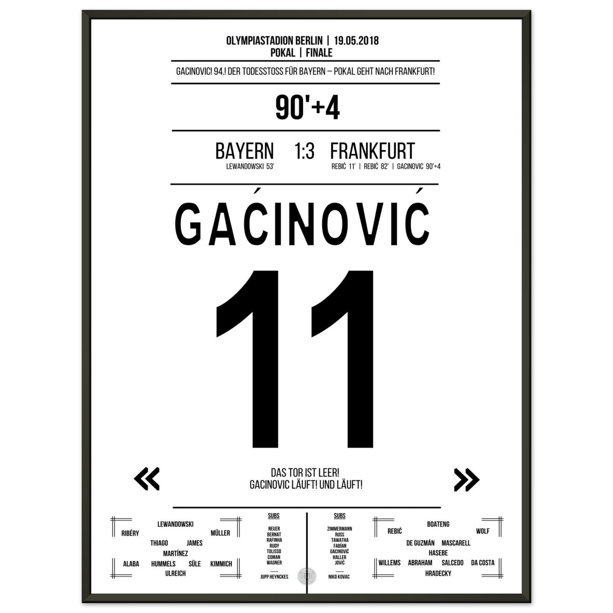 19. Mai 2018 – Bayern vs. Frankfurt 1:3: In der 94. Minute läuft Gaćinović allein aufs leere Tor zu und macht mit dem 3:1 den Pokalsieg gegen Bayern perfekt. Ein Konter, ein Sprint, ein ganzer Verein im Freudentaumel. Unser Poster hält diesen entscheidenden Gänsehautmoment fest.