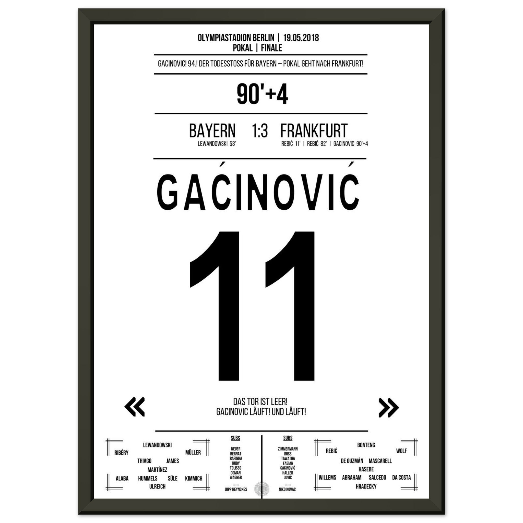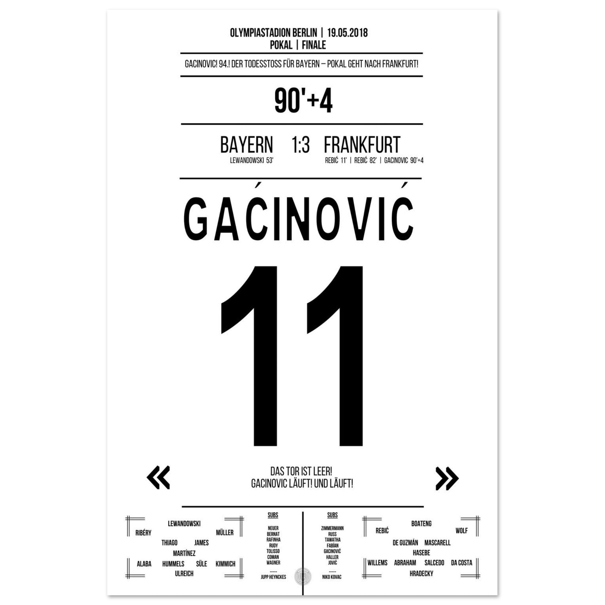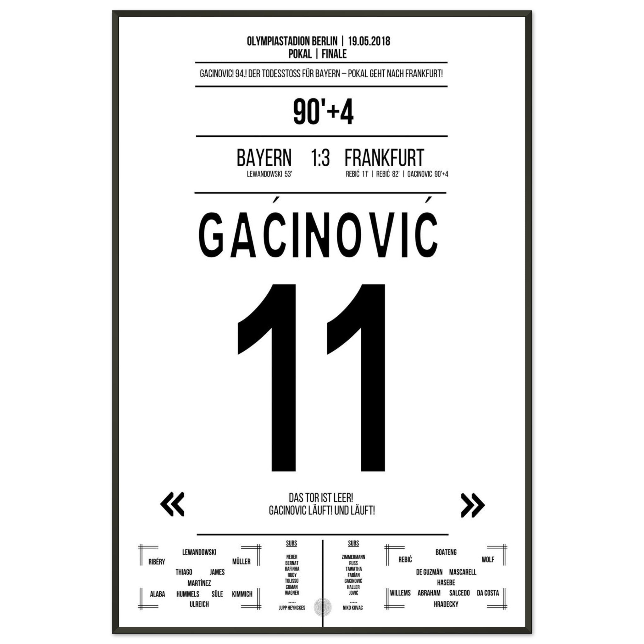 19. Mai 2018 – Bayern vs. Frankfurt 1:3: In der 94. Minute läuft Gaćinović allein aufs leere Tor zu und macht mit dem 3:1 den Pokalsieg gegen Bayern perfekt. Ein Konter, ein Sprint, ein ganzer Verein im Freudentaumel. Unser Poster hält diesen entscheidenden Gänsehautmoment fest.