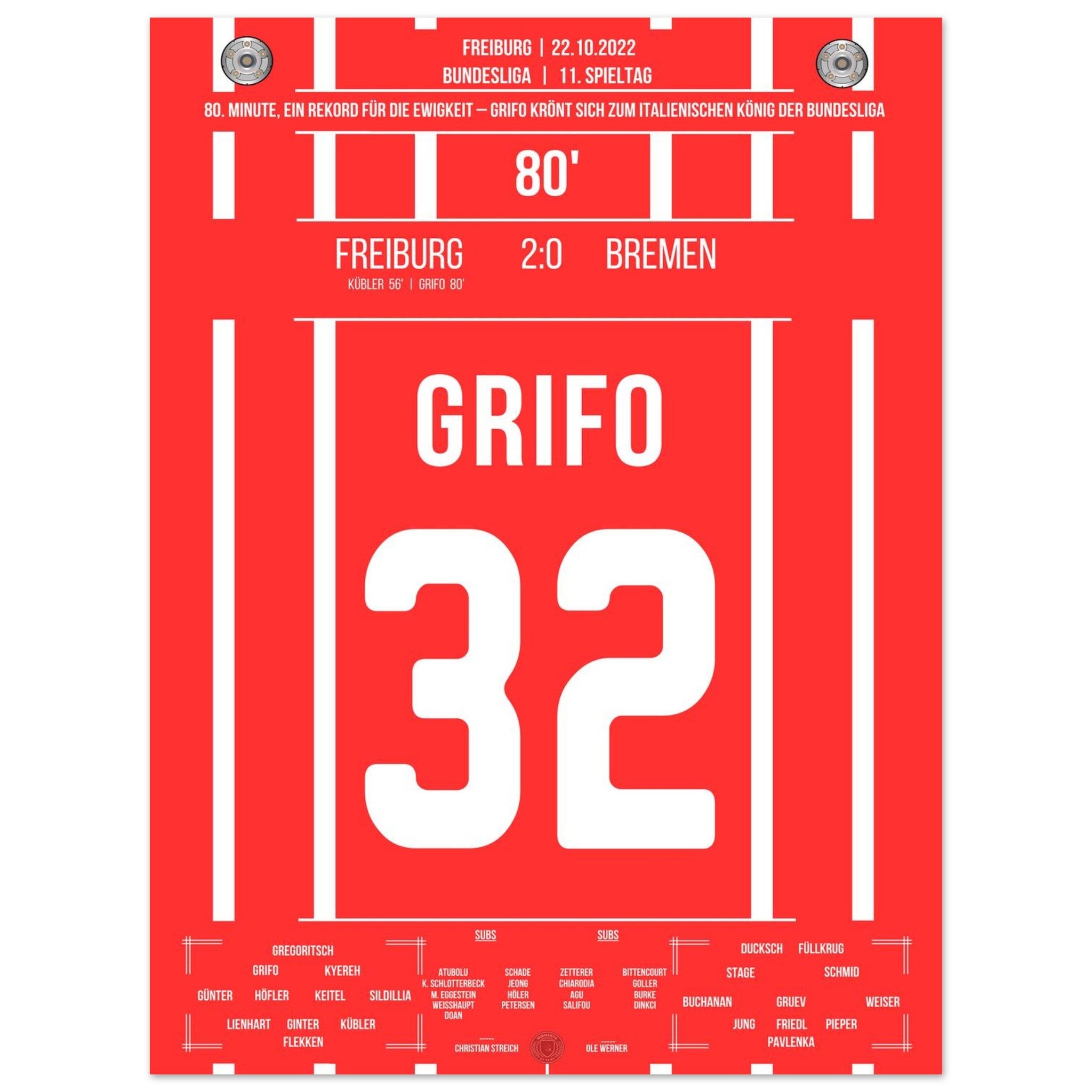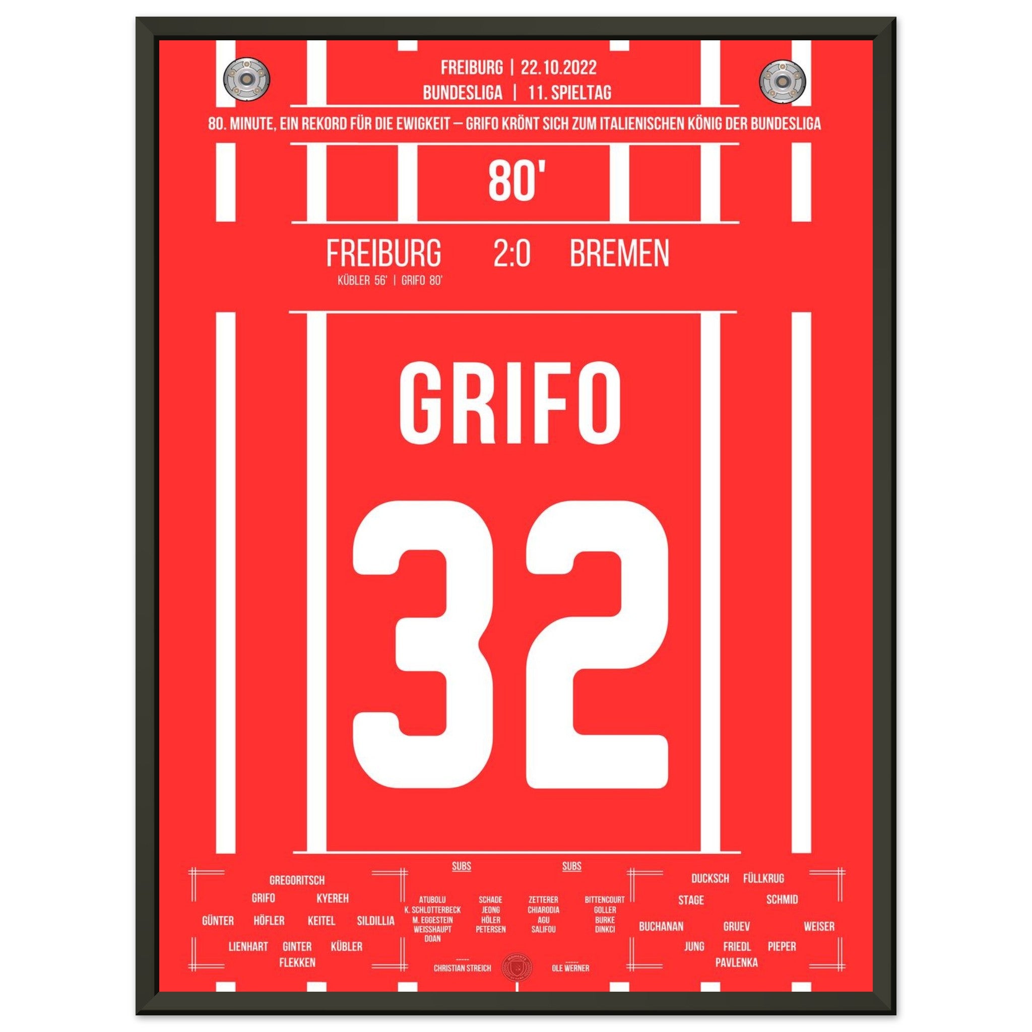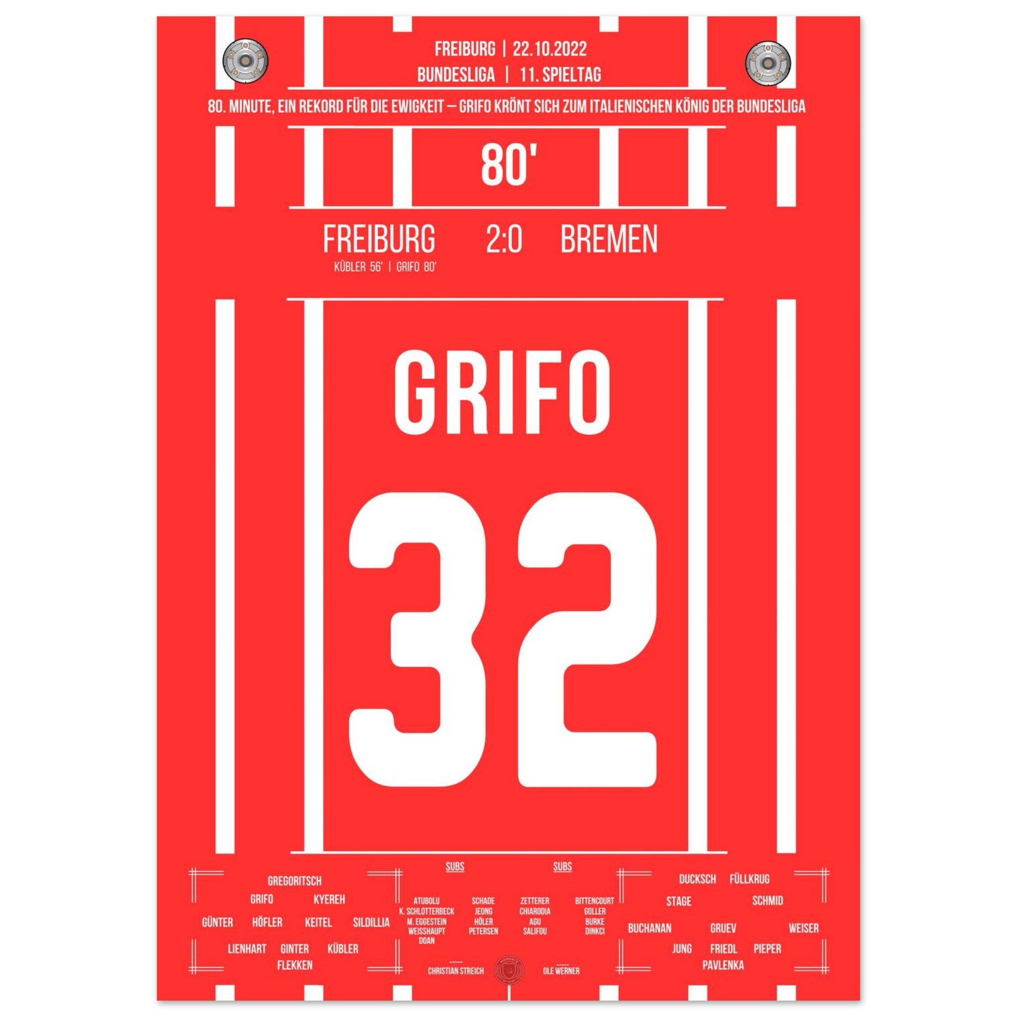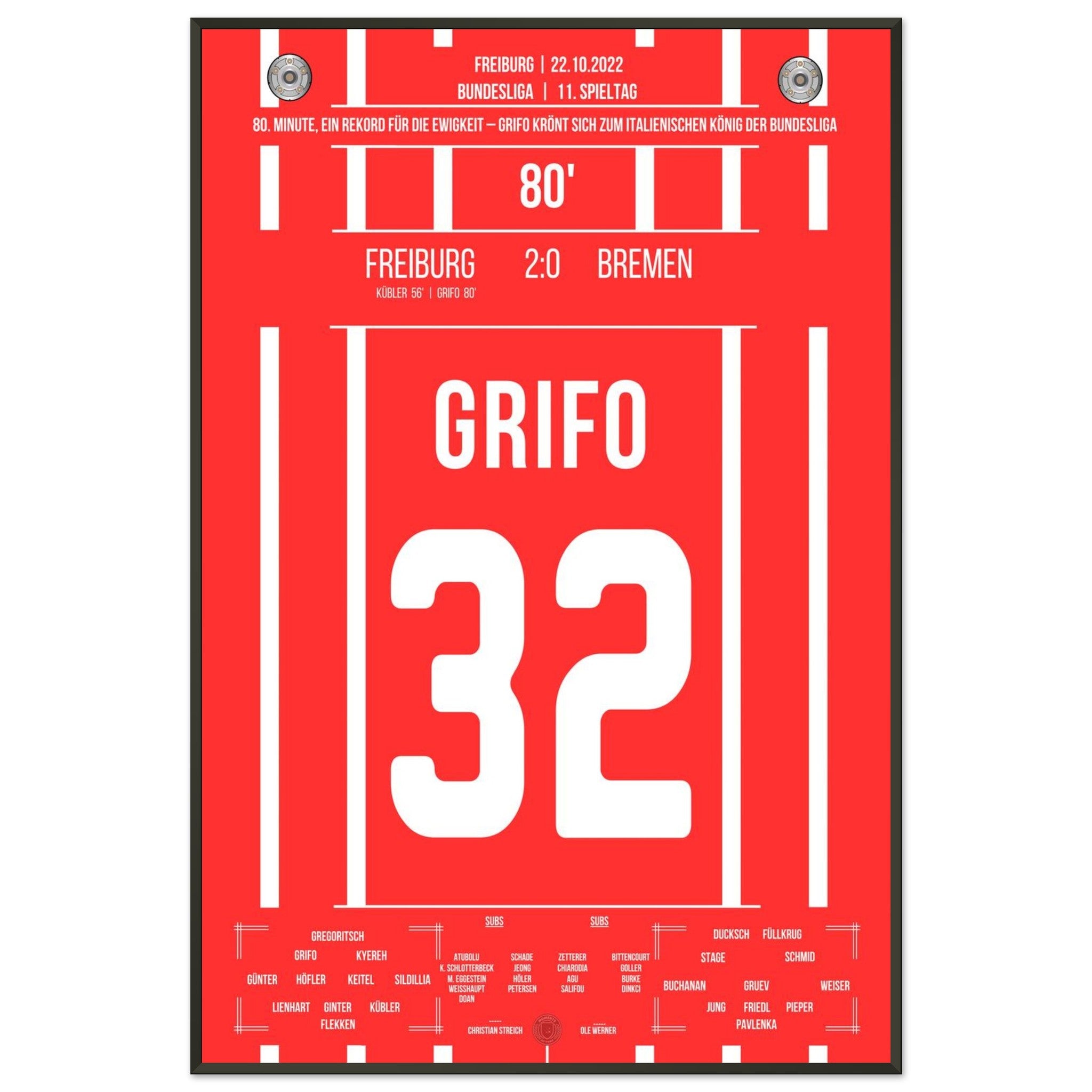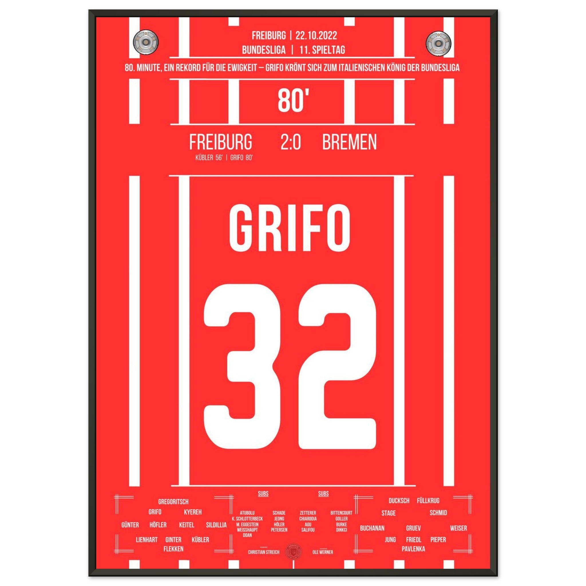 22. Oktober 2022 – Freiburg vs. Bremen 2:0: In der 80. Minute trifft Vincenzo Grifo zum 2:0 und schreibt Geschichte – mit seinem Tor wird er zum erfolgreichsten Italiener der Bundesliga-Geschichte. Ein Moment für die Ewigkeit, stilvoll veredelt im Schwarzwaldstadion. Unser Poster hält diesen historischen Grifo-Moment fest.