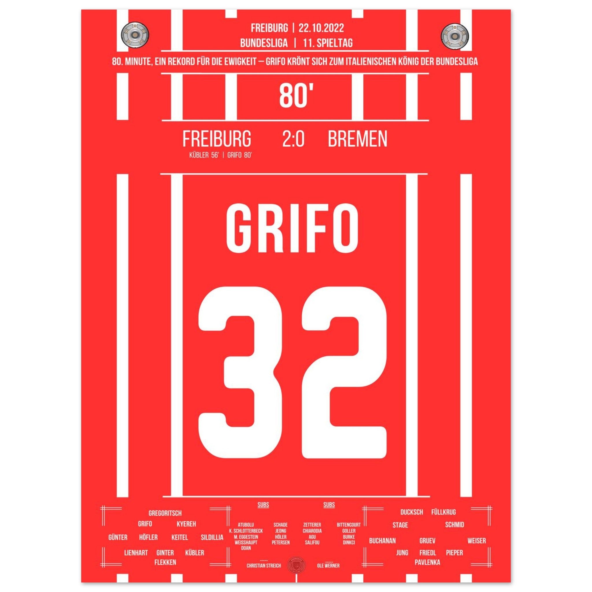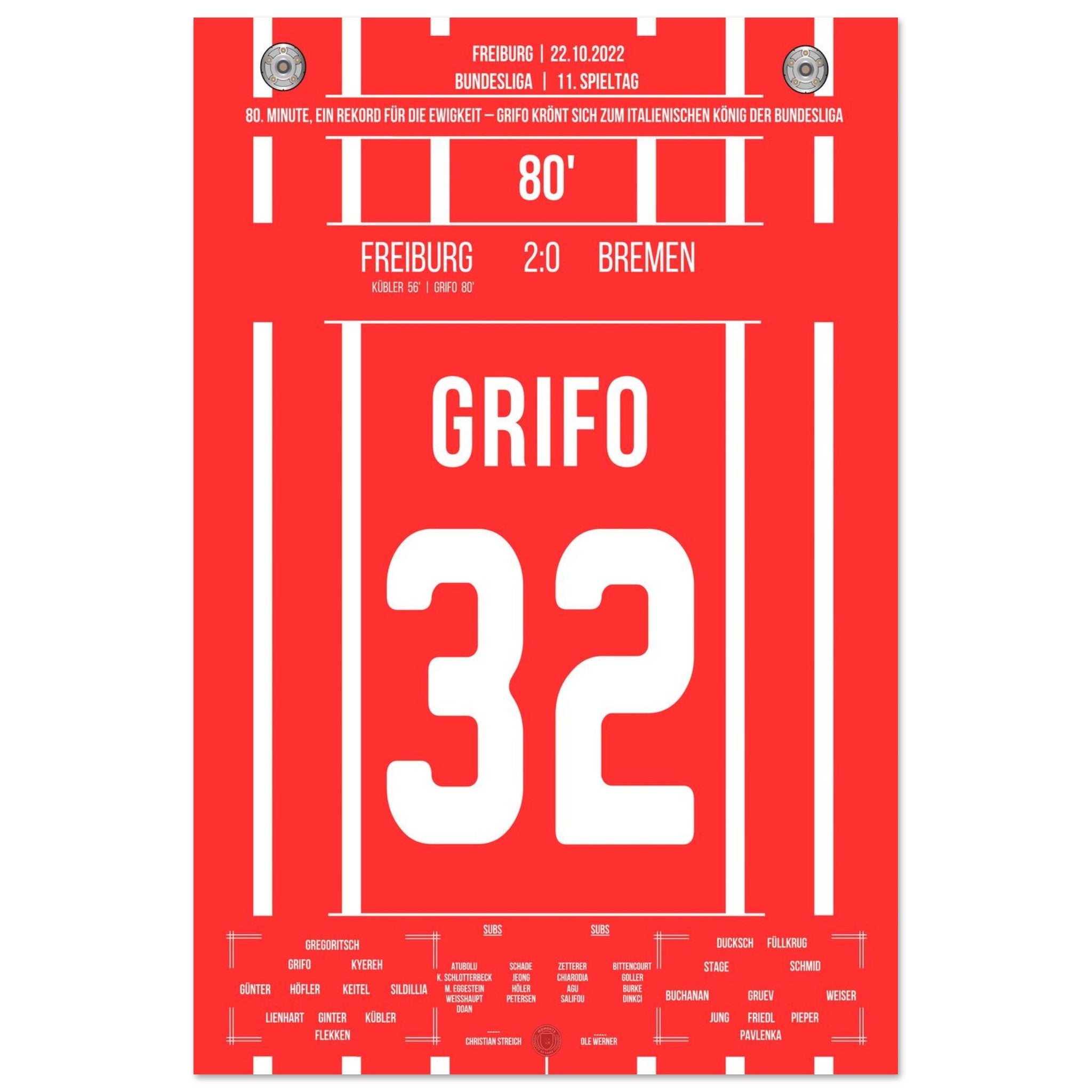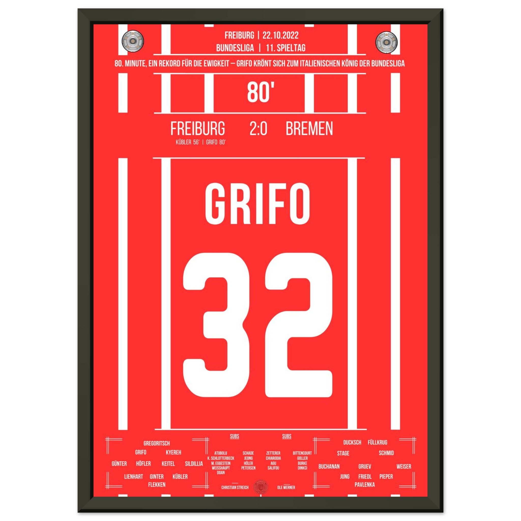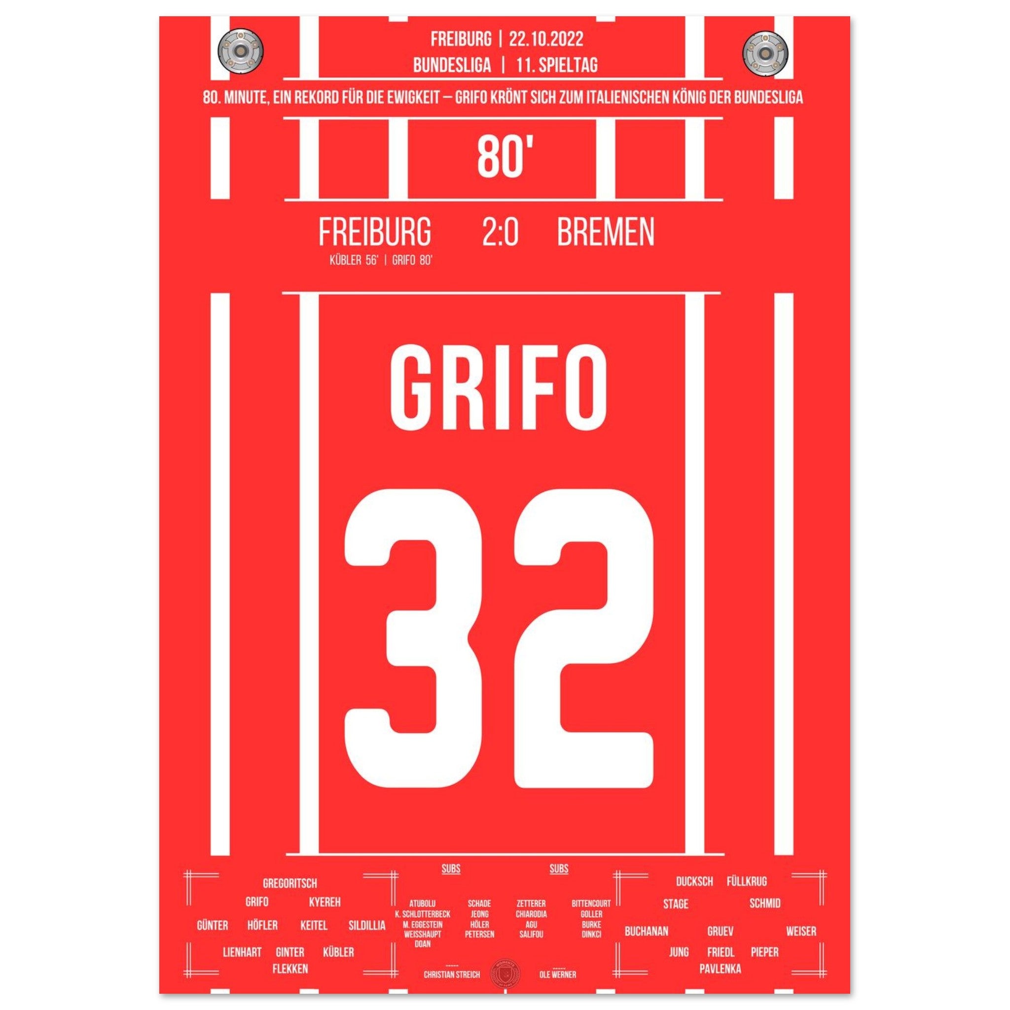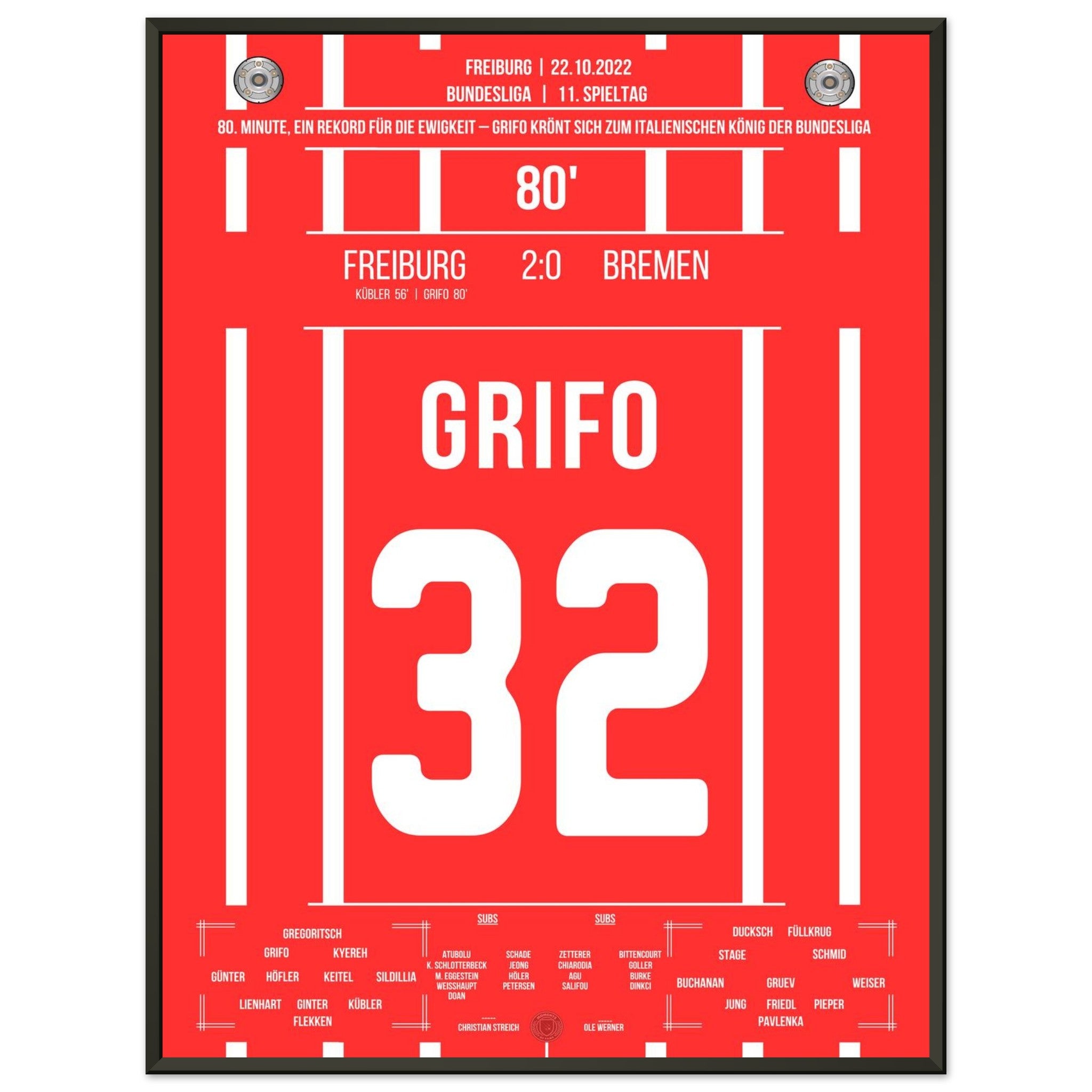 22. Oktober 2022 – Freiburg vs. Bremen 2:0: In der 80. Minute trifft Vincenzo Grifo zum 2:0 und schreibt Geschichte – mit seinem Tor wird er zum erfolgreichsten Italiener der Bundesliga-Geschichte. Ein Moment für die Ewigkeit, stilvoll veredelt im Schwarzwaldstadion. Unser Poster hält diesen historischen Grifo-Moment fest.