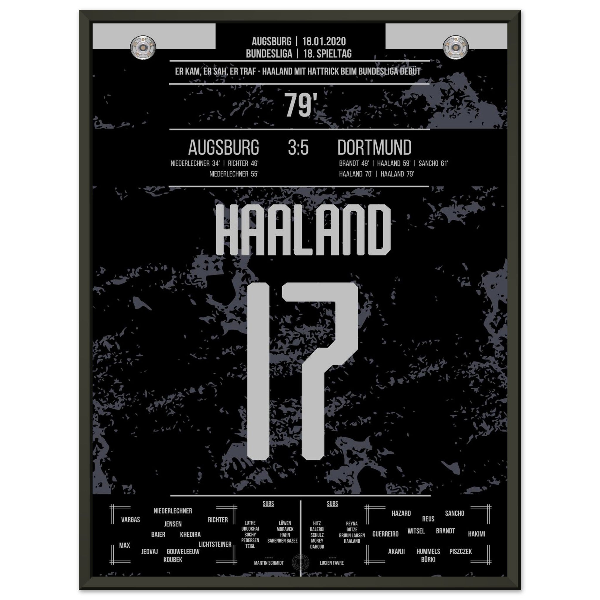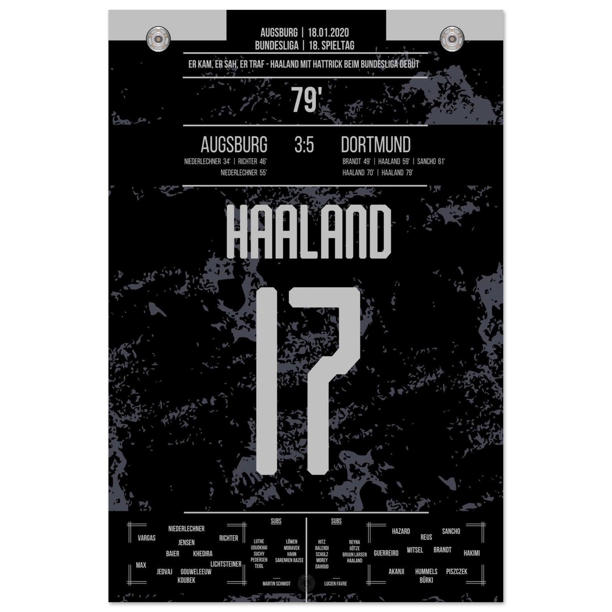 18. Januar 2020 – Augsburg vs. Dortmund 3:5: Erling Haaland betritt die Bundesliga-Bühne – und explodiert. In nur 23 Minuten erzielt der Norweger einen Hattrick nach Einwechslung und dreht das Spiel im Alleingang. Ein Debüt für die Geschichtsbücher. Unser Poster verewigt diesen brachialen Bundesliga-Start für die Ewigkeit.