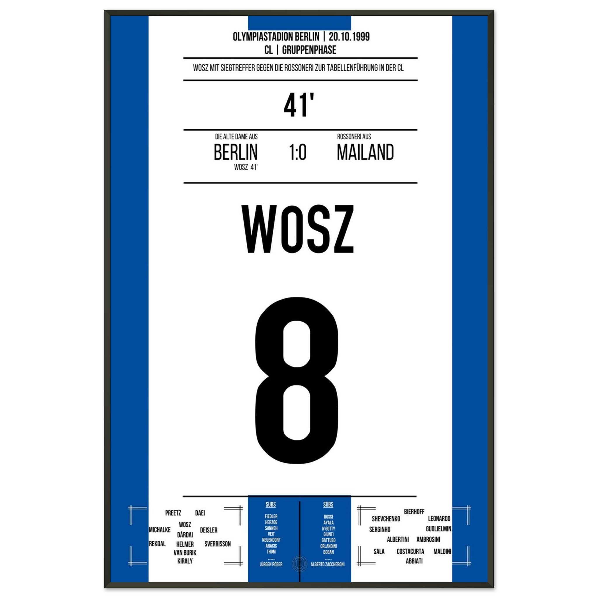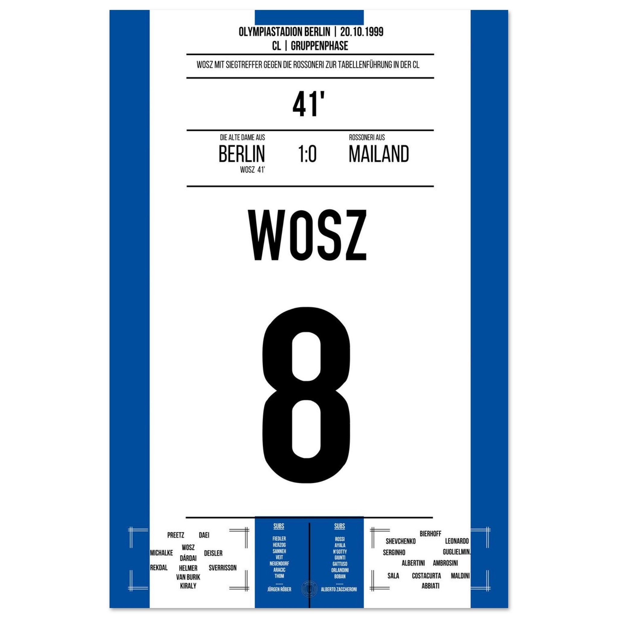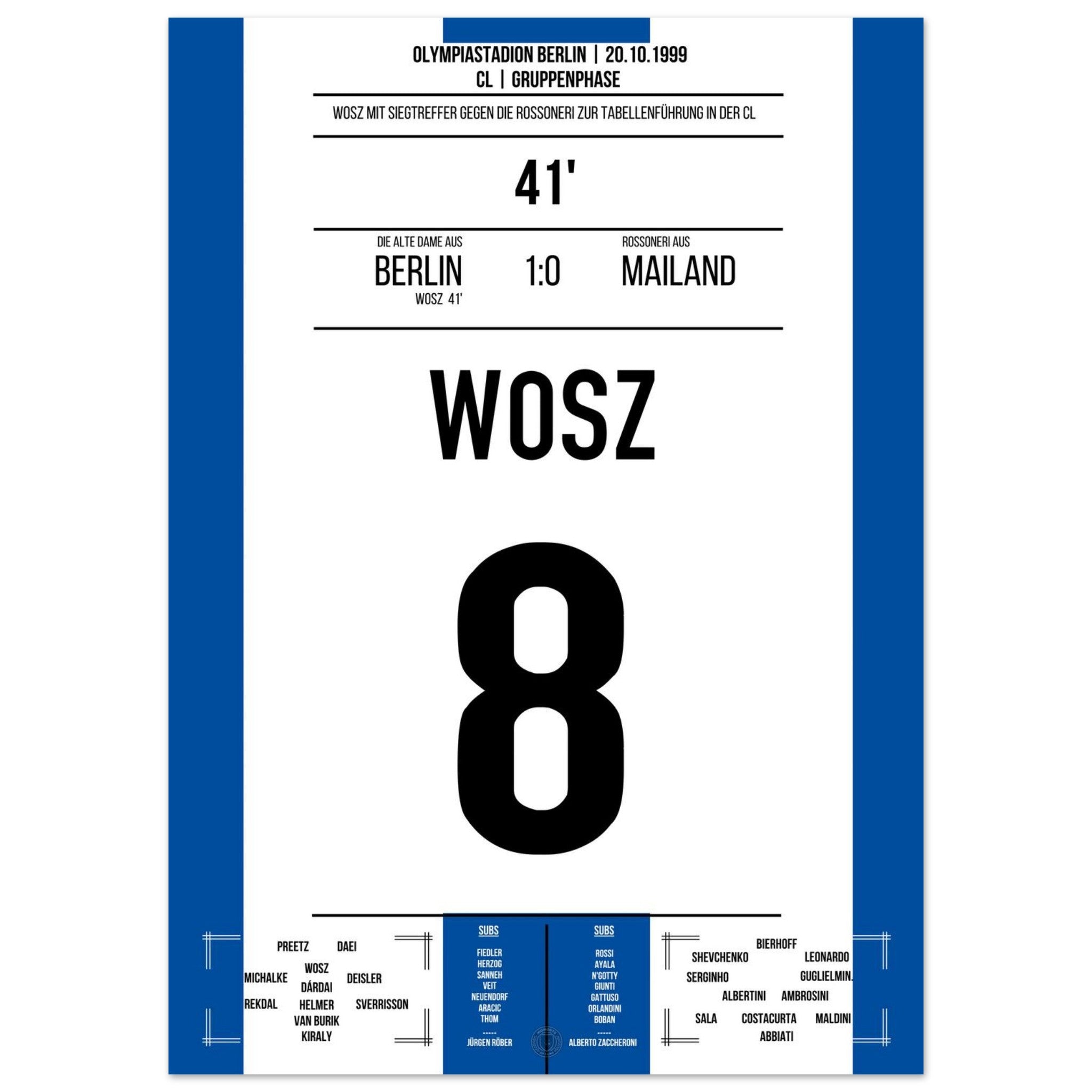 Wosz trifft in der 41. Minute und bringt die alte Dame auf die Siegerstraße. Mit einer leidenschaftlichen Vorstellung gelingt Berlin ein Sensationssieg gegen Mailand – ein Abend für die Vereinsgeschichte!
