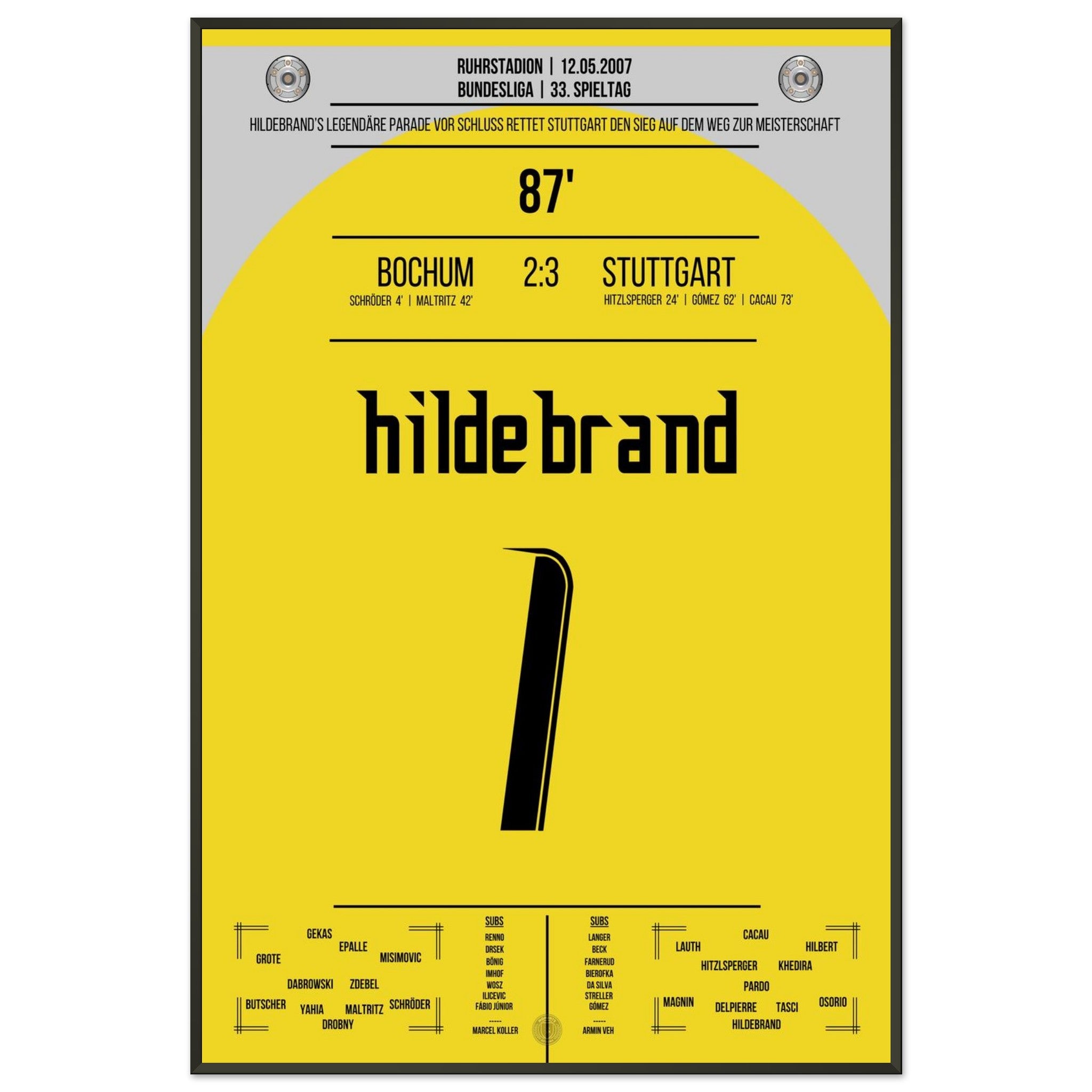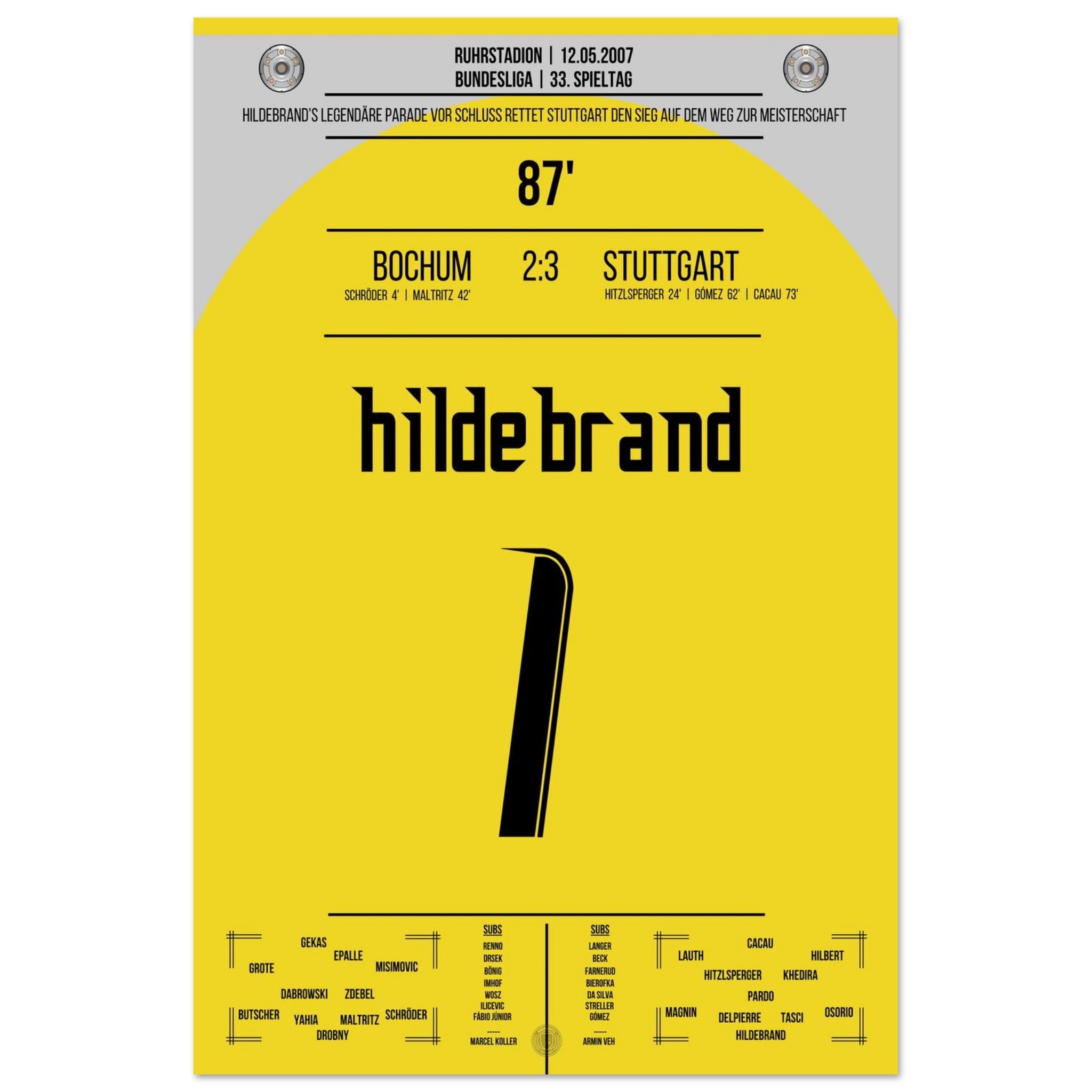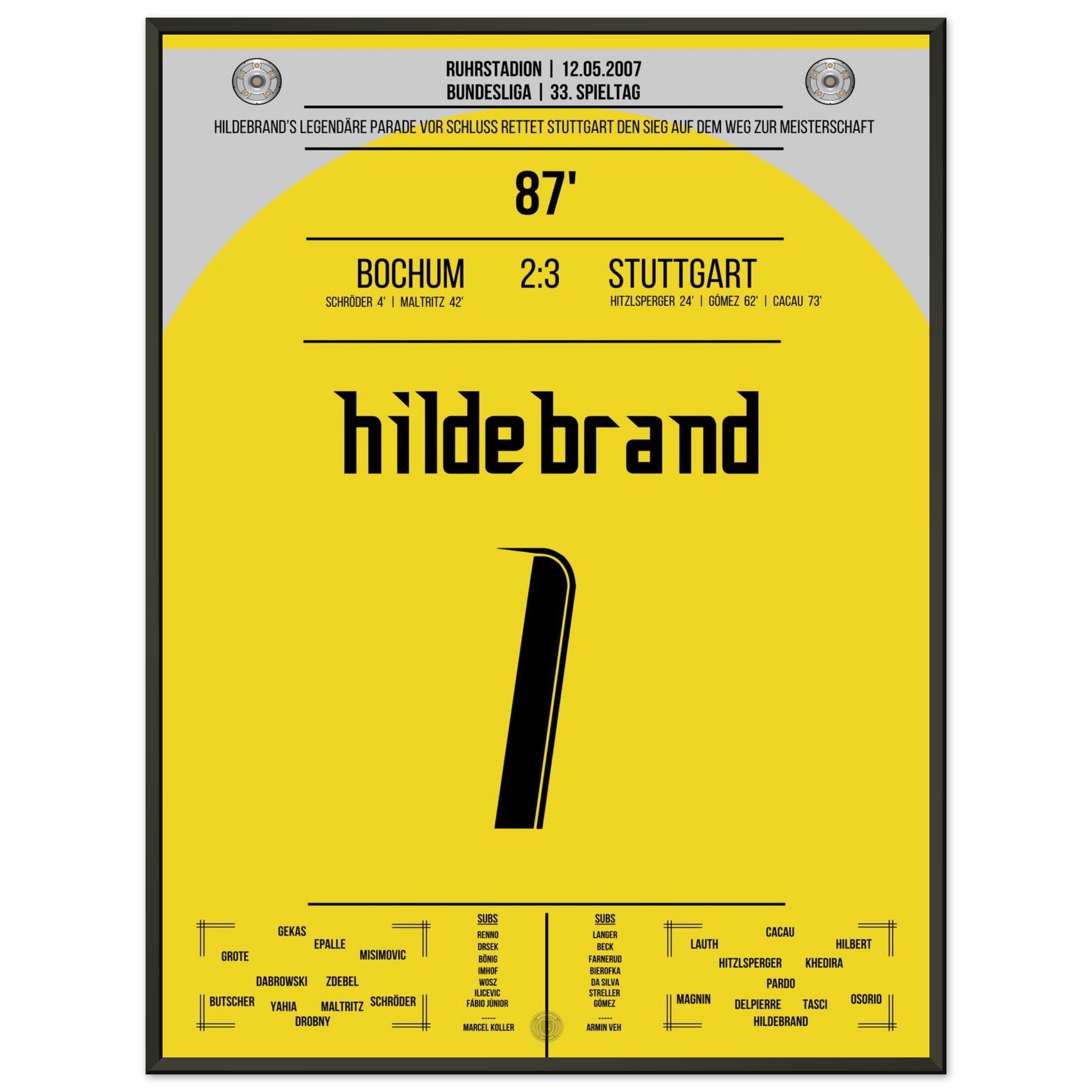 12. Mai 2007 – Bochum vs. Stuttgart 2:3: Stuttgart dreht die Partie und macht mit dem Auswärtssieg einen Riesenschritt Richtung Meisterschaft – doch der heimliche Held ist Timo Hildebrand, der in der 87. Minute mit einer Weltklasse-Parade den Sieg festhält. Unser Poster fängt diesen legendären Moment auf dem Weg zum Titel 2007 ein.