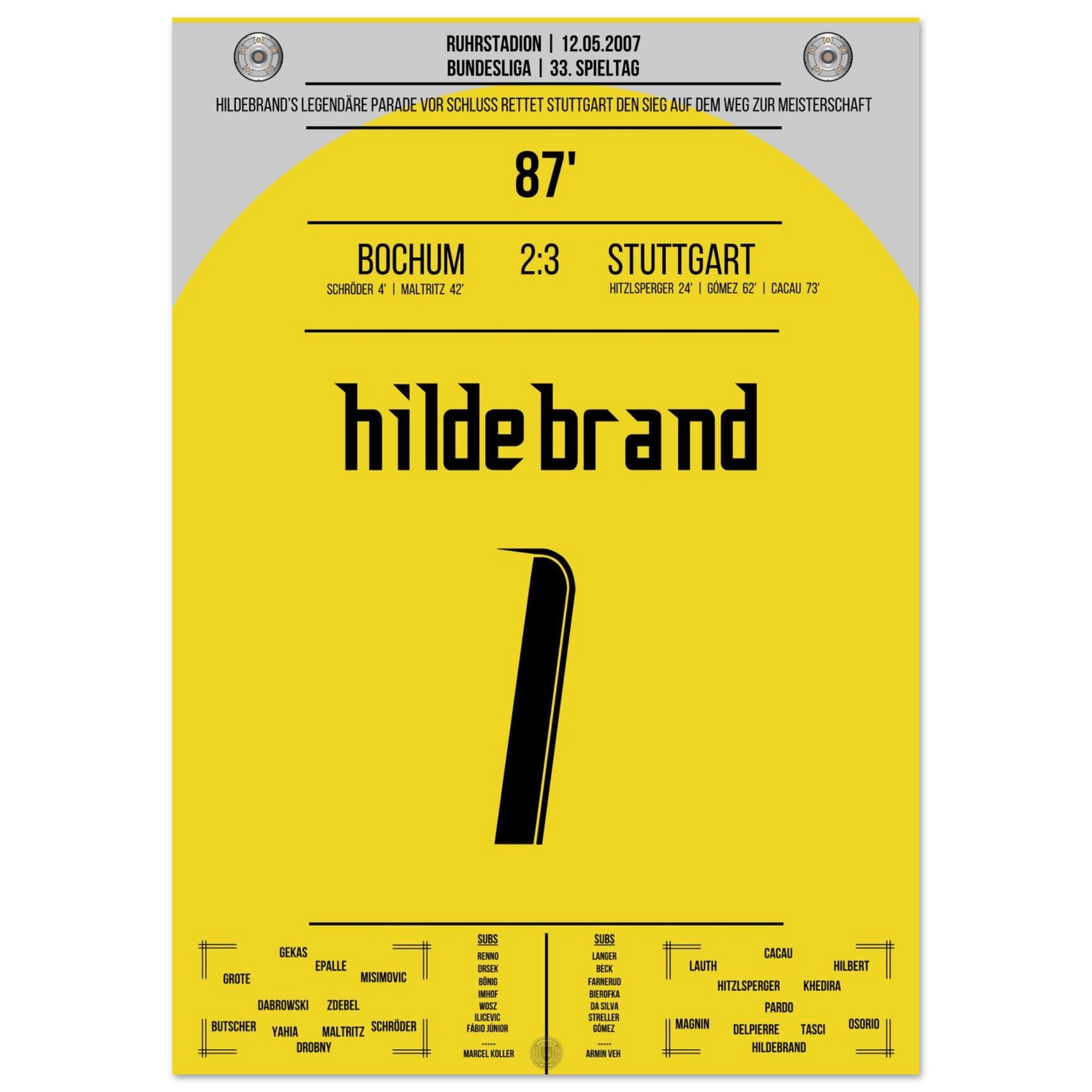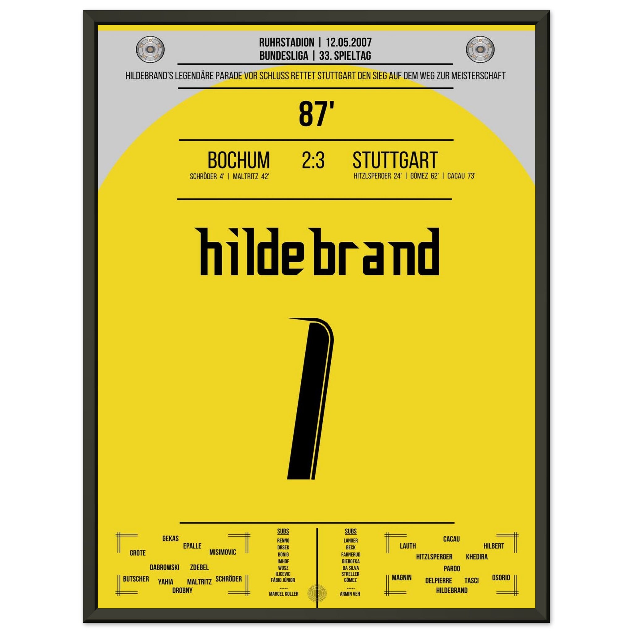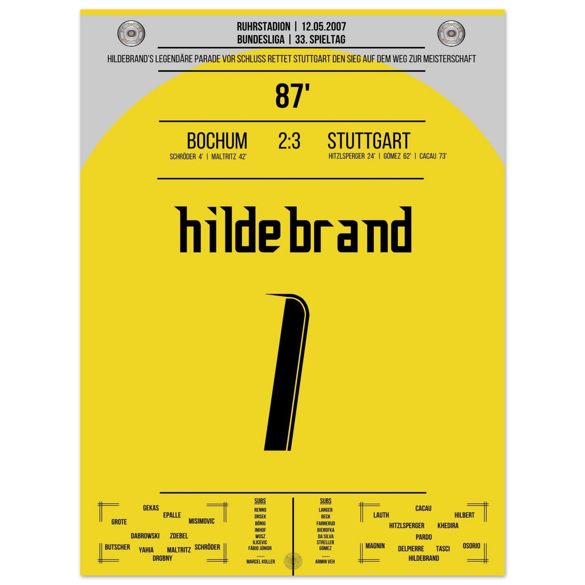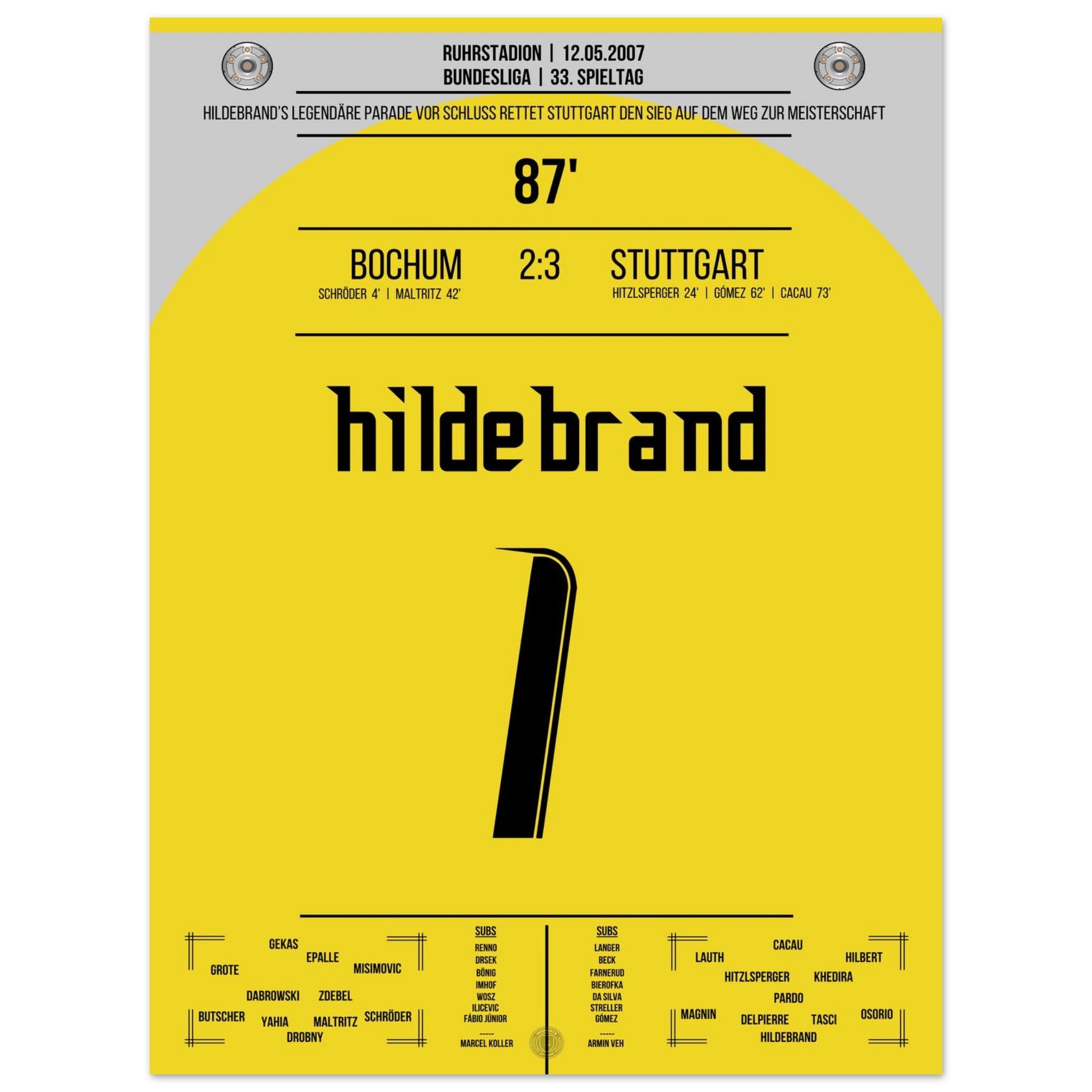 12. Mai 2007 – Bochum vs. Stuttgart 2:3: Stuttgart dreht die Partie und macht mit dem Auswärtssieg einen Riesenschritt Richtung Meisterschaft – doch der heimliche Held ist Timo Hildebrand, der in der 87. Minute mit einer Weltklasse-Parade den Sieg festhält. Unser Poster fängt diesen legendären Moment auf dem Weg zum Titel 2007 ein.