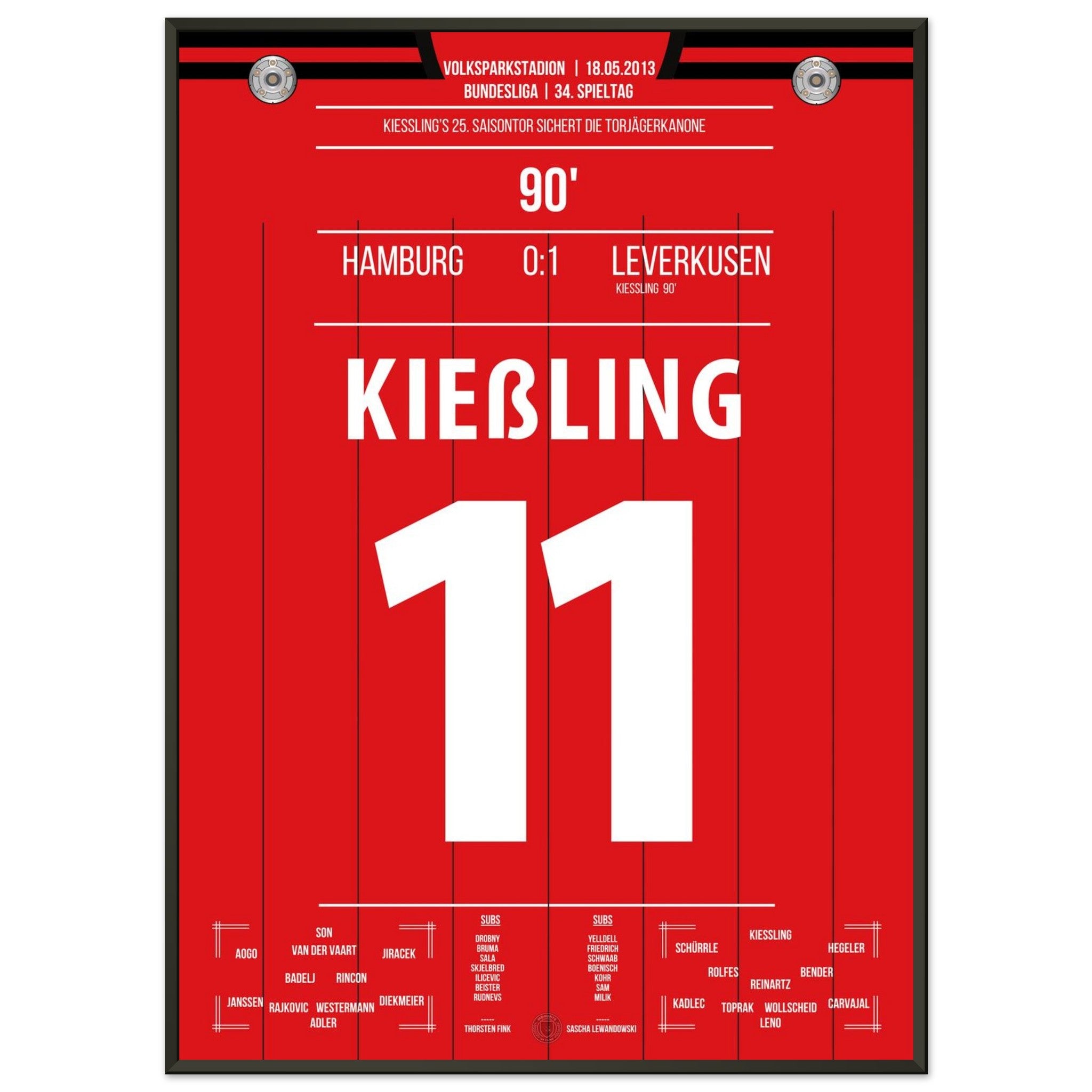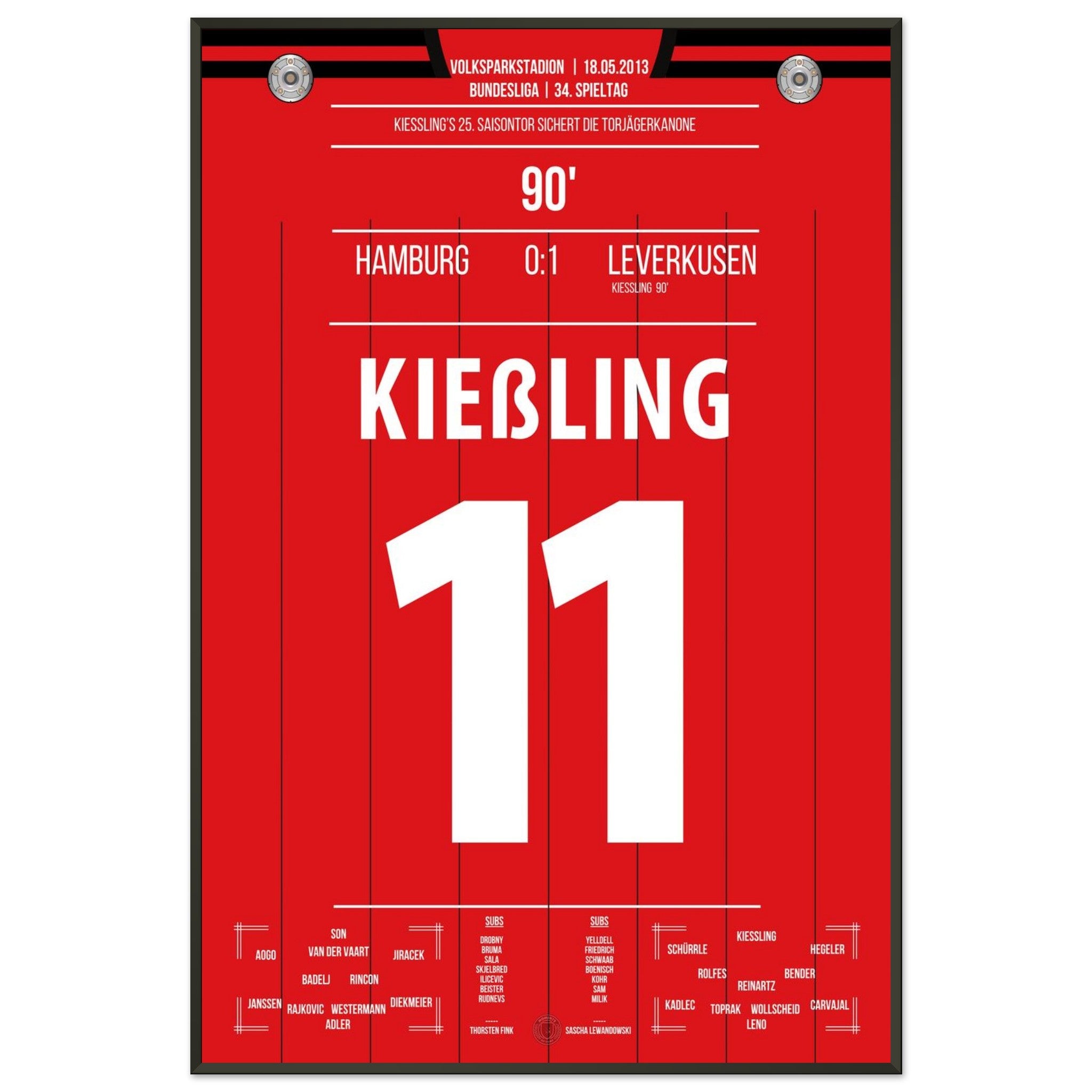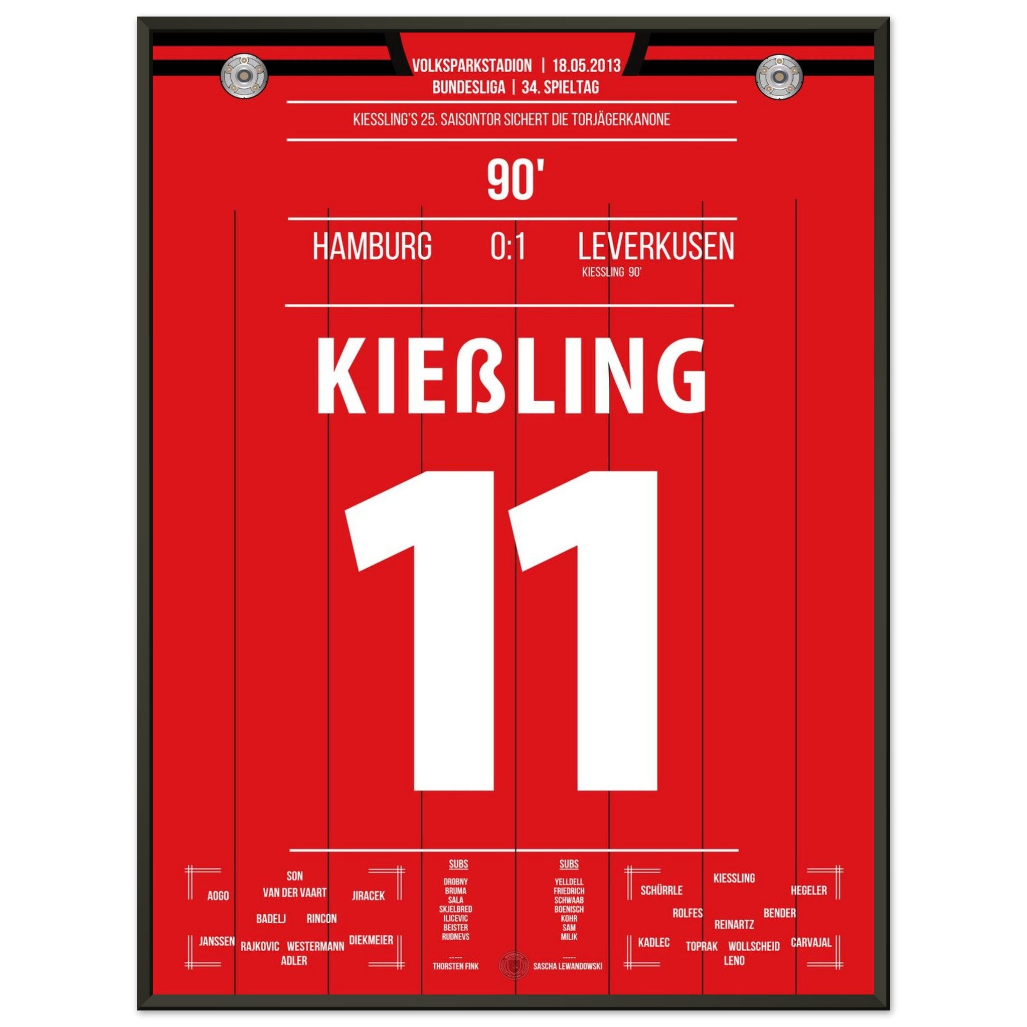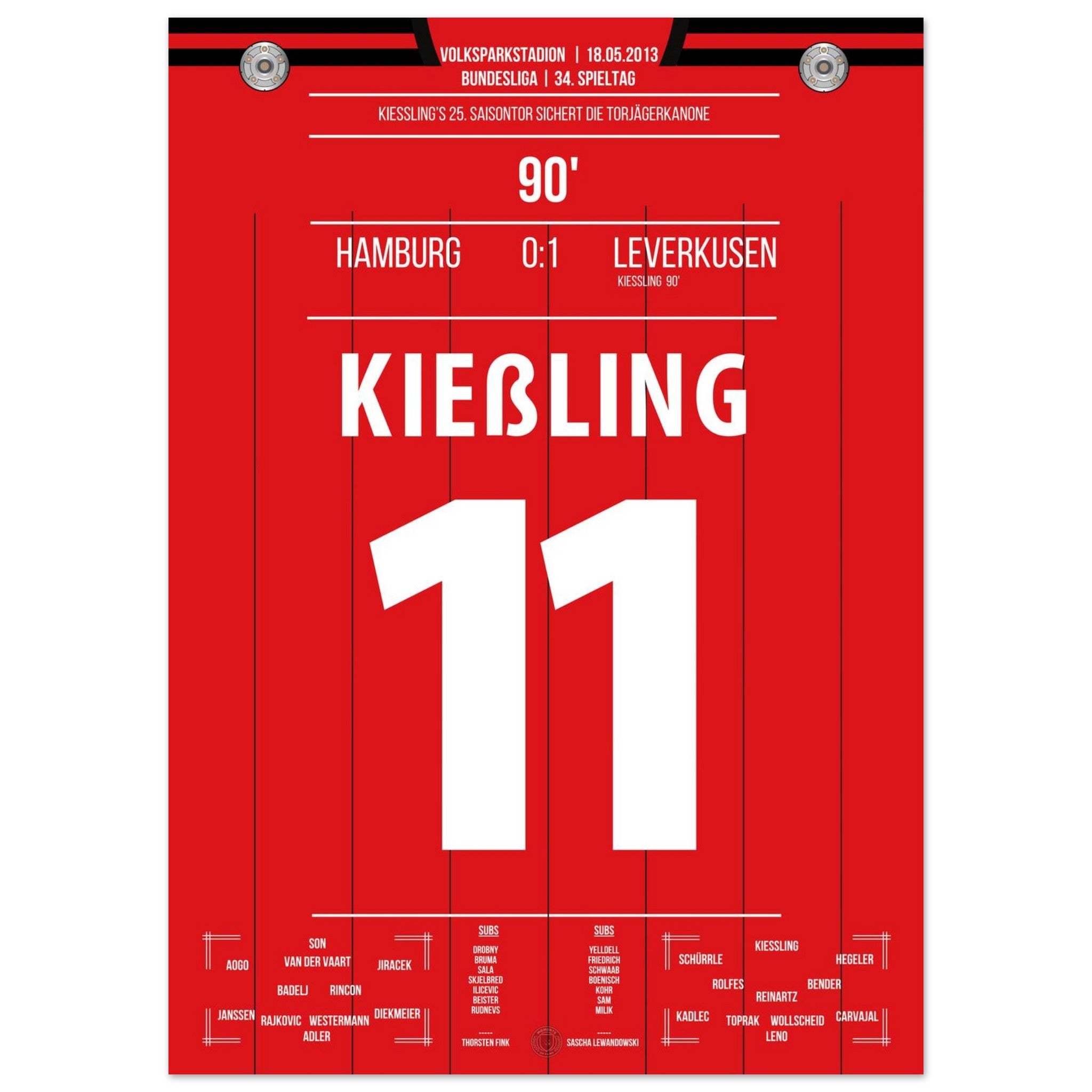 18. Mai 2013 – Hamburg vs. Leverkusen 0:1: In der 90. Minute trifft Stefan Kießling per Kopf und sichert Leverkusen mit seinem 25. Saisontor nicht nur den Sieg, sondern auch die Torjägerkanone. Ein eiskalter Abschluss in letzter Sekunde. Unser Poster verewigt diesen goldenen Kießling-Moment in Schwarz-Rot.