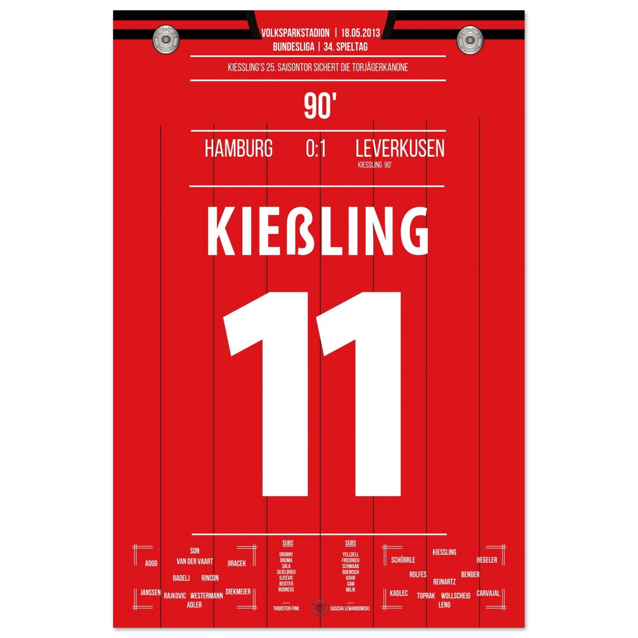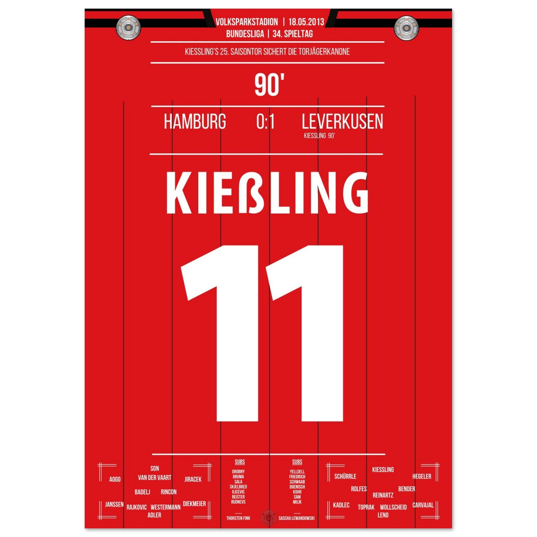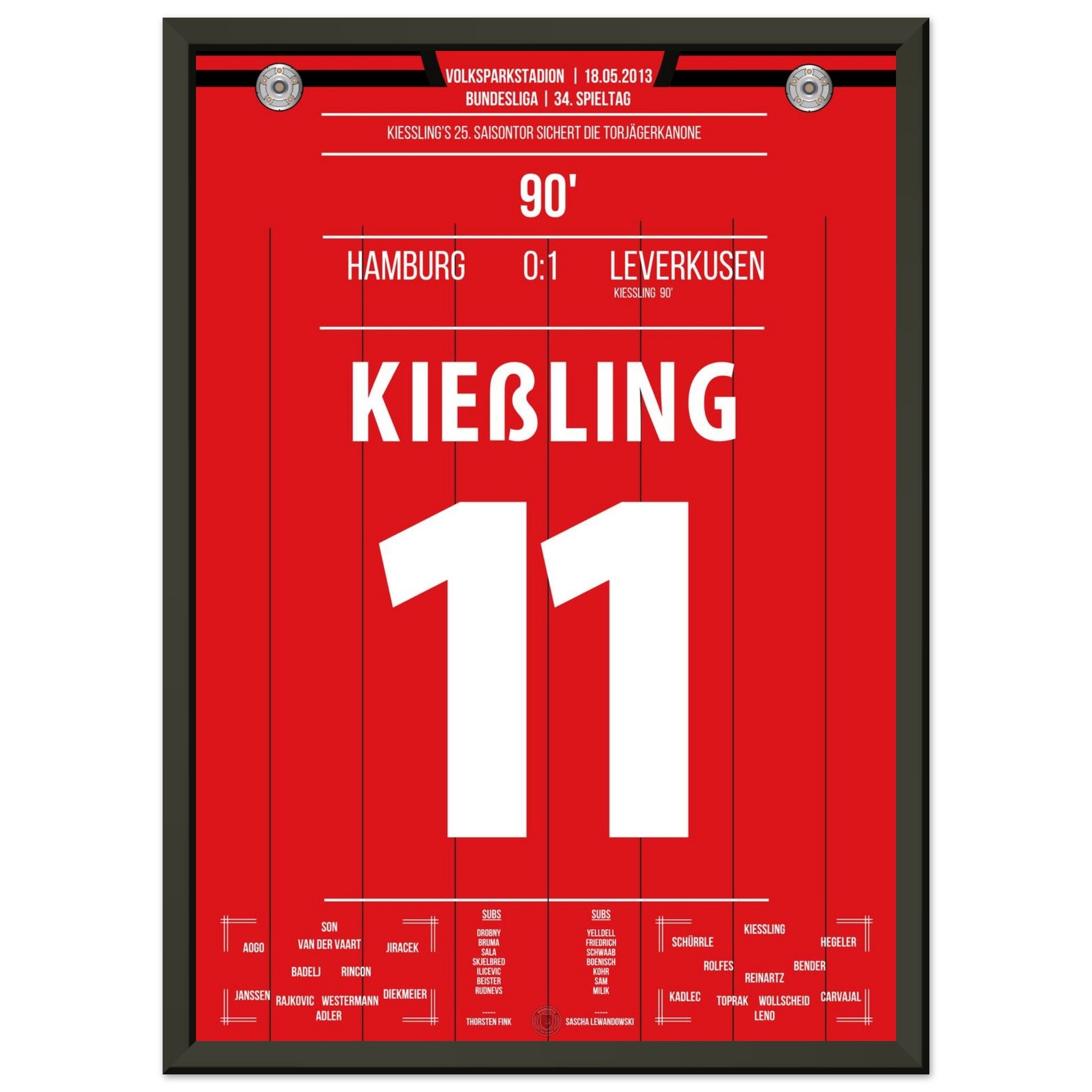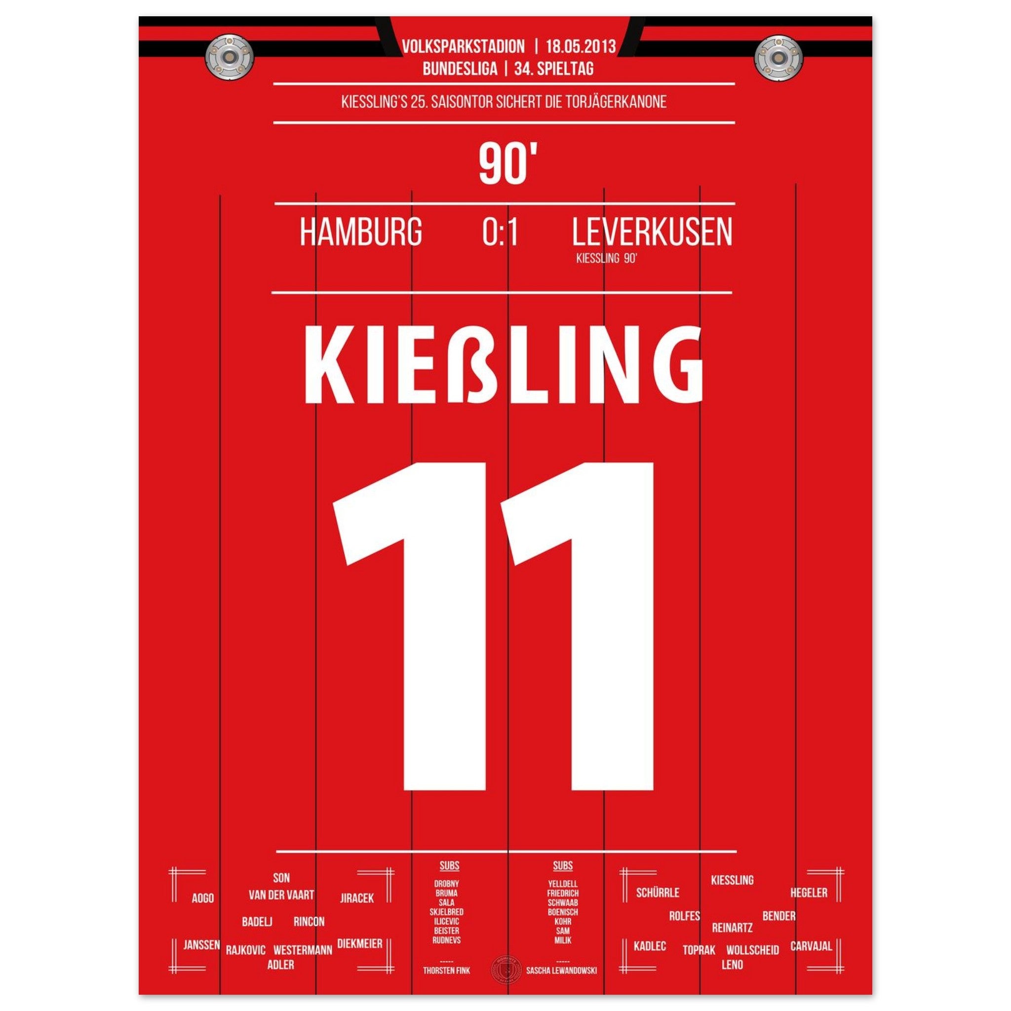 18. Mai 2013 – Hamburg vs. Leverkusen 0:1: In der 90. Minute trifft Stefan Kießling per Kopf und sichert Leverkusen mit seinem 25. Saisontor nicht nur den Sieg, sondern auch die Torjägerkanone. Ein eiskalter Abschluss in letzter Sekunde. Unser Poster verewigt diesen goldenen Kießling-Moment in Schwarz-Rot.