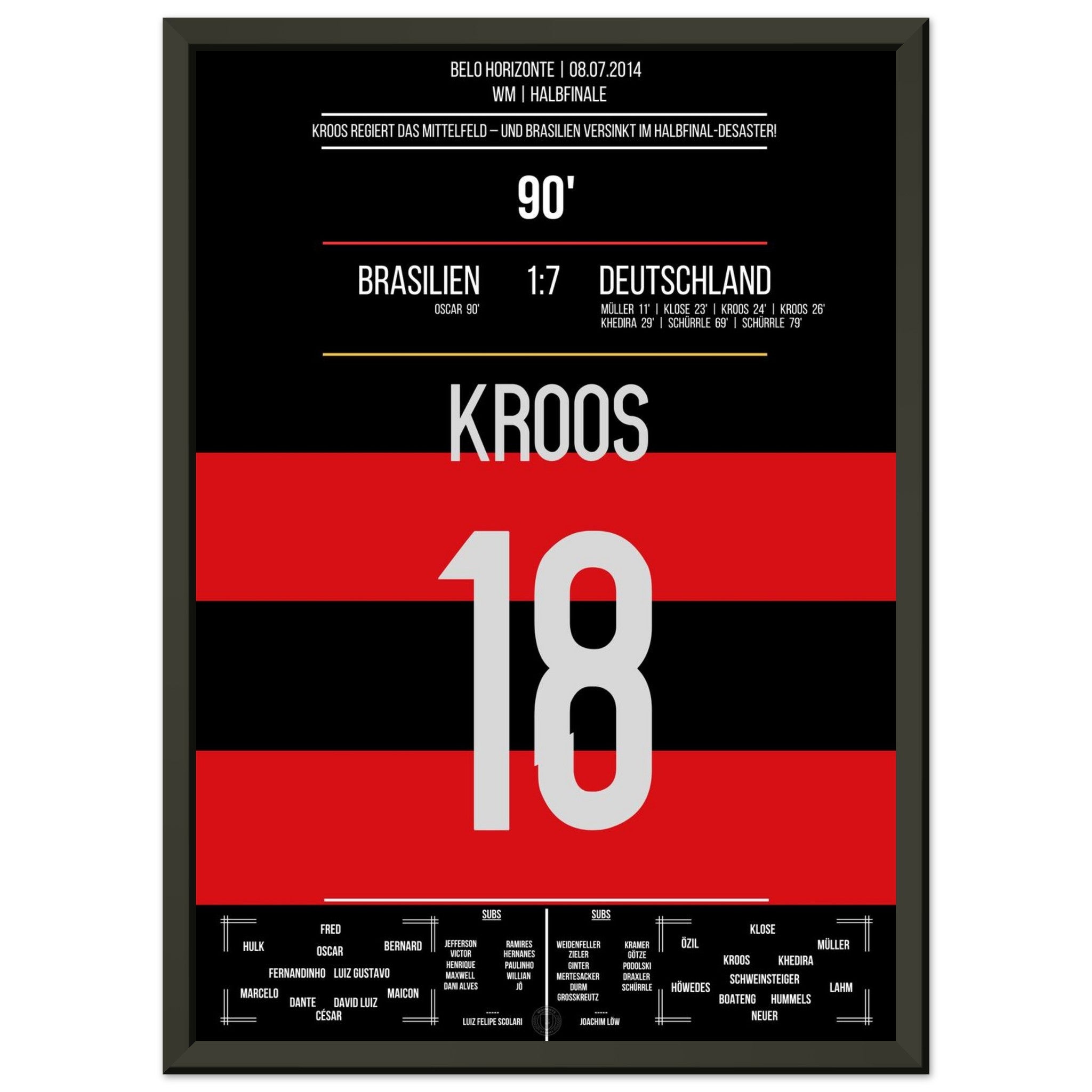 8. Juli 2014 – Brasilien vs. Deutschland 1:7: Toni Kroos schnürt innerhalb von 69 Sekunden einen Doppelpack und führt das DFB-Team zur legendären Halbfinal-Demontage des Gastgebers. Zwei Tore, ein Moment kollektiven Staunens – unser Poster verewigt Kroos' Meisterwerk beim 7:1 von Belo Horizonte.