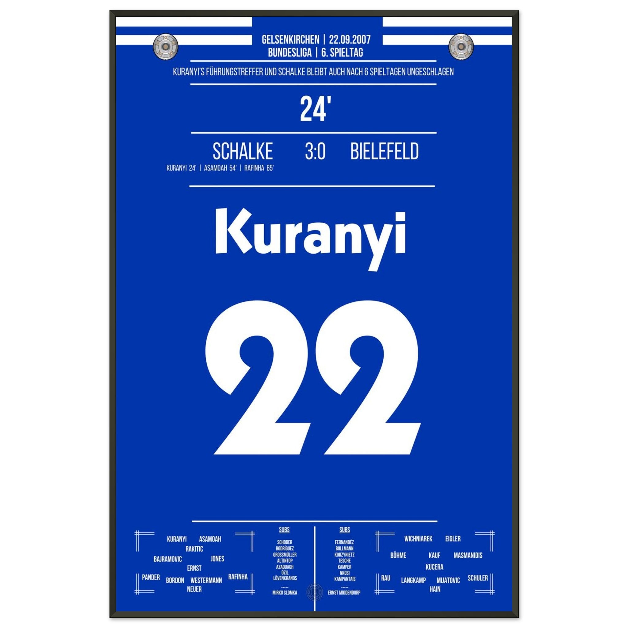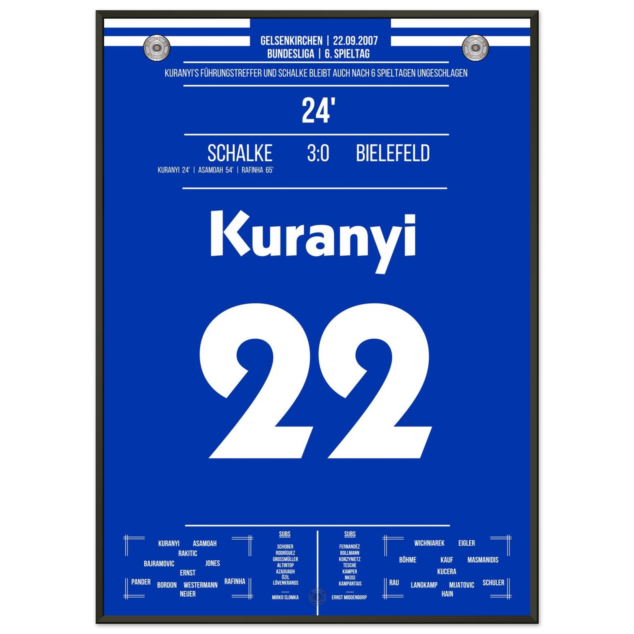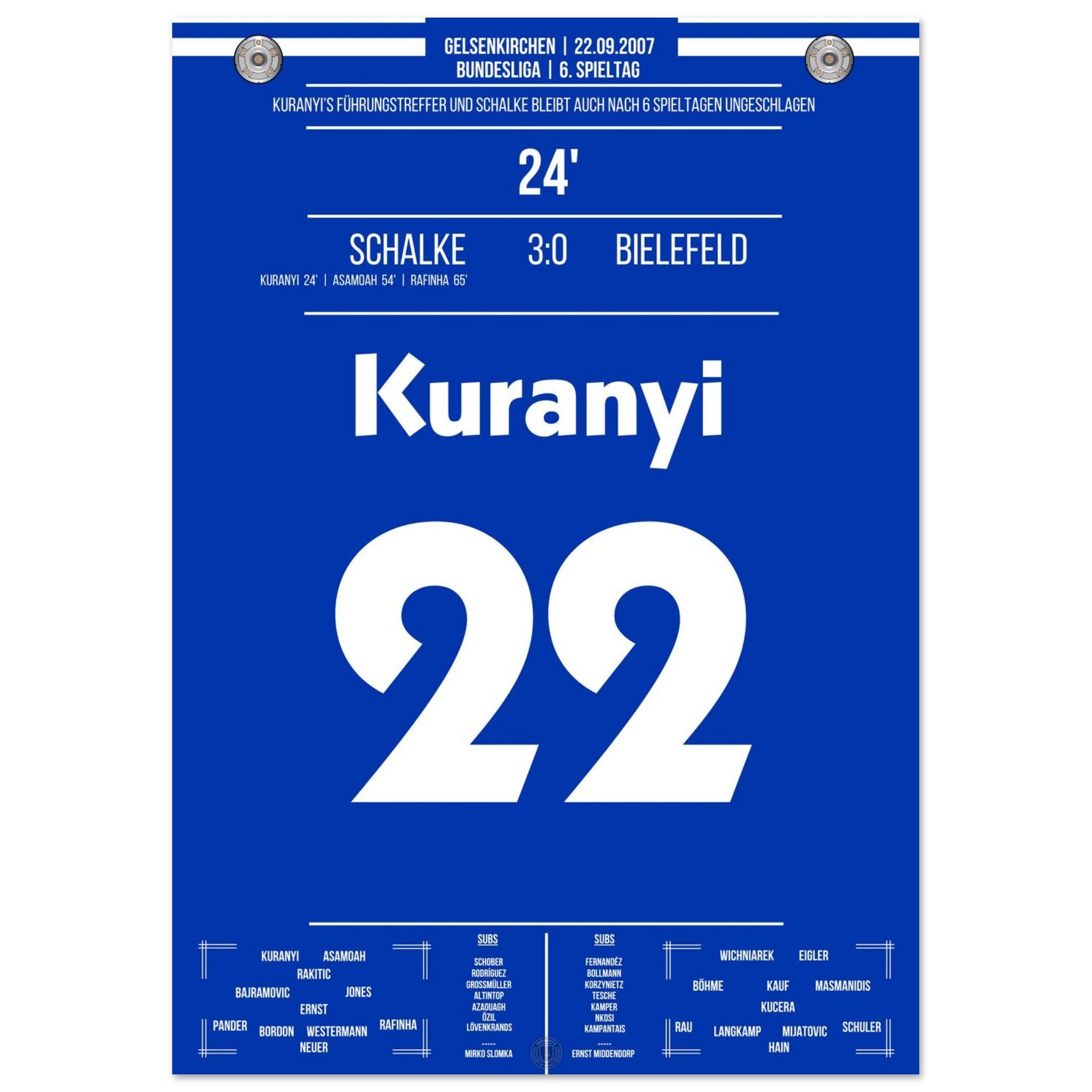 22. September 2007 – Schalke vs. Bielefeld 3:0: In der 24. Minute bringt Kevin Kurányi die Königsblauen per Kopf in Führung und eröffnet damit den souveränen Heimsieg gegen Bielefeld. Ein Treffer mit Ansage – voller Willen und Wucht. Unser Poster hält diesen Kurányi-Moment in Königsblau fest.