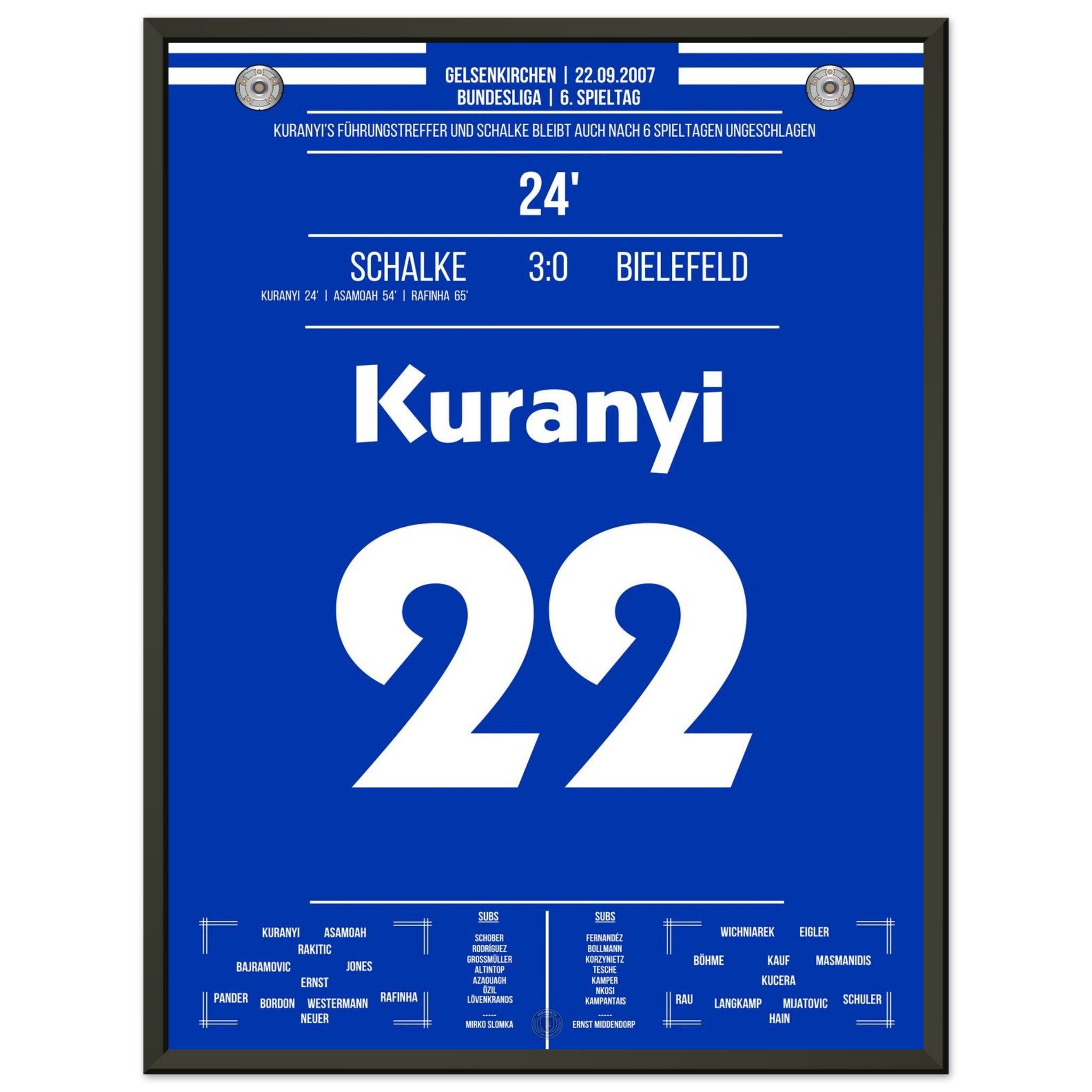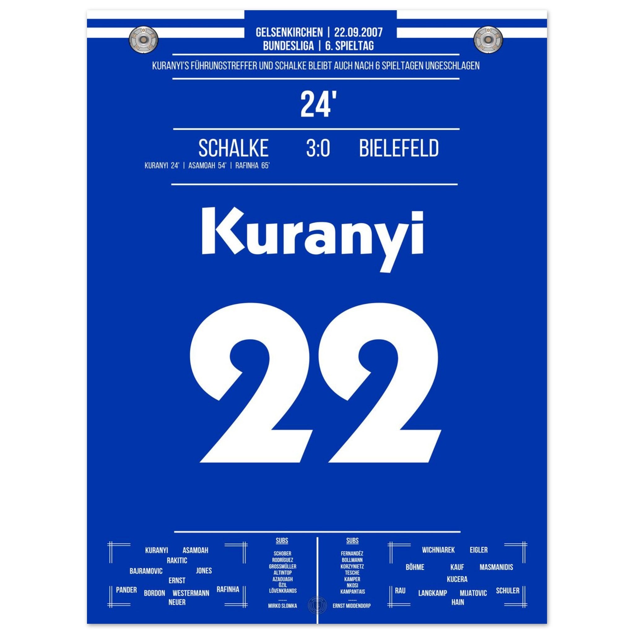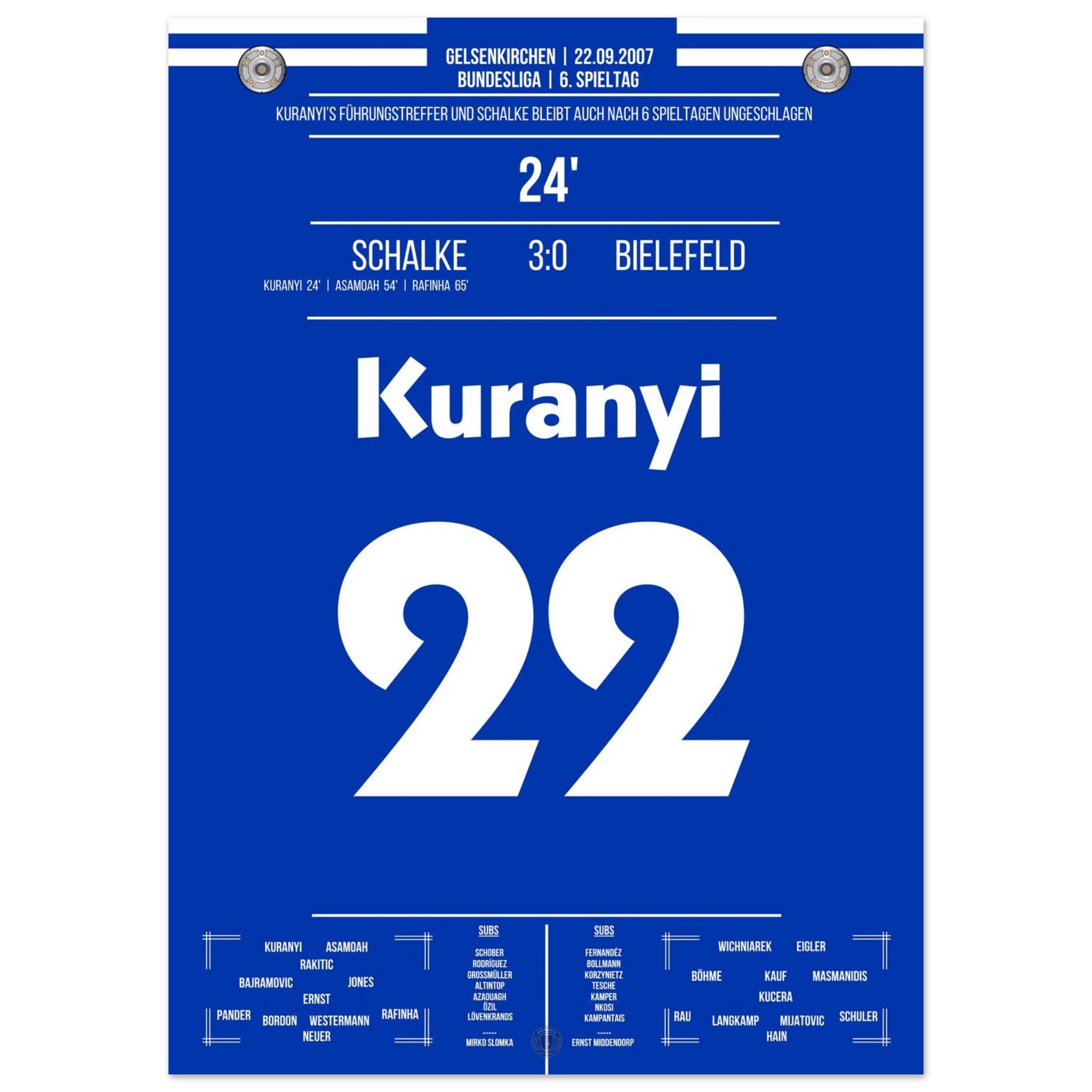 22. September 2007 – Schalke vs. Bielefeld 3:0: In der 24. Minute bringt Kevin Kurányi die Königsblauen per Kopf in Führung und eröffnet damit den souveränen Heimsieg gegen Bielefeld. Ein Treffer mit Ansage – voller Willen und Wucht. Unser Poster hält diesen Kurányi-Moment in Königsblau fest.