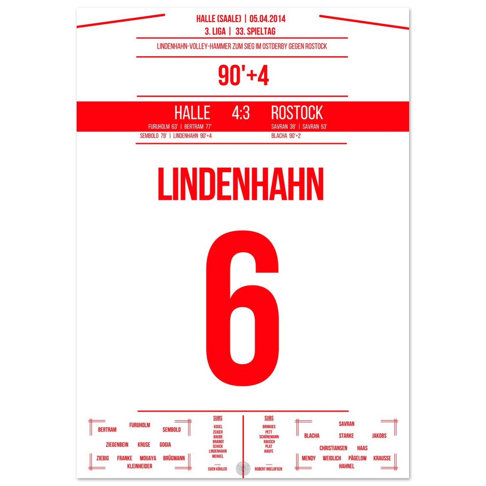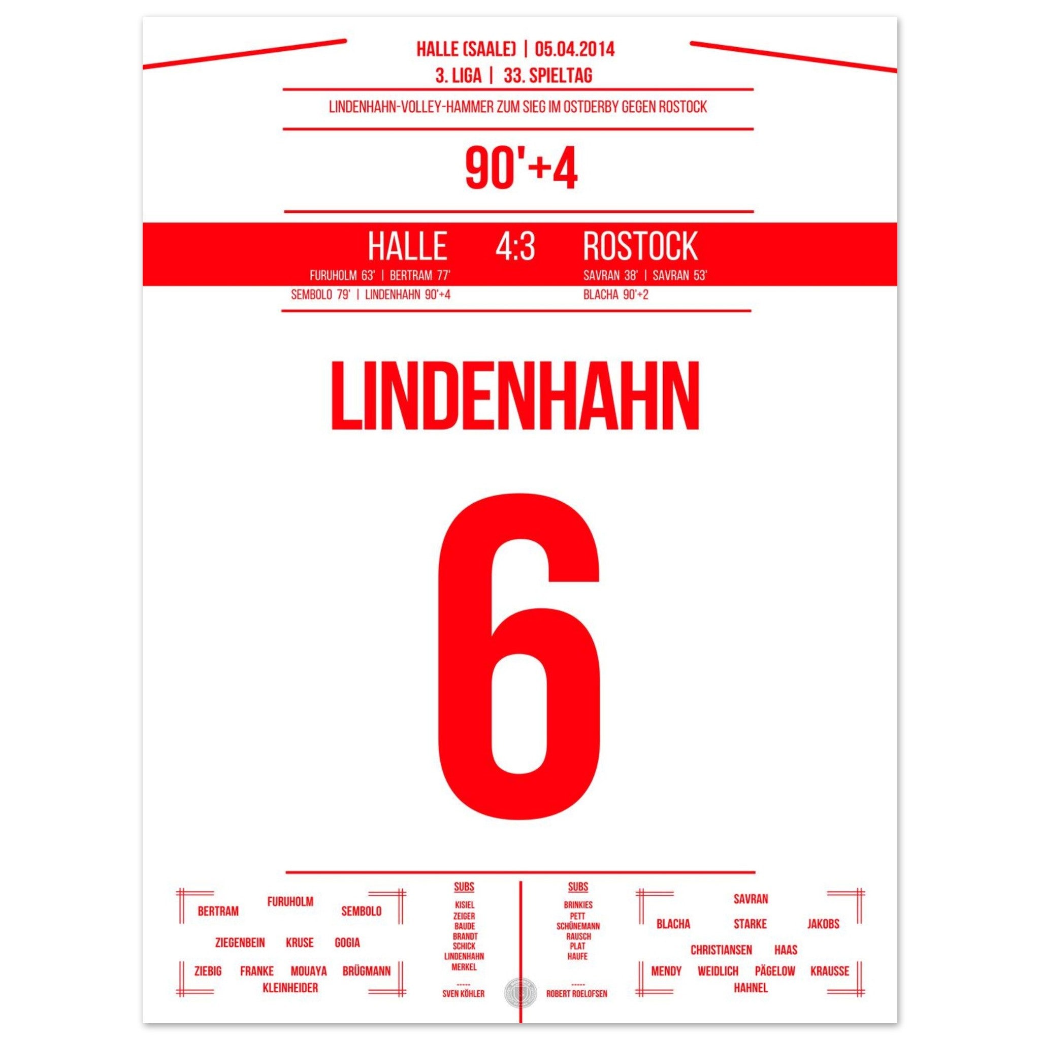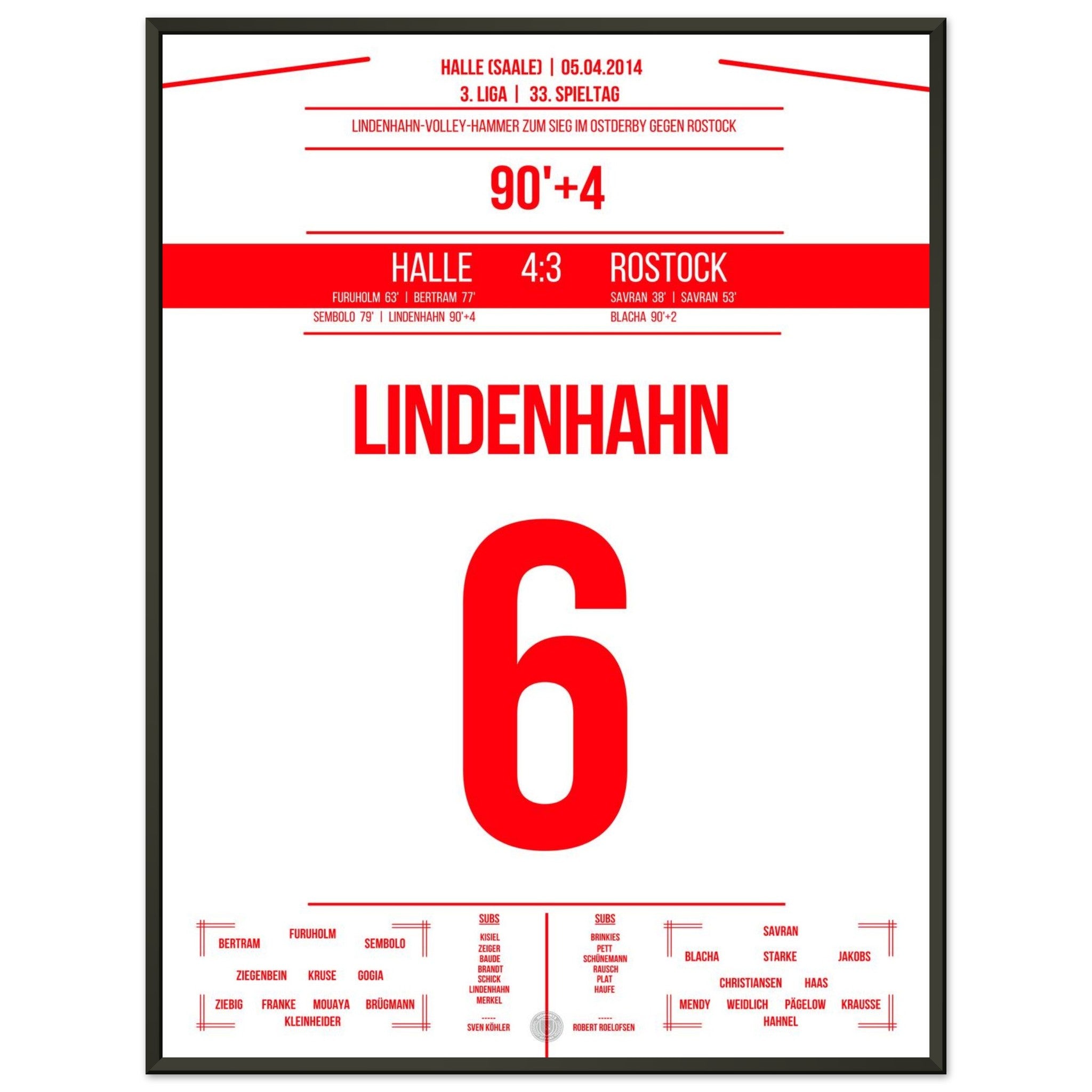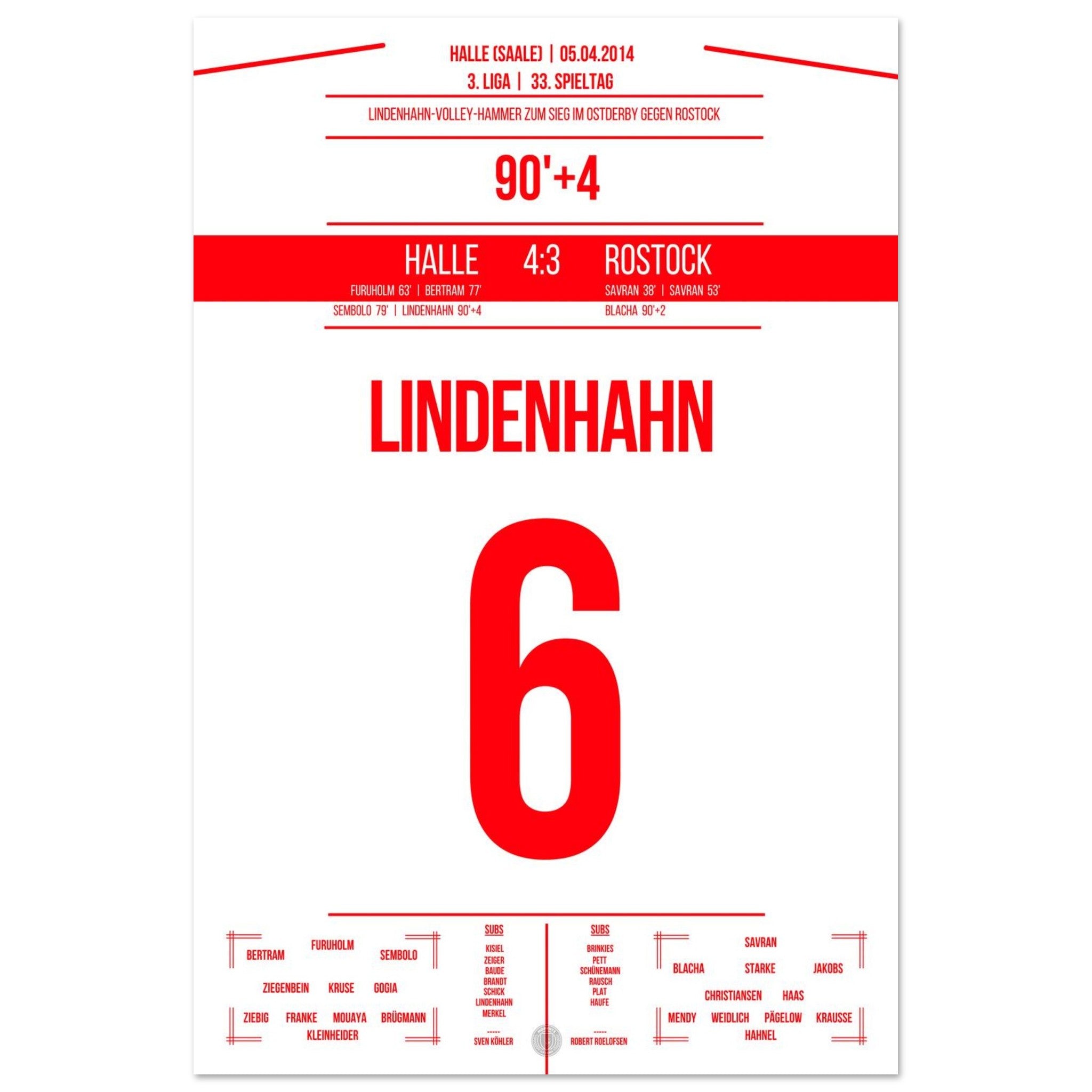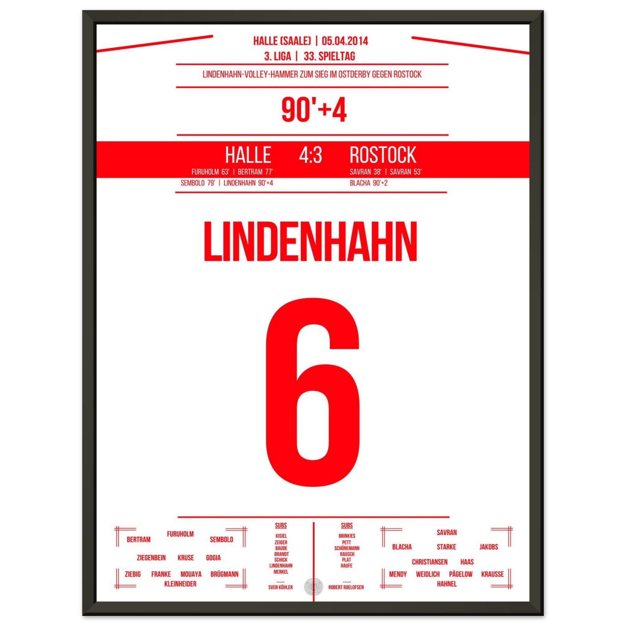 05. April 2014 – Halle vs. Rostock 4:3: In der 94. Minute trifft Toni Lindenhahn per Traumtor und sichert Halle am 33. Spieltag den Sieg im Ostderby in der 3. Liga. Ein emotionaler Gänsehautmoment, der das Stadion explodieren lässt. Unser Poster fängt diesen Treffer für alle Zeiten ein.