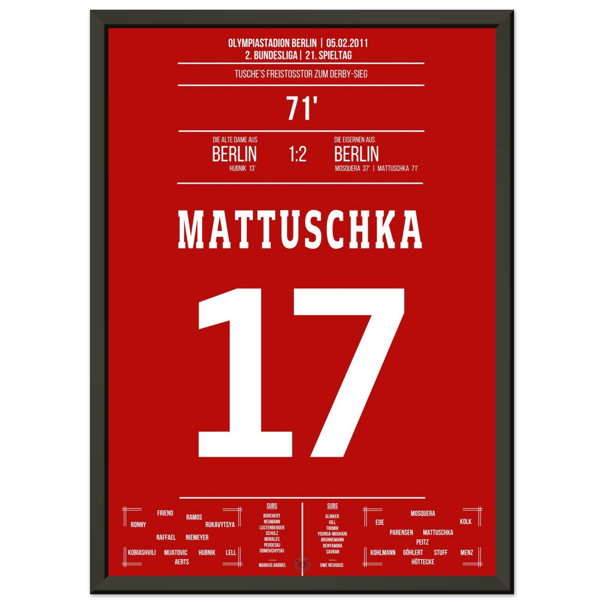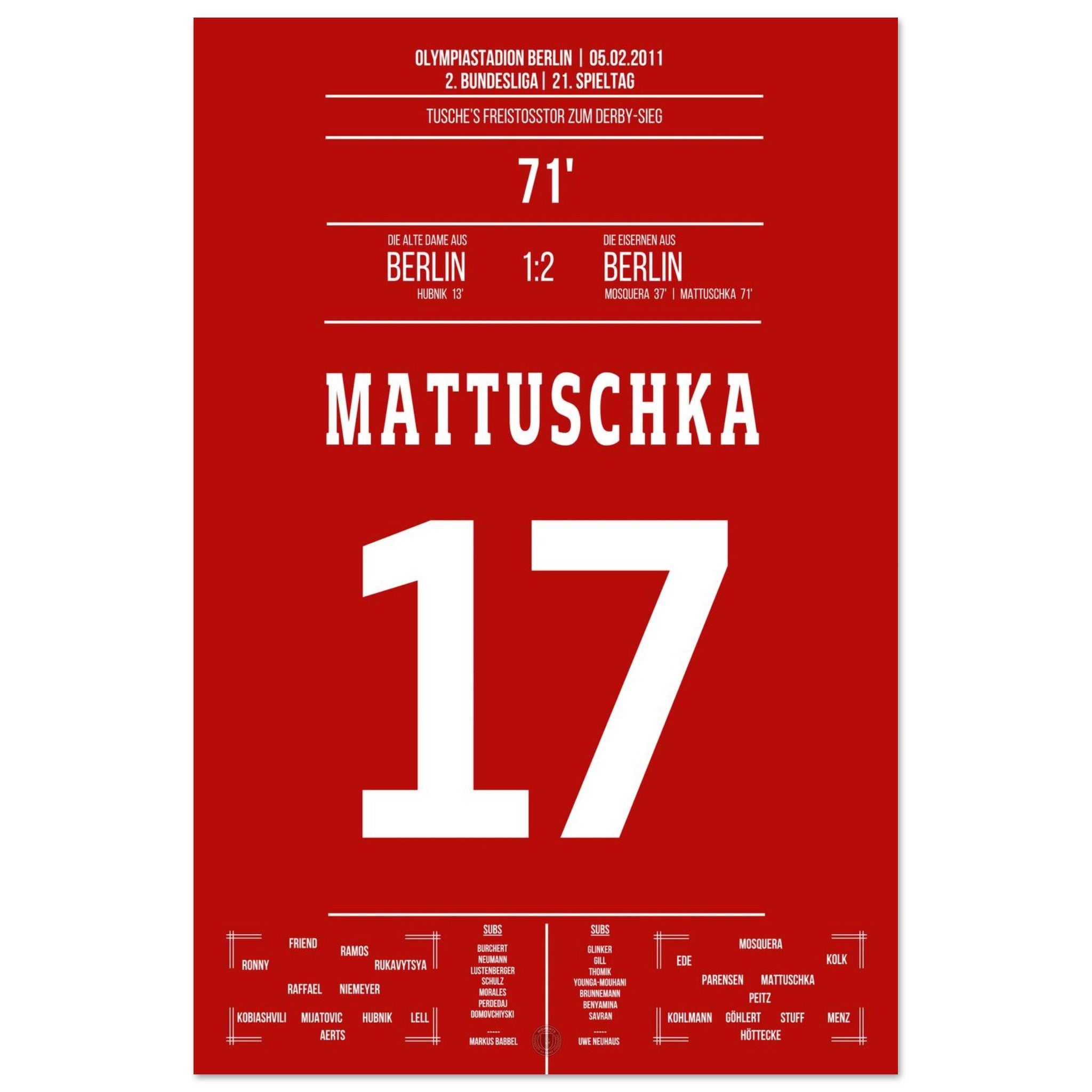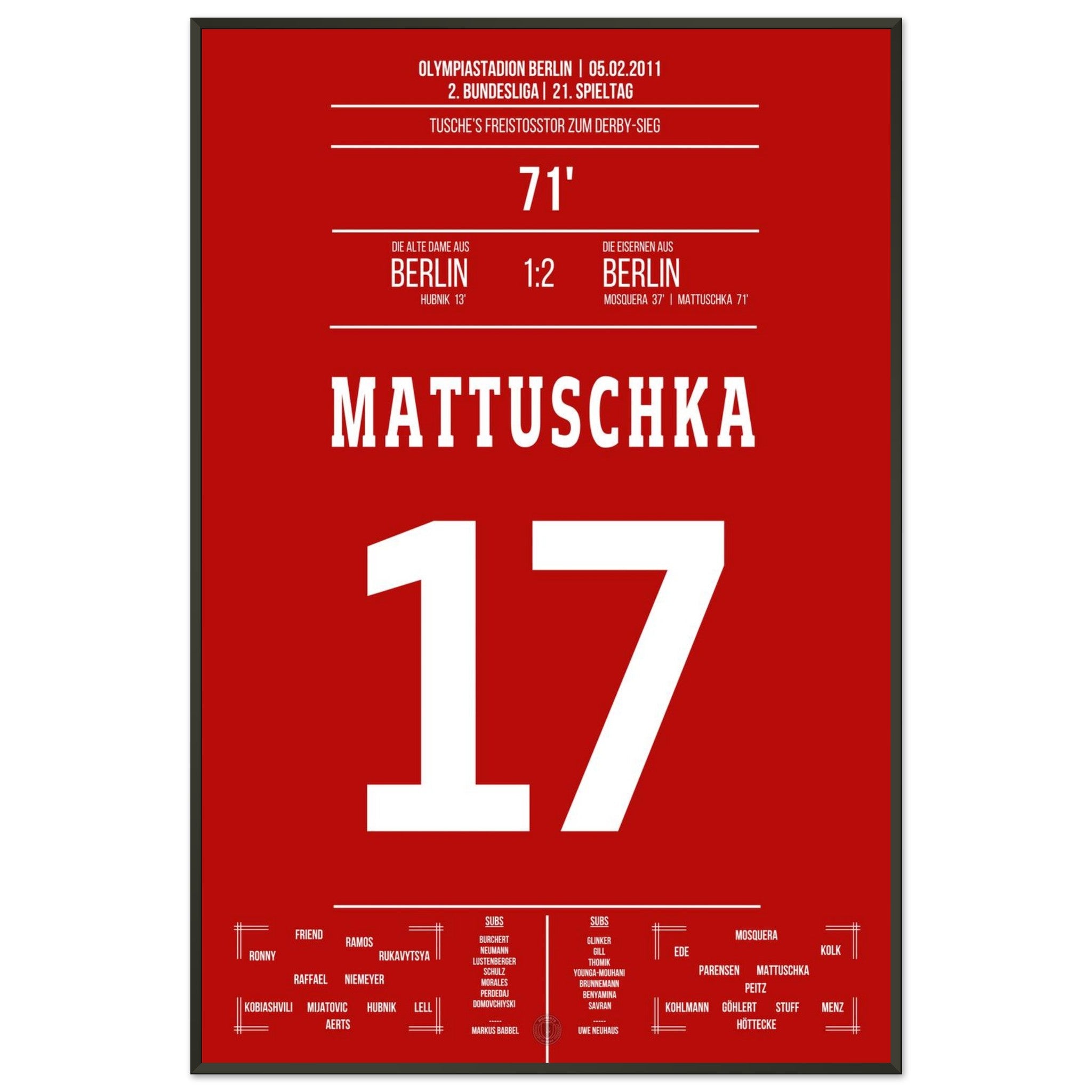 5. Februar 2011 – Herha vs. Union 1:2: In der 71. Minute übernimmt Kapitän Thorsten Mattuschka Verantwortung und haut einen Freistoß aus 25 Metern unhaltbar ins Netz – das Siegtor im packenden Derby. Ein echter Mattuschka-Moment voller Willen, Technik und Emotion. Unser Poster hält diesen legendären Treffer für alle Fans der Eisernen fest.
