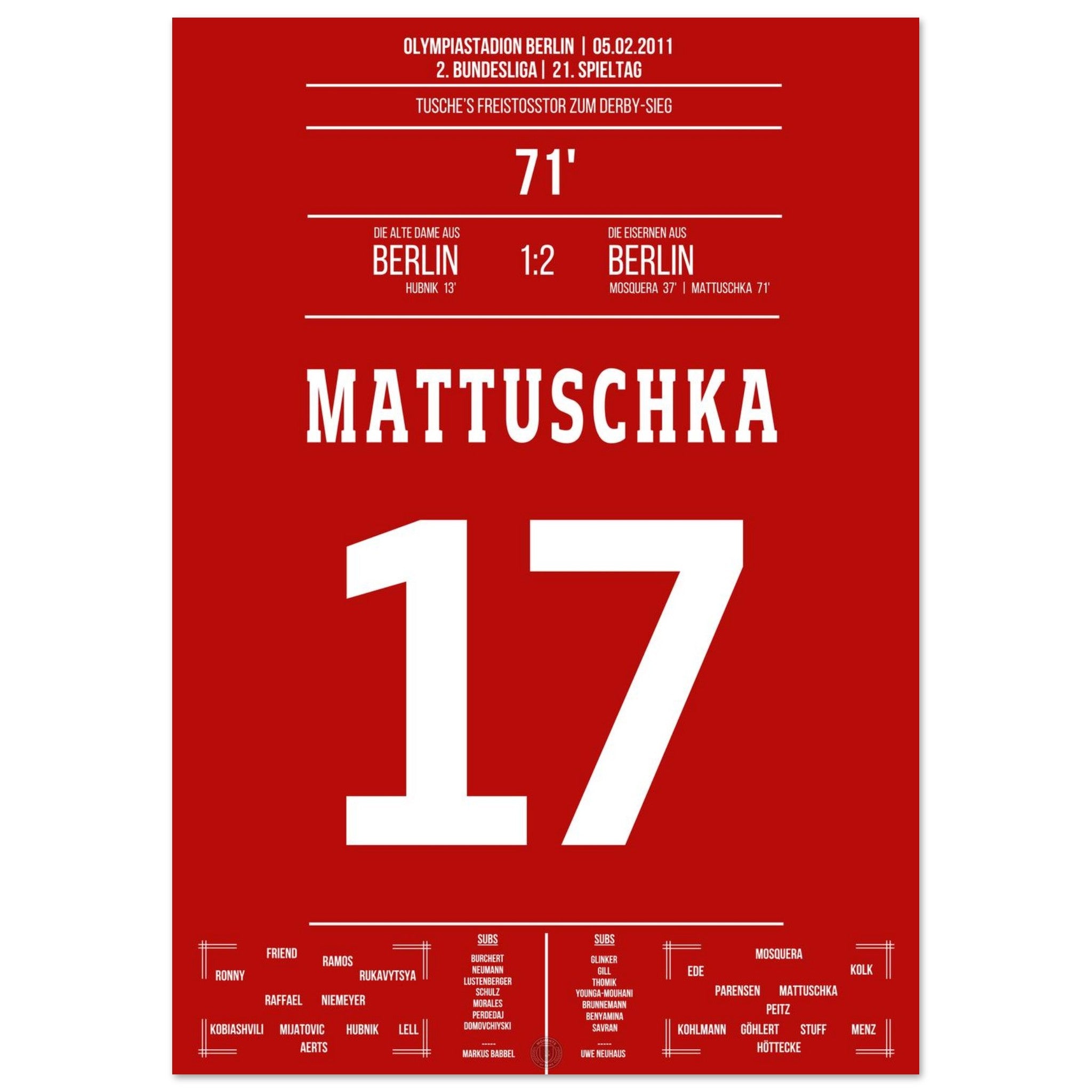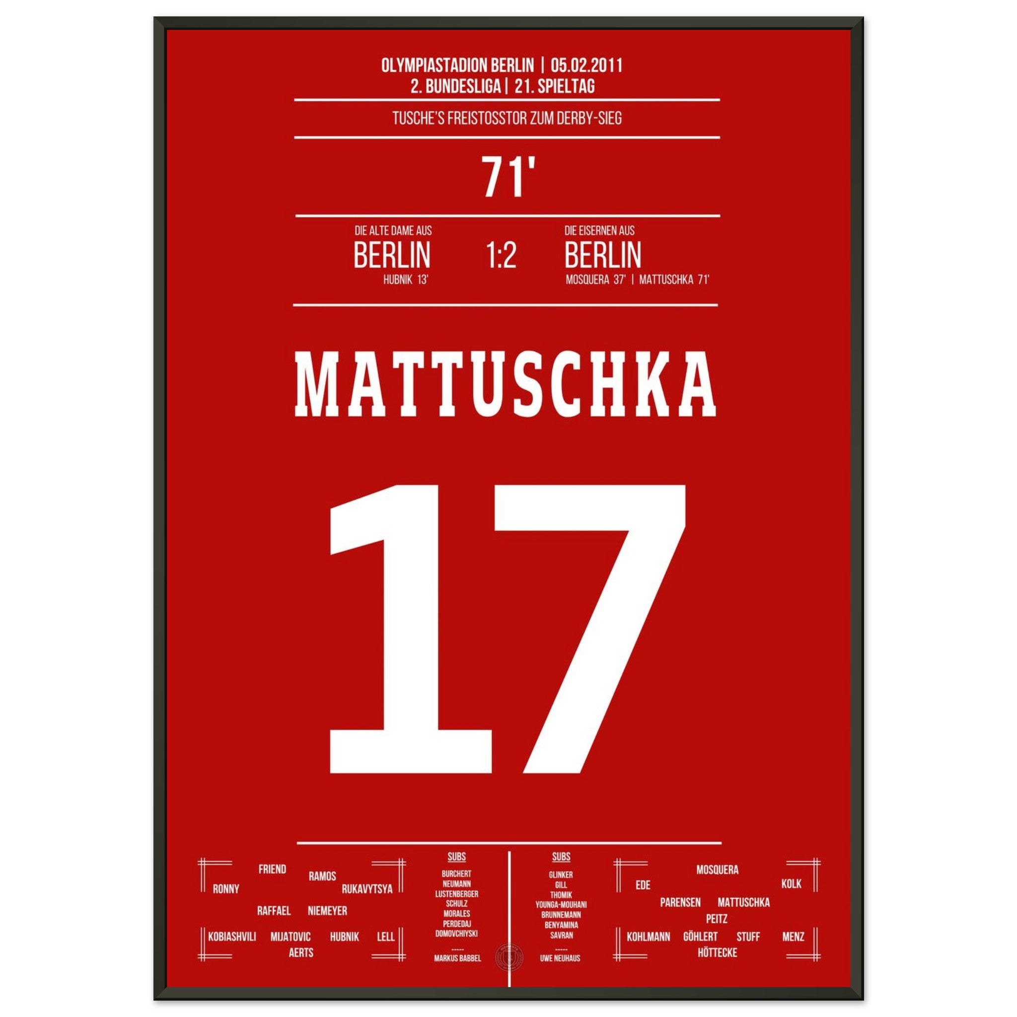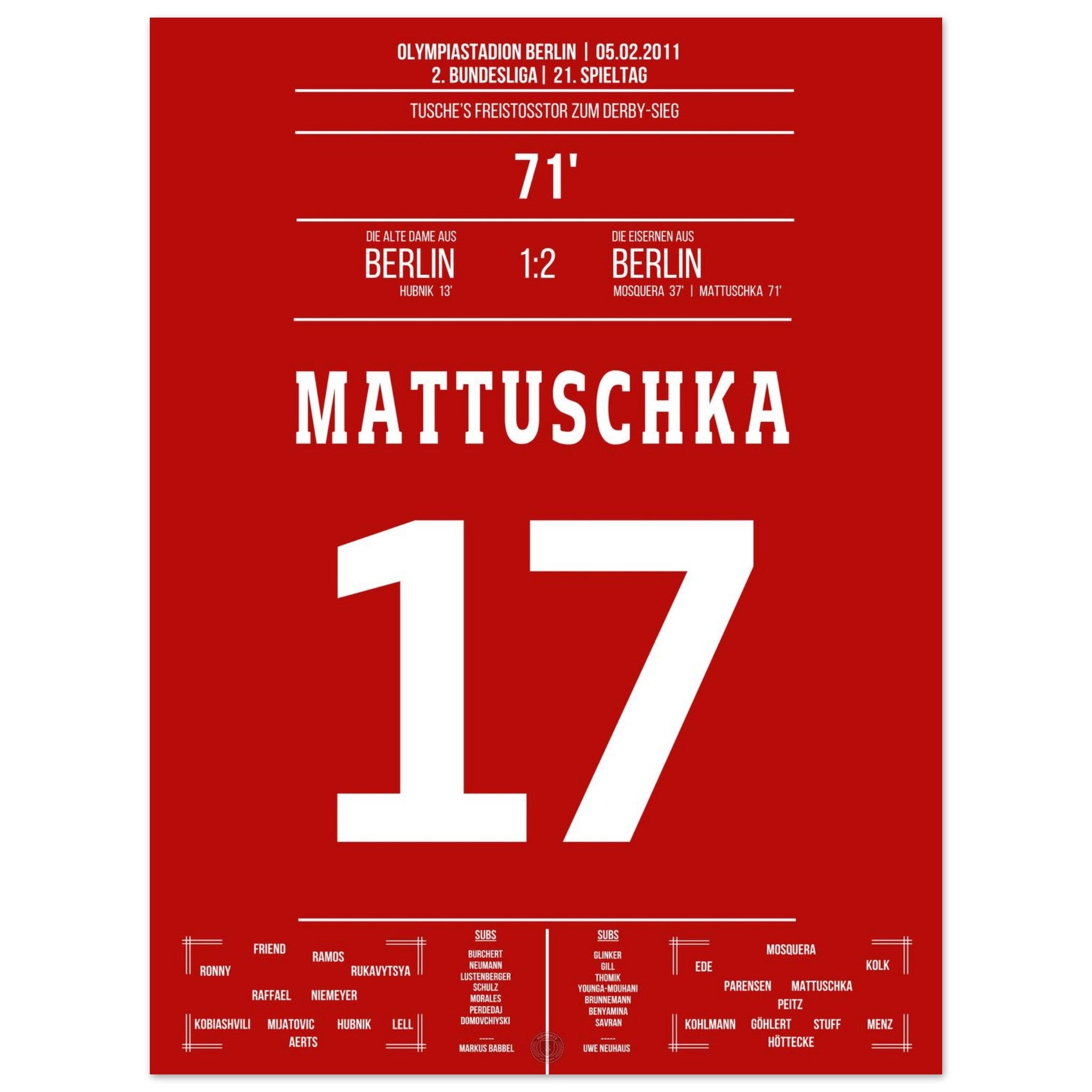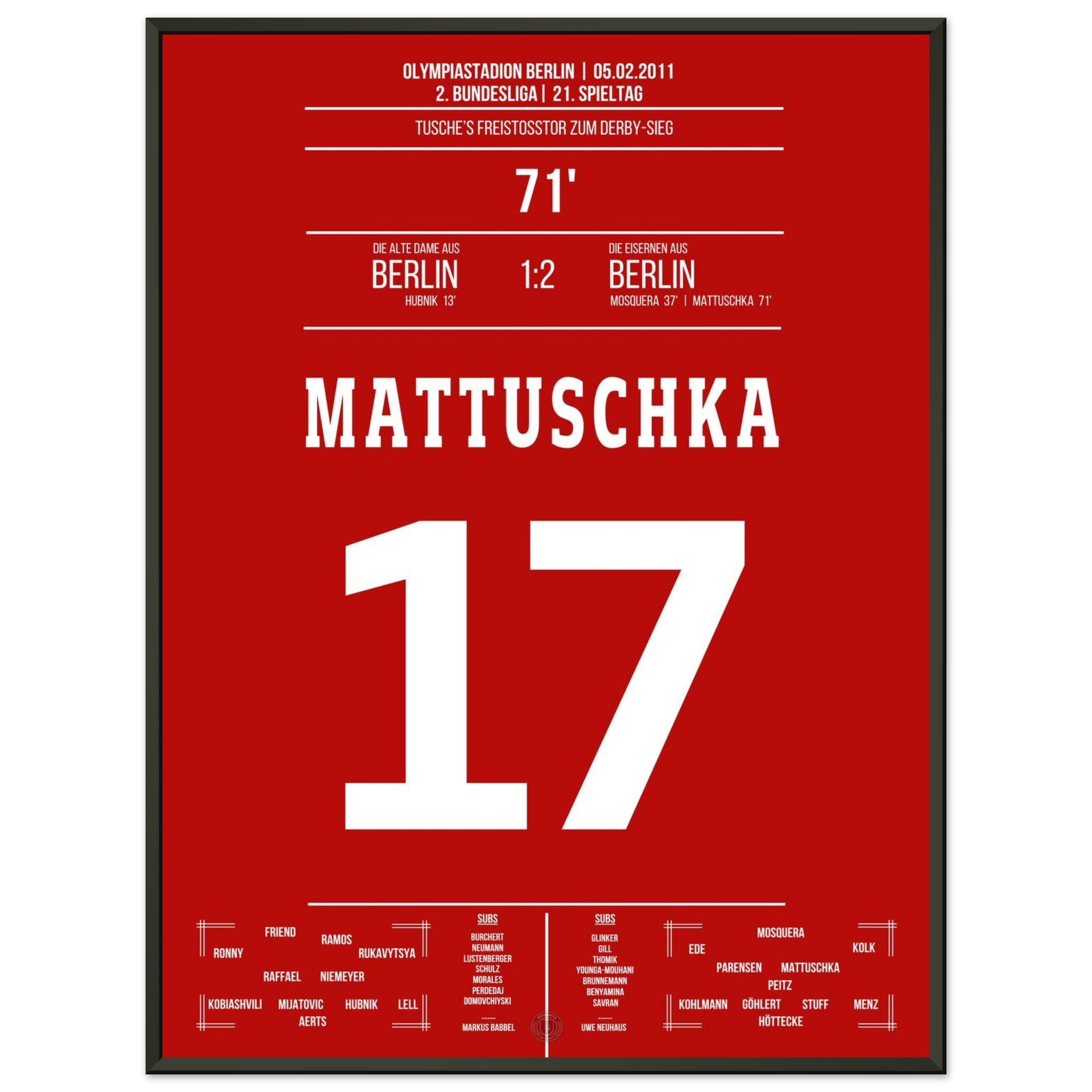 5. Februar 2011 – Herha vs. Union 1:2: In der 71. Minute übernimmt Kapitän Thorsten Mattuschka Verantwortung und haut einen Freistoß aus 25 Metern unhaltbar ins Netz – das Siegtor im packenden Derby. Ein echter Mattuschka-Moment voller Willen, Technik und Emotion. Unser Poster hält diesen legendären Treffer für alle Fans der Eisernen fest.
