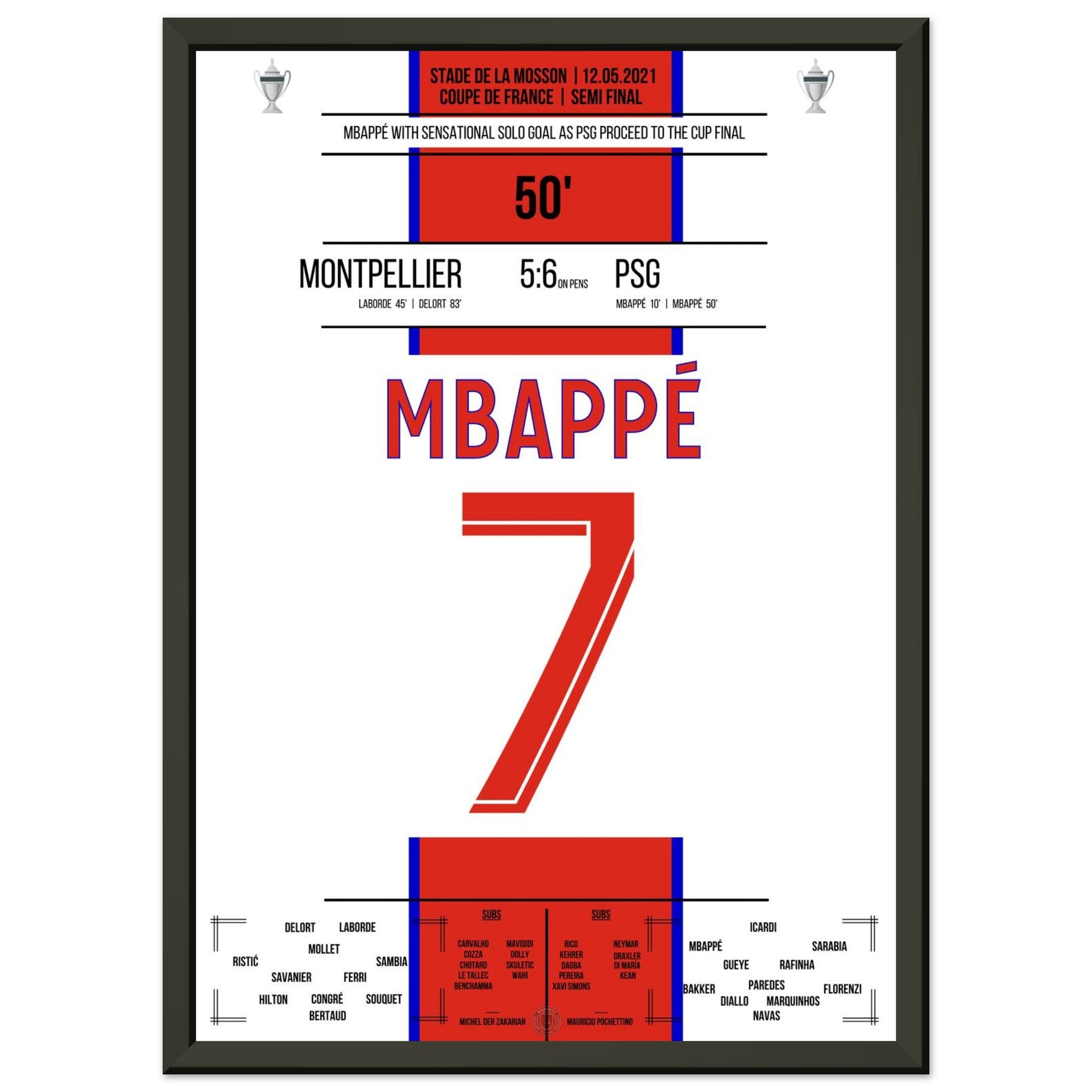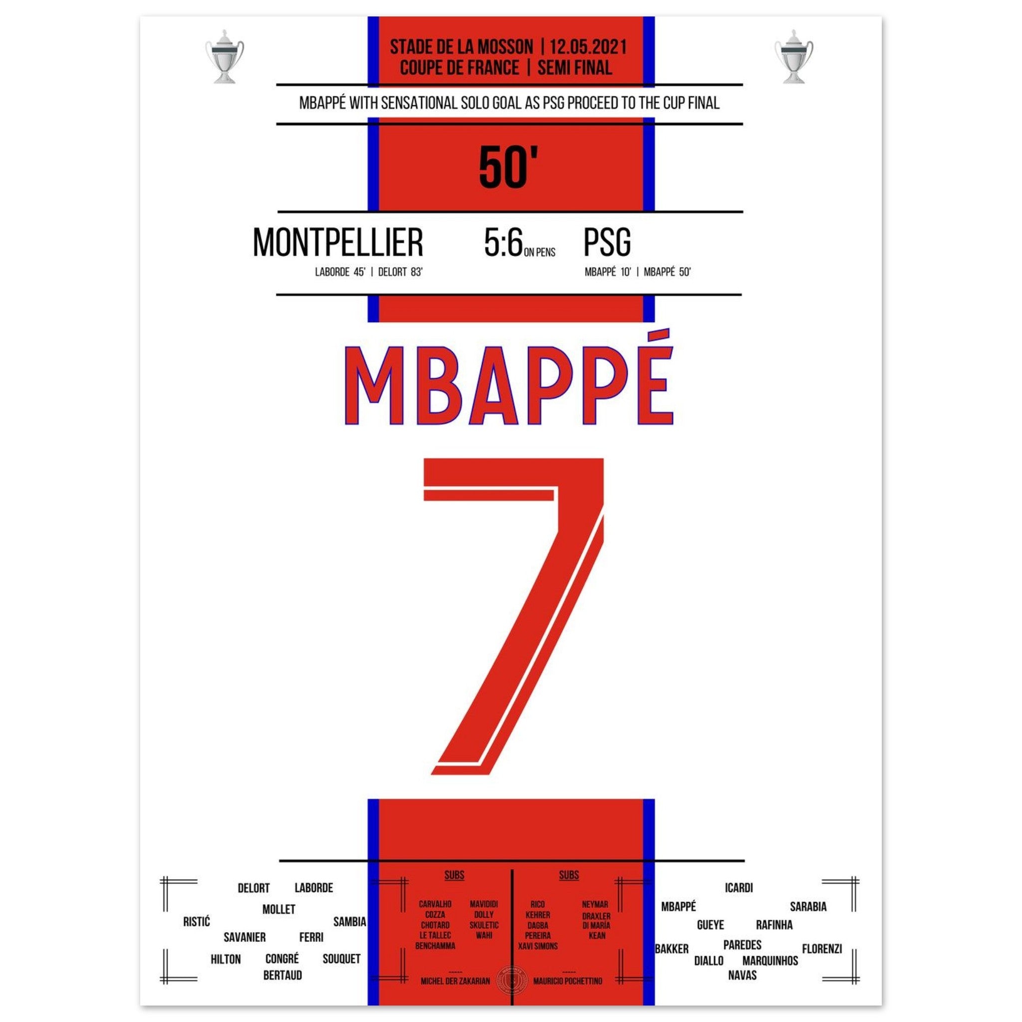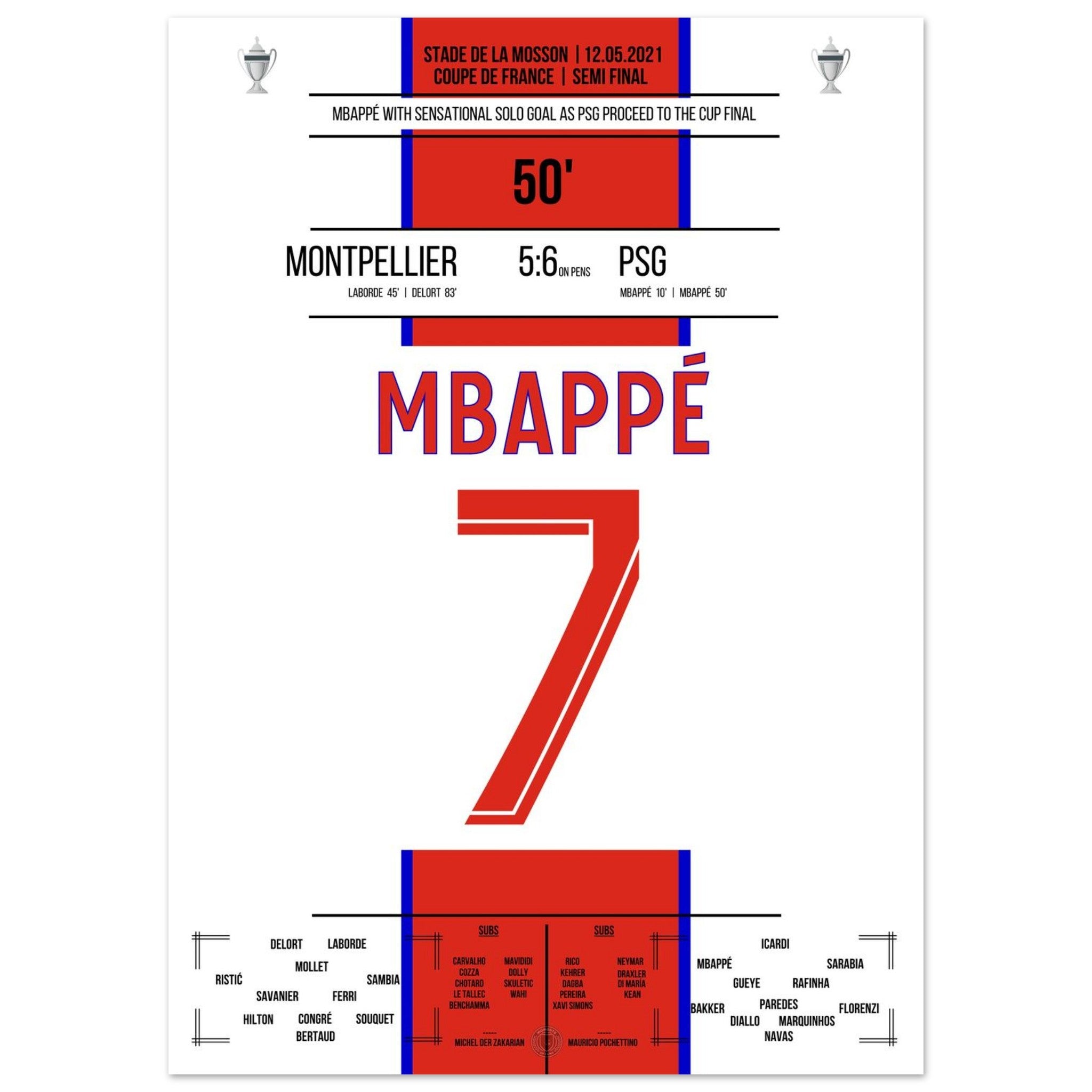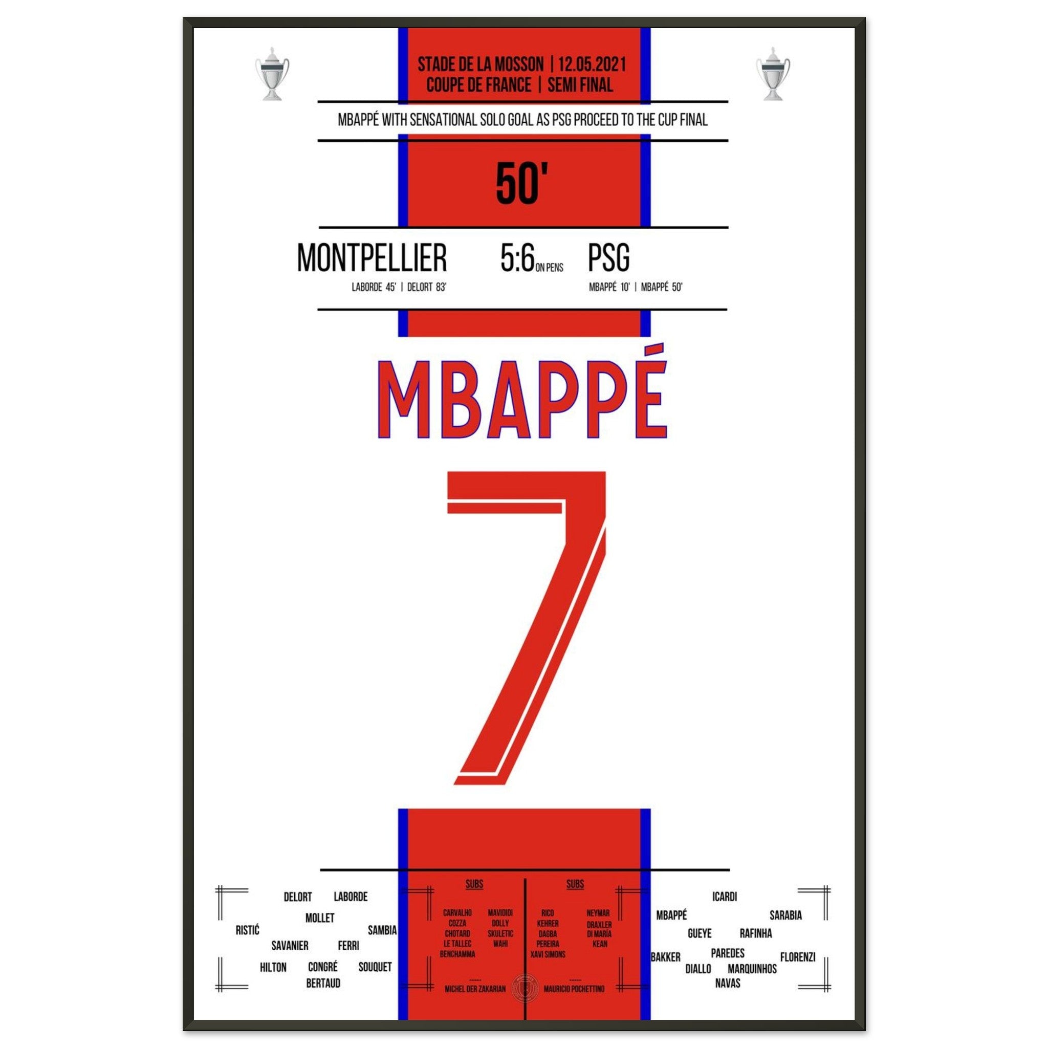 12. Mai 2021 Montpellier - Paris: An diesem Tag lieferten sich Montpellier und Paris im Pokal-Halbfinale ein packendes Duell. Nach regulärer Spielzeit stand es 2:2 – auch dank eines Treffers von Kylian Mbappé in der 50. Minute, der mit einem Solo die PSG-Führung besorgte. Im anschließenden Elfmeterschießen behielt Paris die Nerven und siegte mit 6:5. Ein weiterer Schritt auf dem Weg zum Pokaltitel – mit einem überragenden Mbappé als Antreiber.