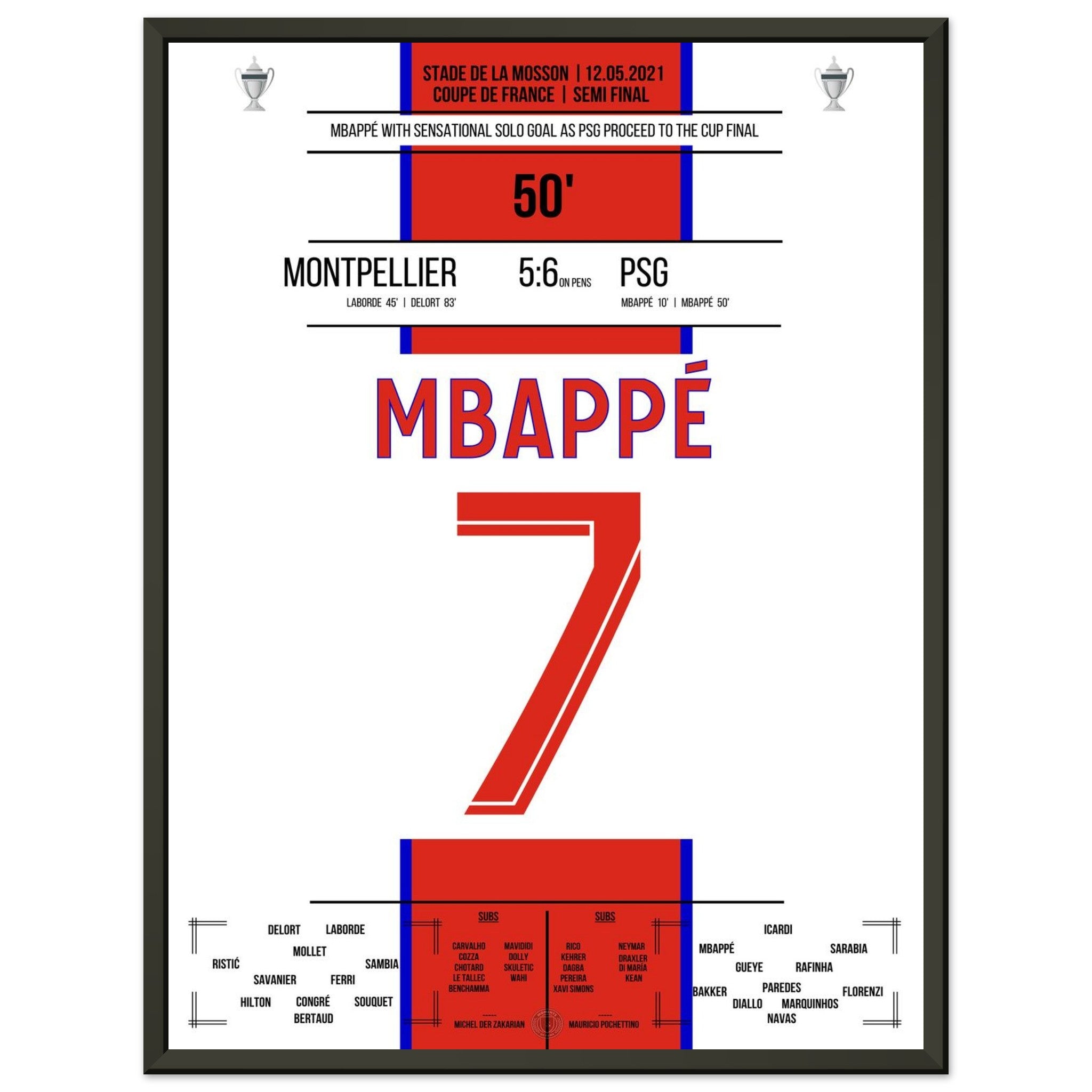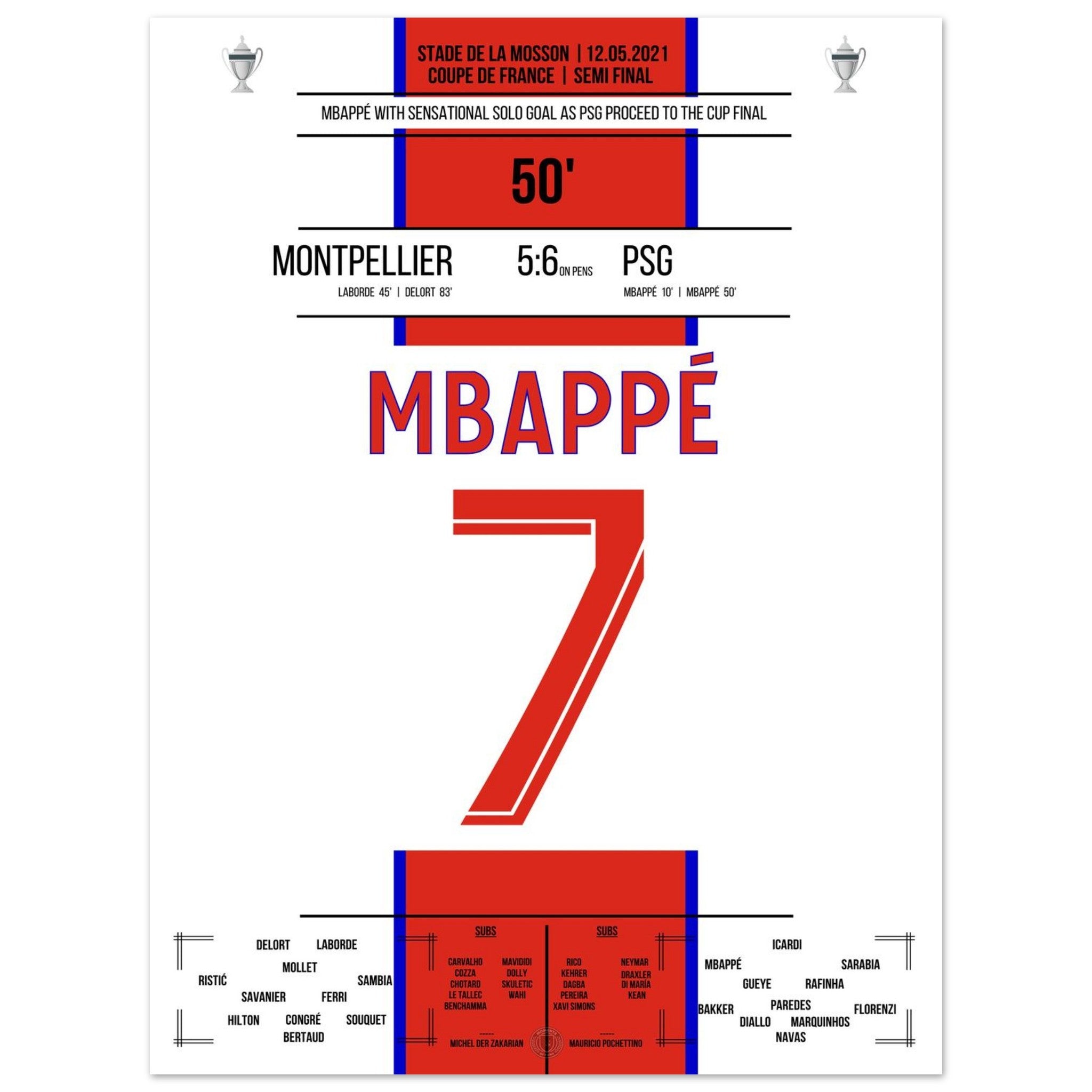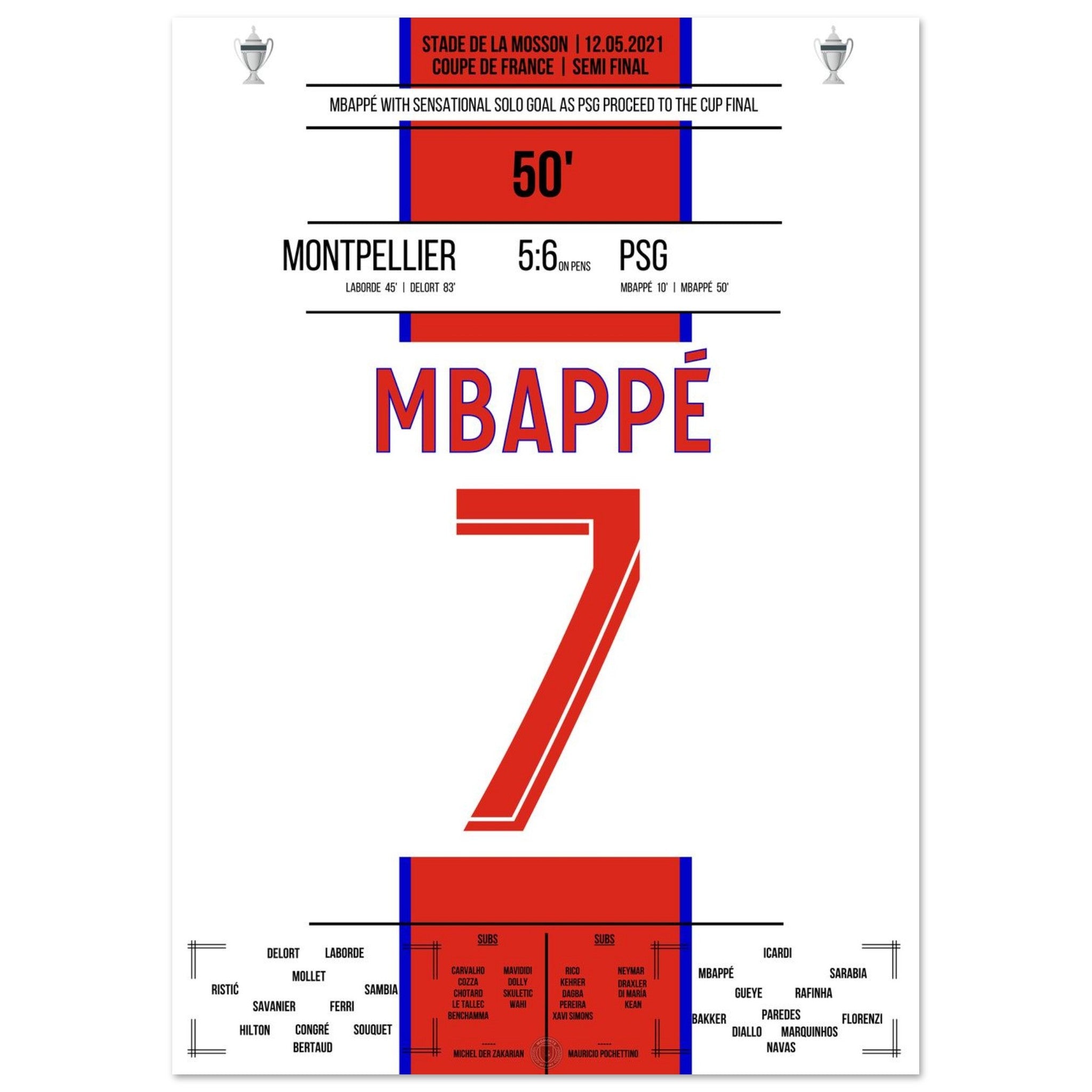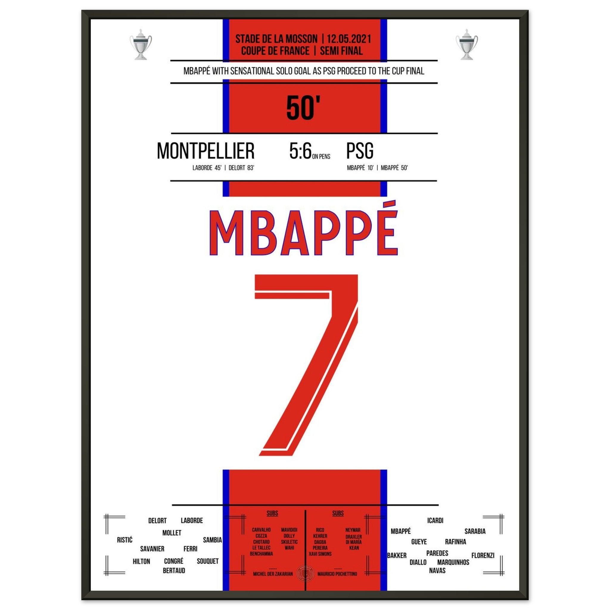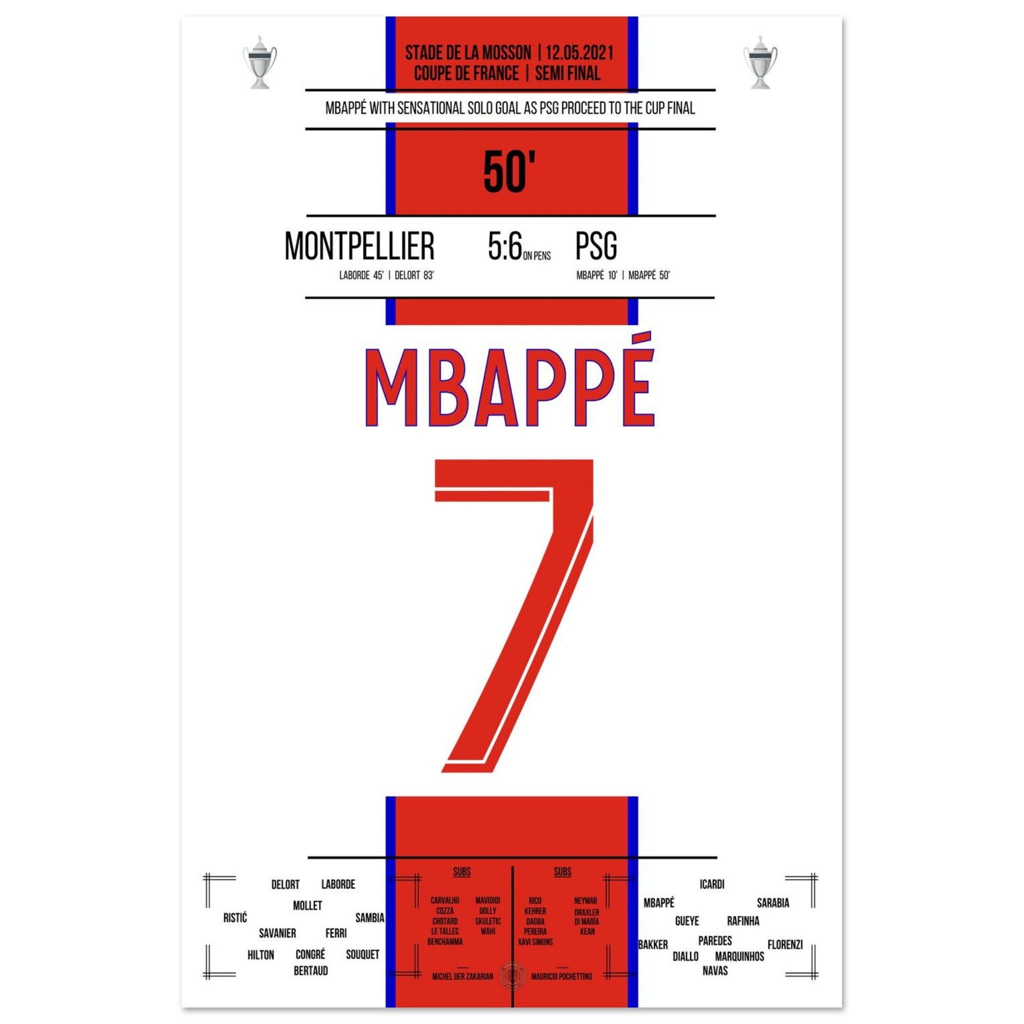 12. Mai 2021 Montpellier - Paris: An diesem Tag lieferten sich Montpellier und Paris im Pokal-Halbfinale ein packendes Duell. Nach regulärer Spielzeit stand es 2:2 – auch dank eines Treffers von Kylian Mbappé in der 50. Minute, der mit einem Solo die PSG-Führung besorgte. Im anschließenden Elfmeterschießen behielt Paris die Nerven und siegte mit 6:5. Ein weiterer Schritt auf dem Weg zum Pokaltitel – mit einem überragenden Mbappé als Antreiber.