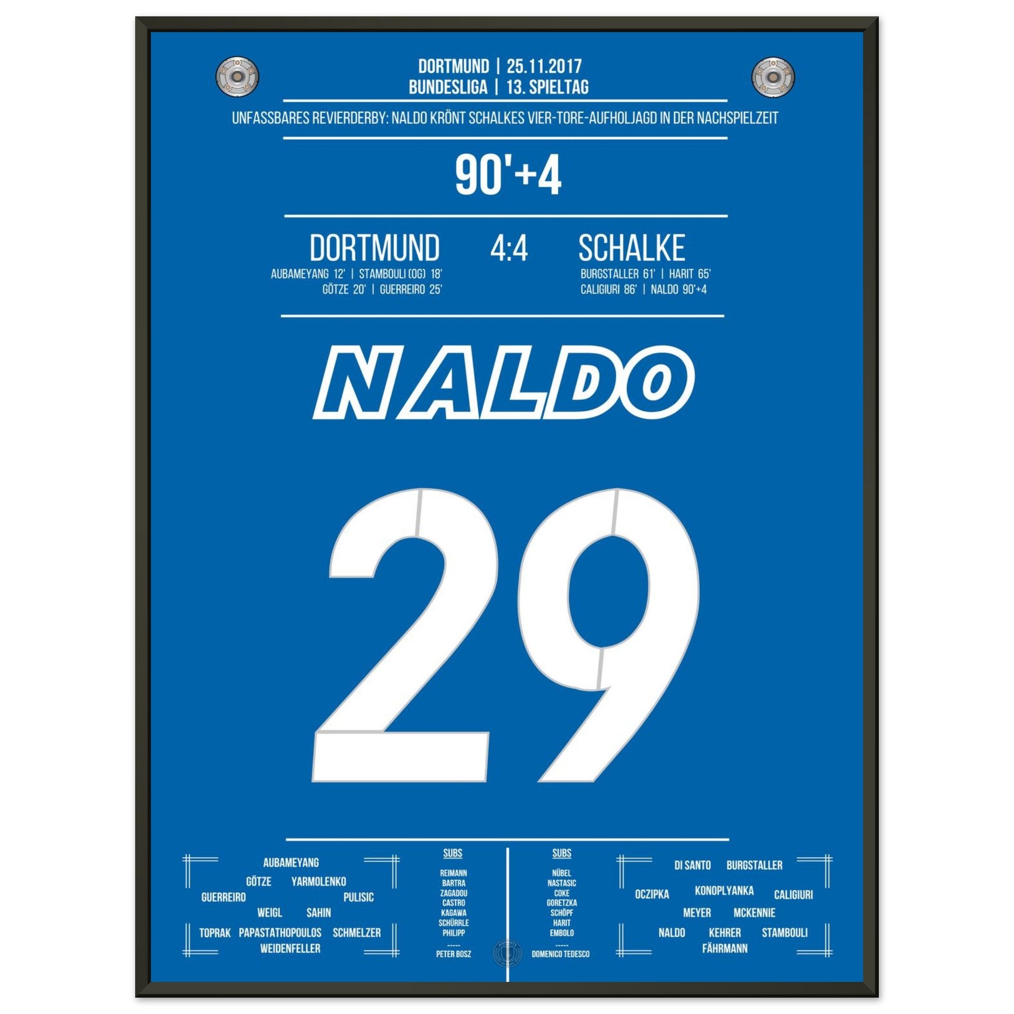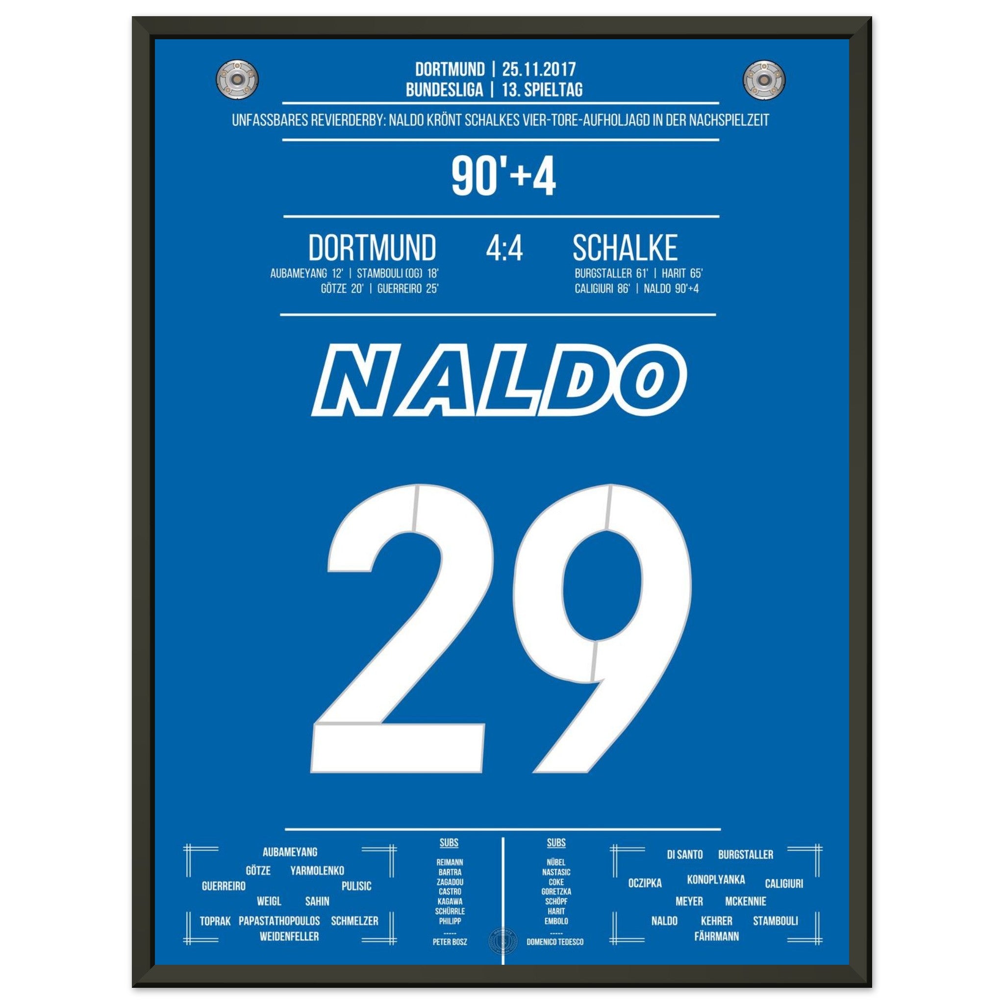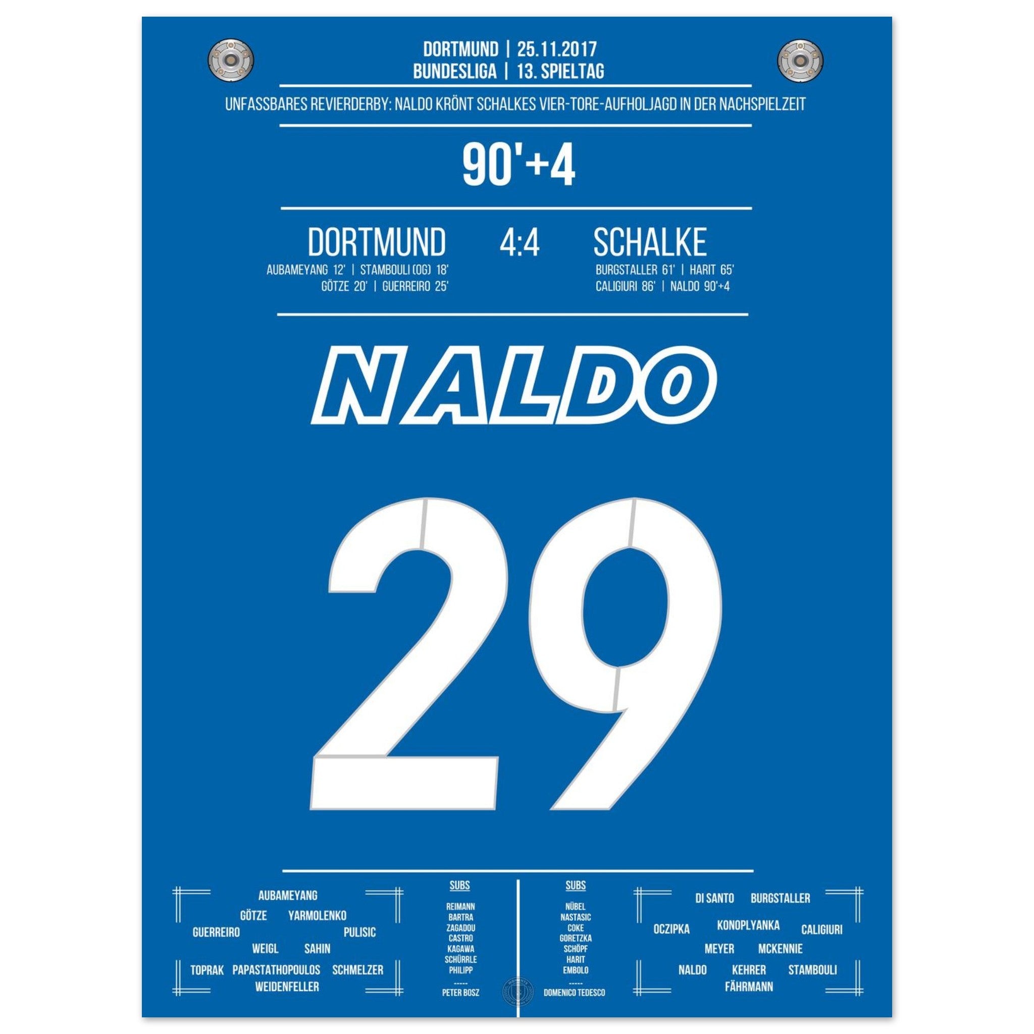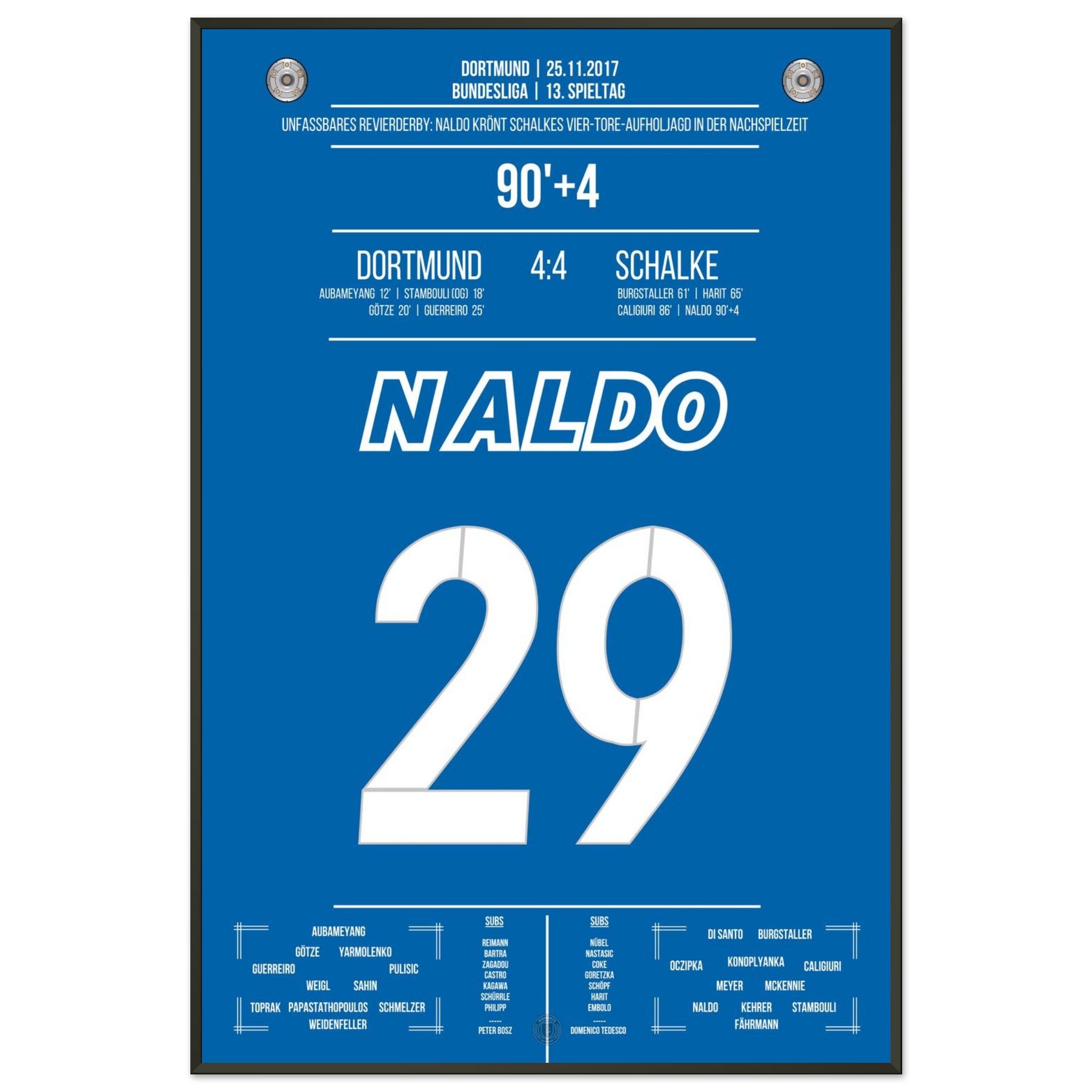 25. November 2017 – Dortmund vs. Schalke 4:4: In der 94. Minute steigt Naldo nach einer Ecke hoch und köpft zum unglaublichen 4:4 ein – der krönende Abschluss einer der spektakulärsten Aufholjagden der Bundesliga-Geschichte. Von 0:4 auf 4:4. Unvergessen. Unser Poster hält diesen magischen Derby-Moment in Königsblau fest.