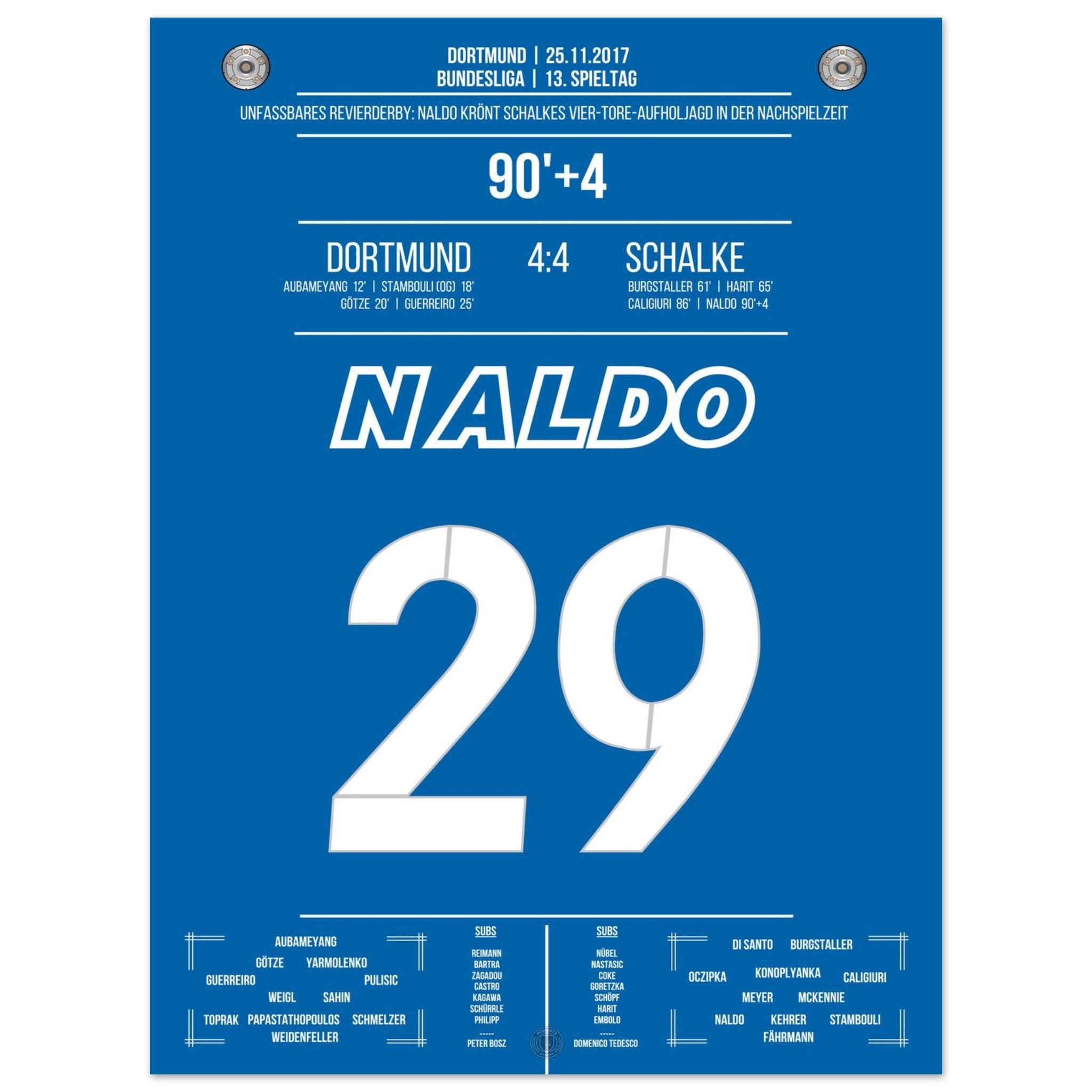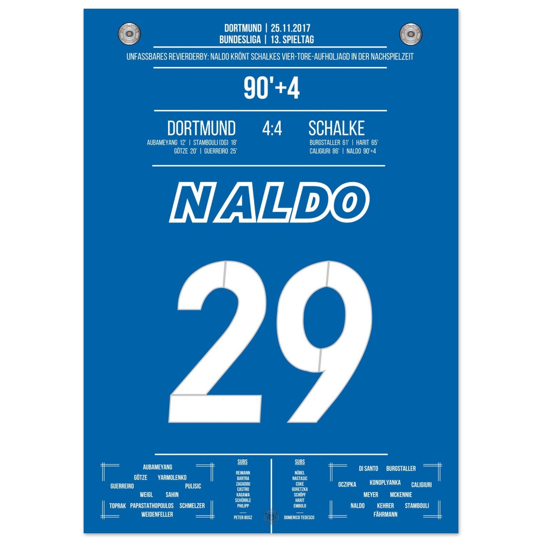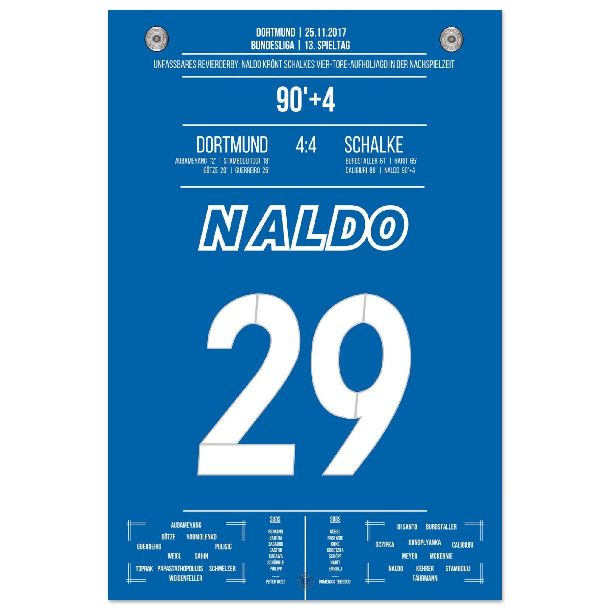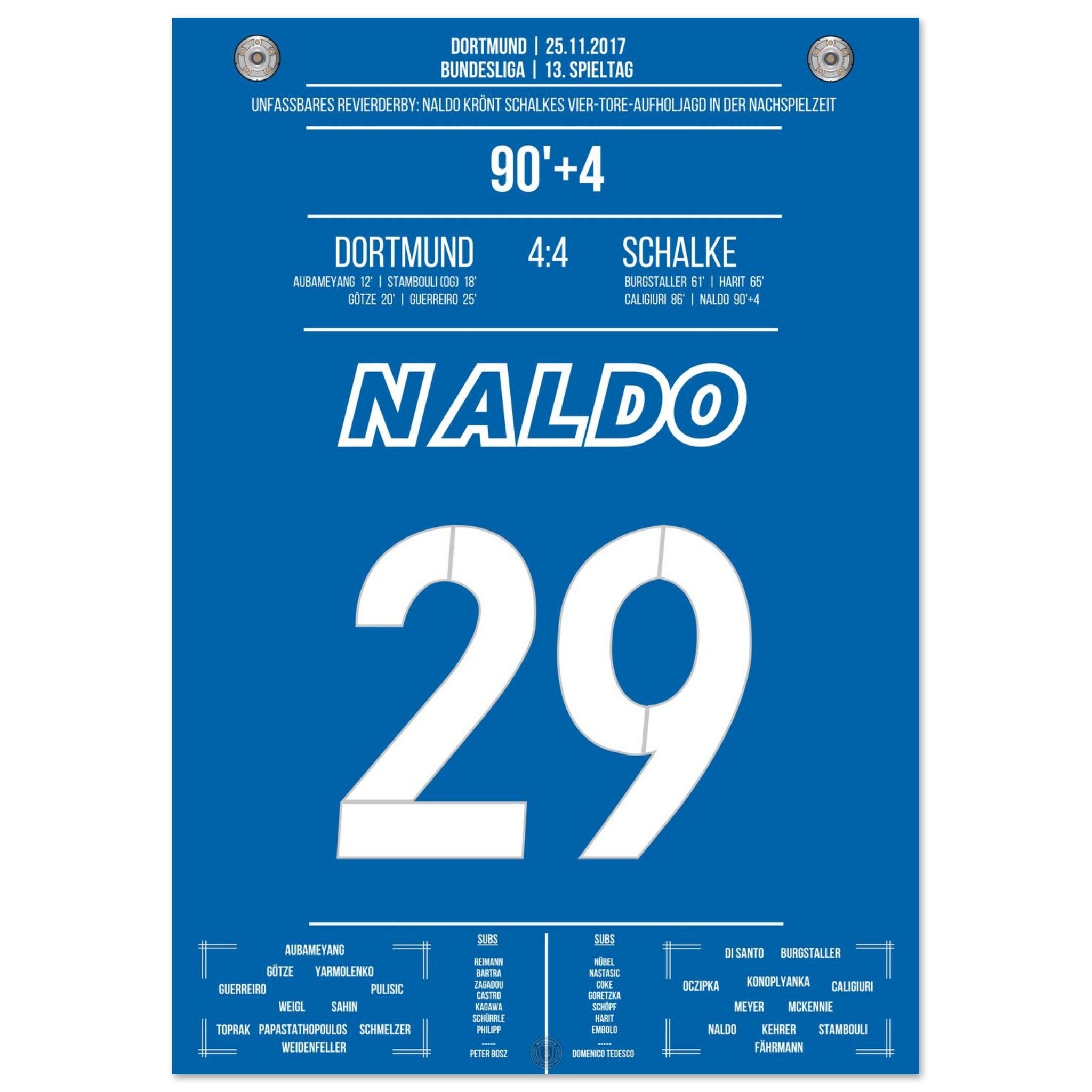 25. November 2017 – Dortmund vs. Schalke 4:4: In der 94. Minute steigt Naldo nach einer Ecke hoch und köpft zum unglaublichen 4:4 ein – der krönende Abschluss einer der spektakulärsten Aufholjagden der Bundesliga-Geschichte. Von 0:4 auf 4:4. Unvergessen. Unser Poster hält diesen magischen Derby-Moment in Königsblau fest.