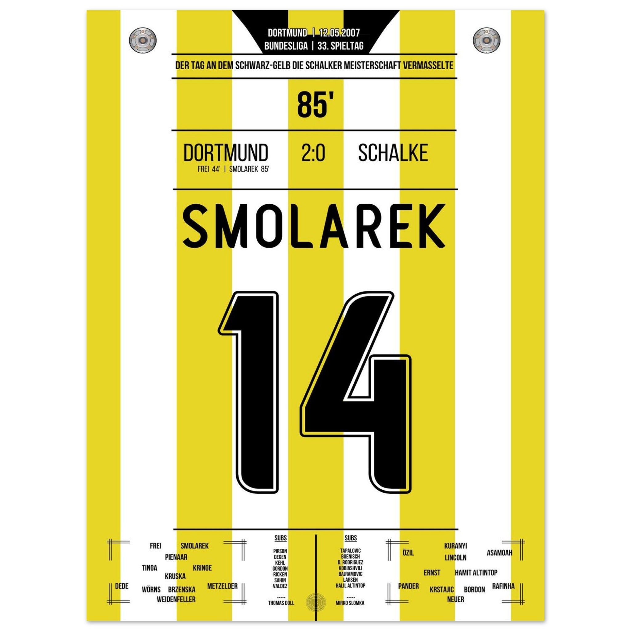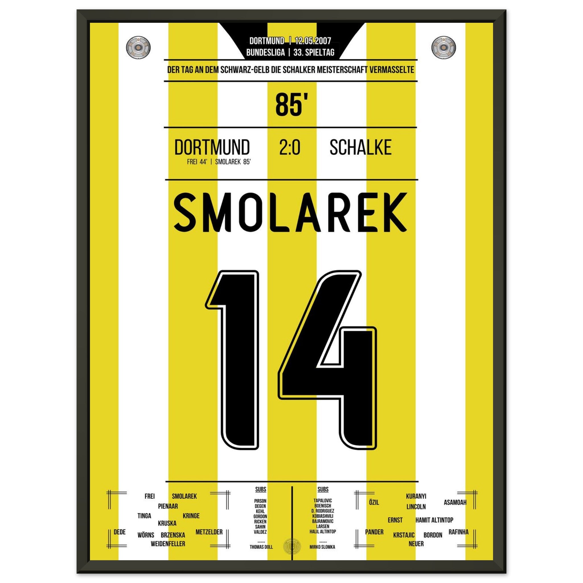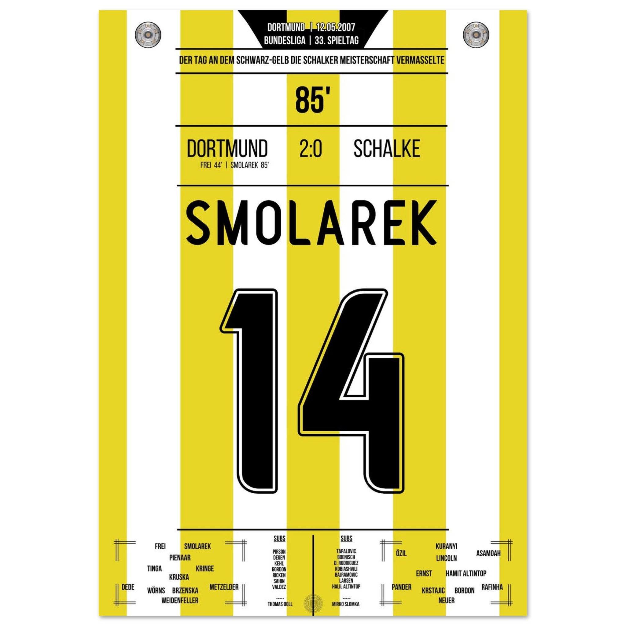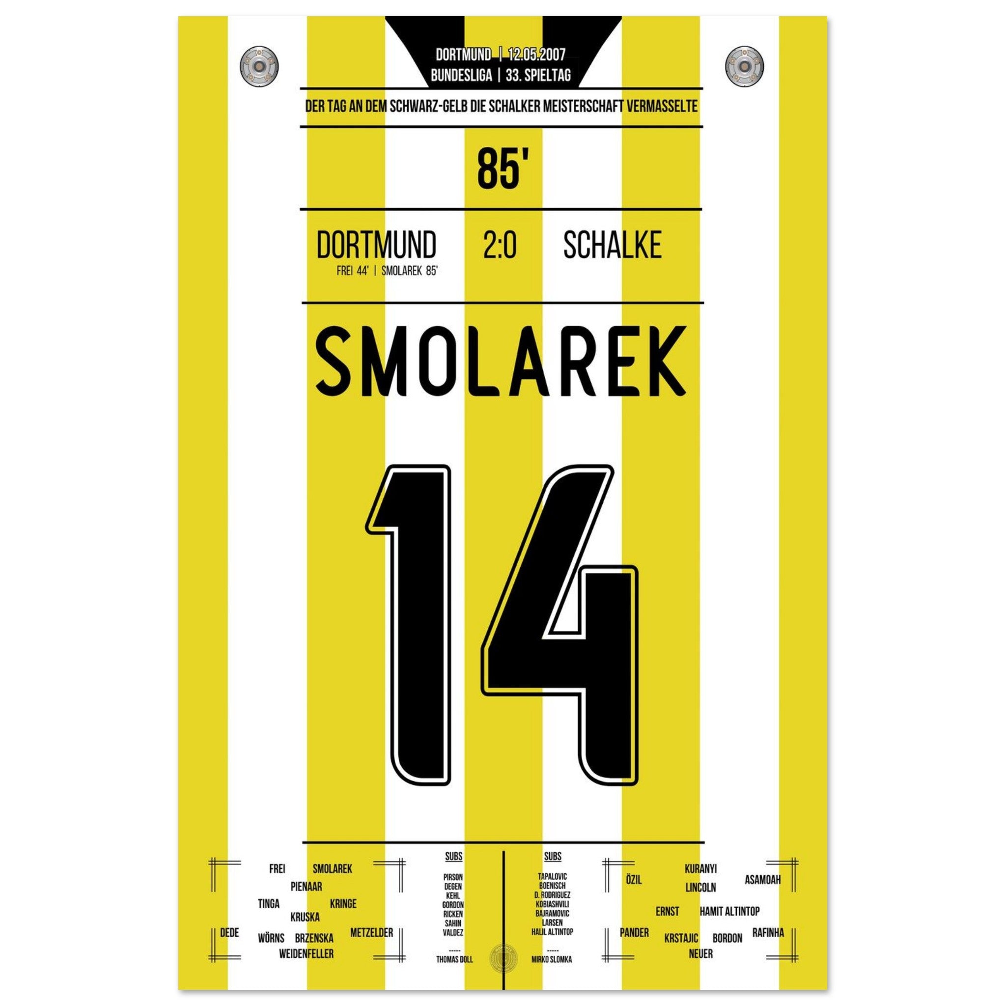 12. Mai 2007 – Dortmund vs. Schalke 2:0: Ebi Smolarek trifft im Derby und stürzt Schalke im Titelrennen – Dortmund vermasselt dem Erzrivalen die Meisterschaft und feiert den Sieg wie einen Titel. Ein Klassiker für die Ewigkeit. Unser Poster hält diesen legendären Derby-Moment in Schwarz-Gelb fest.
