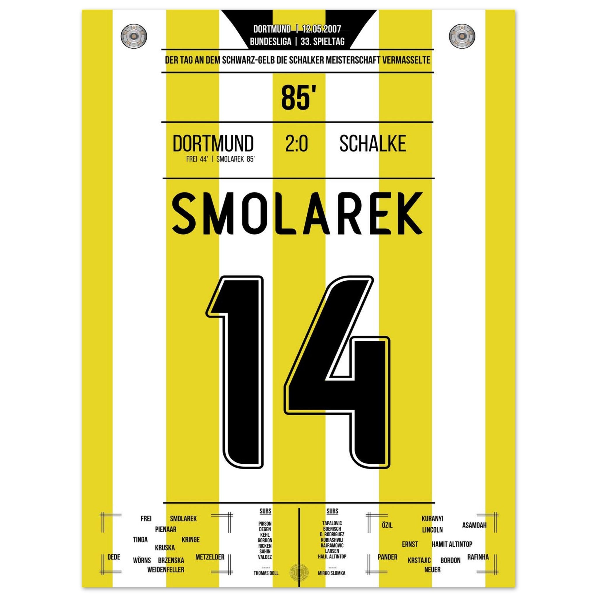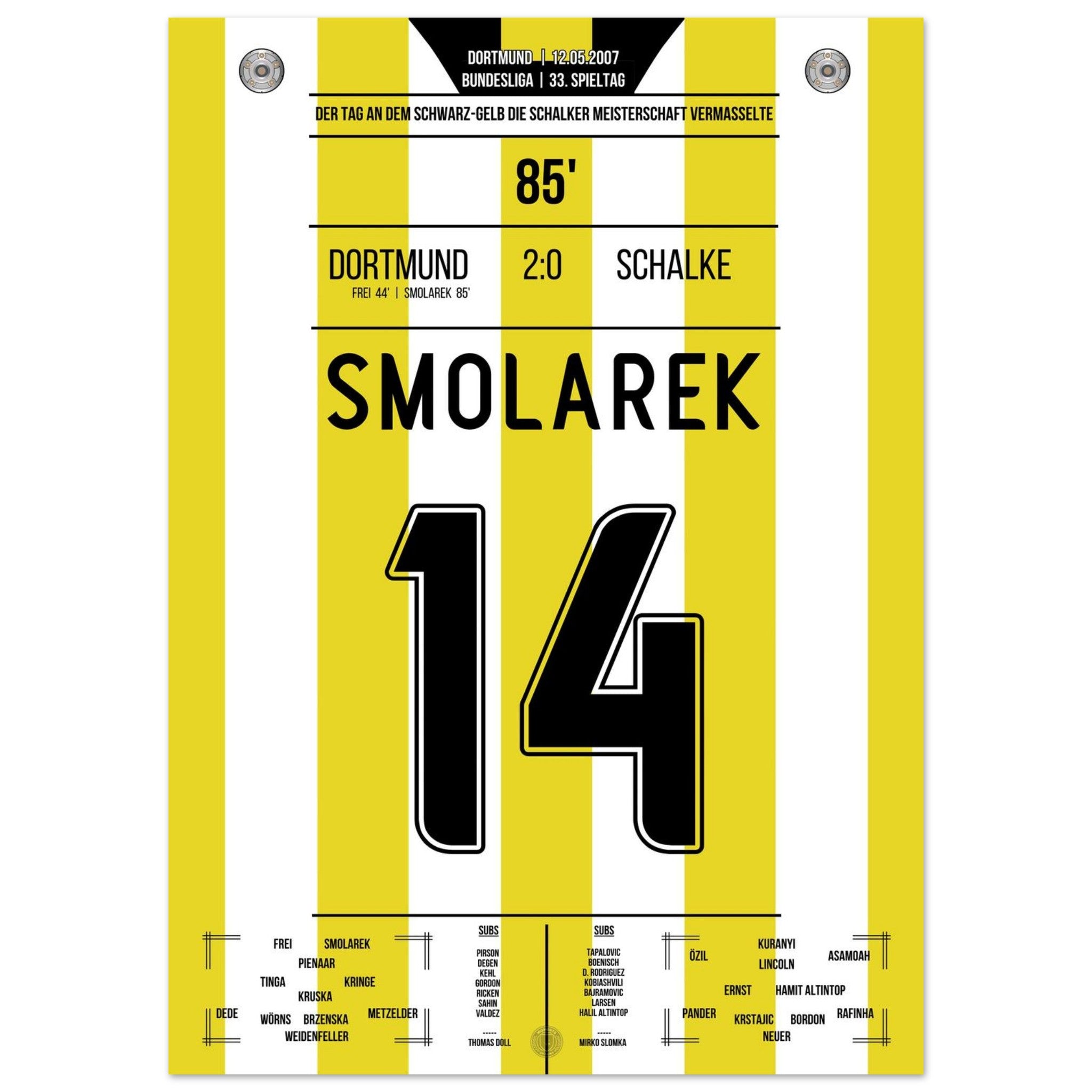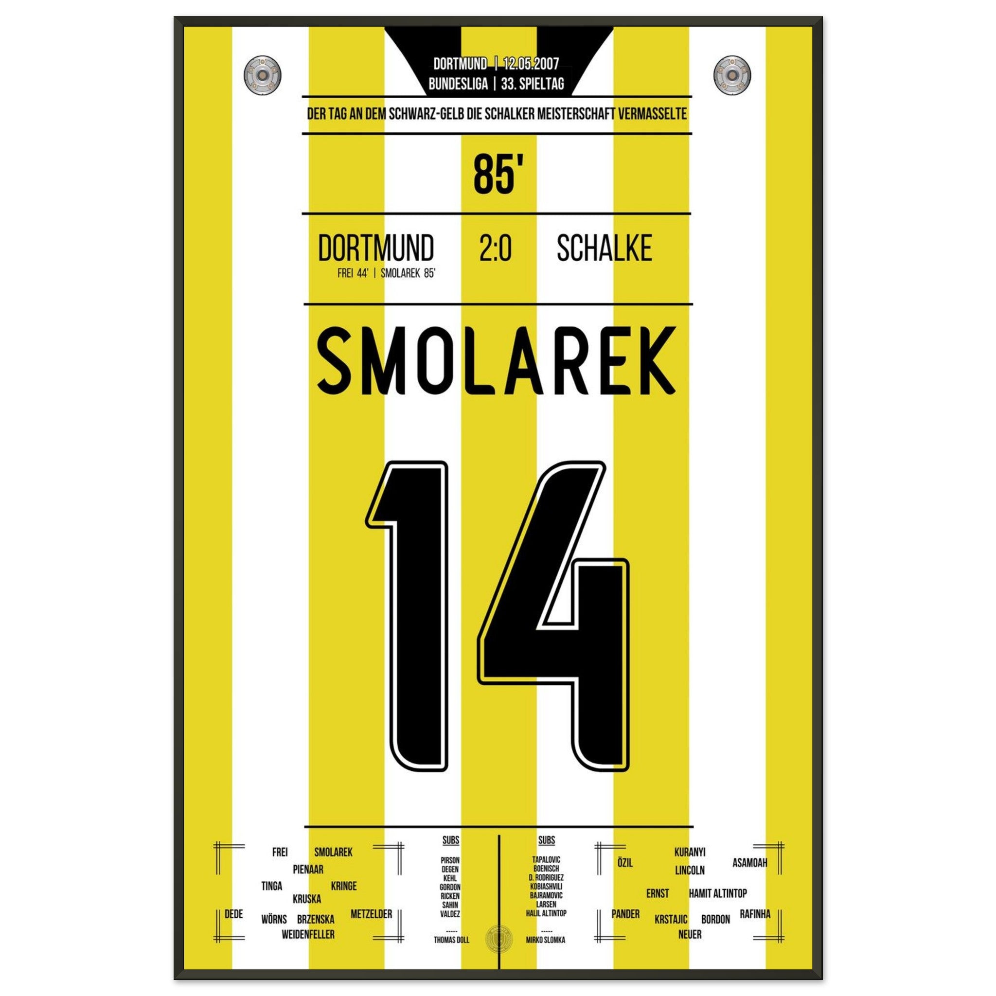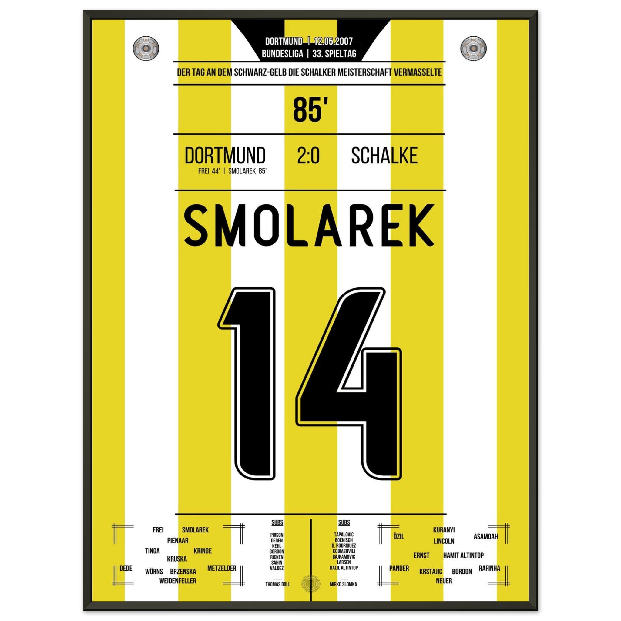 12. Mai 2007 – Dortmund vs. Schalke 2:0: Ebi Smolarek trifft im Derby und stürzt Schalke im Titelrennen – Dortmund vermasselt dem Erzrivalen die Meisterschaft und feiert den Sieg wie einen Titel. Ein Klassiker für die Ewigkeit. Unser Poster hält diesen legendären Derby-Moment in Schwarz-Gelb fest.