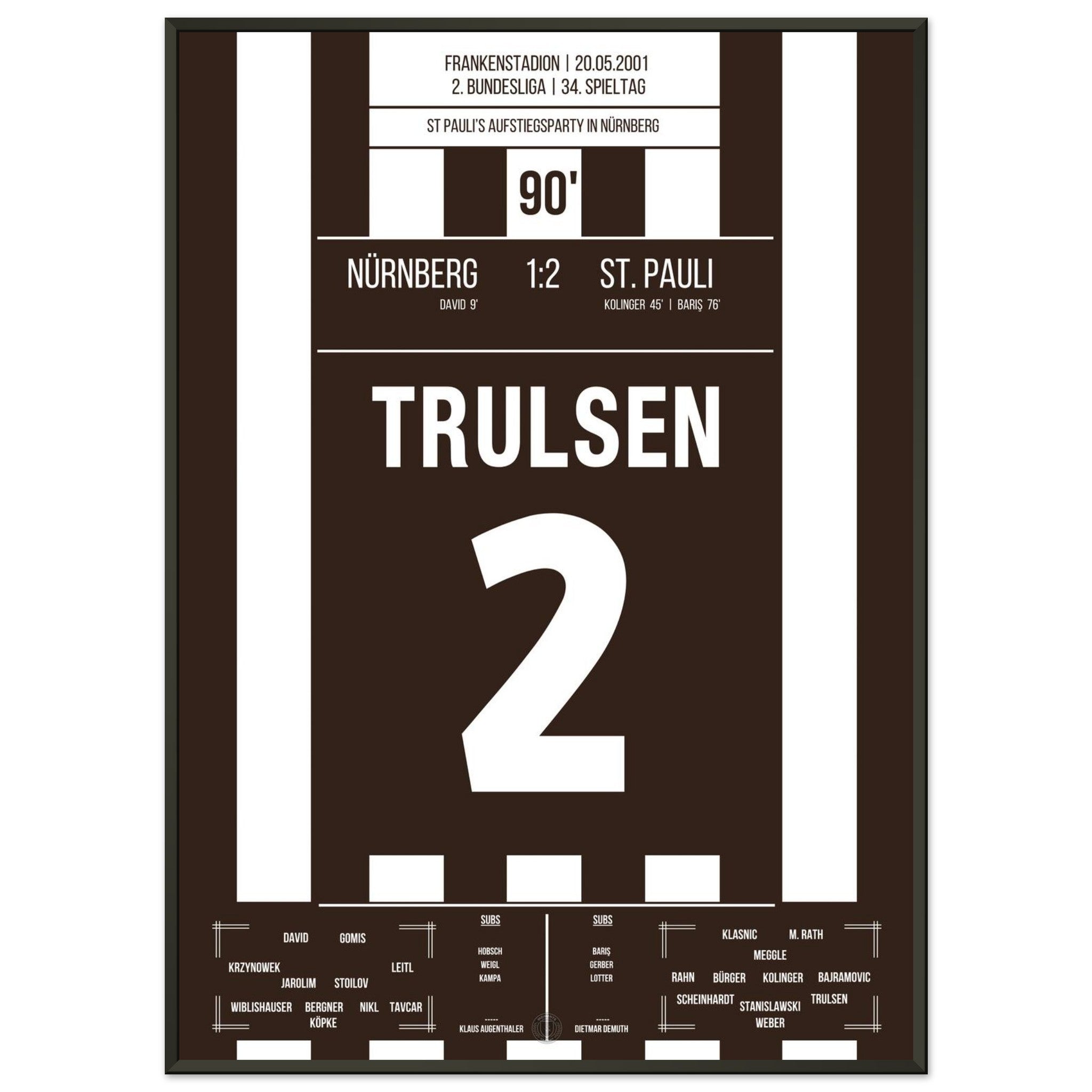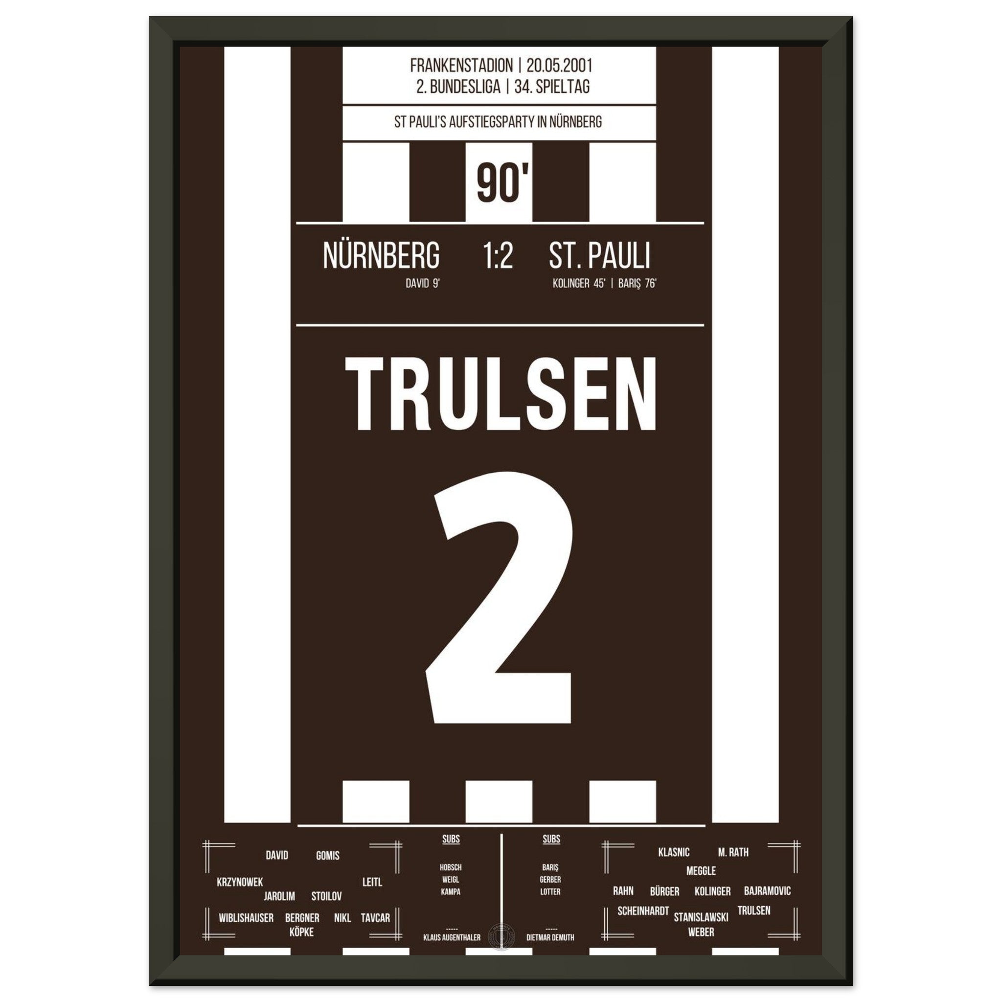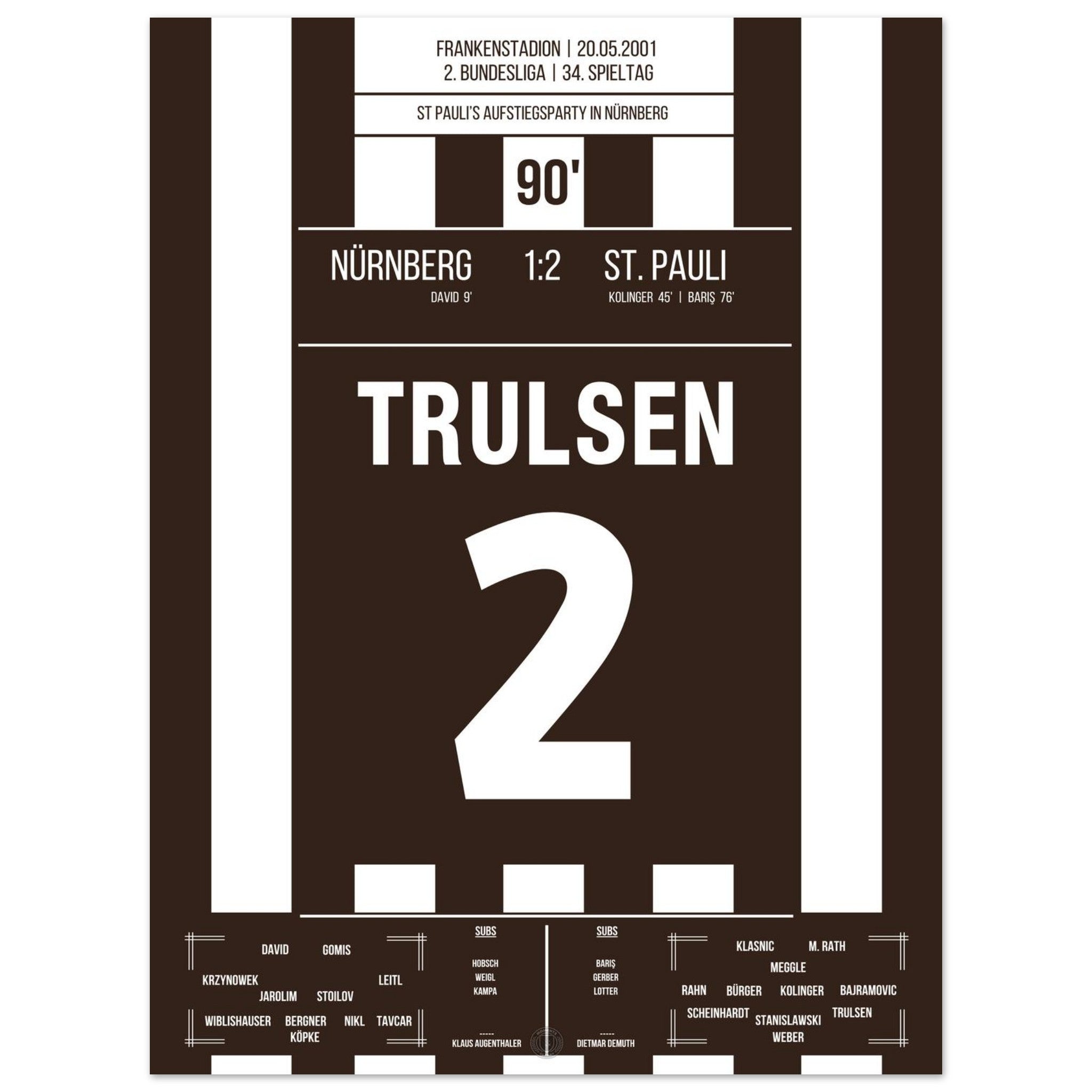 20. Mai 2001 – Nürnberg vs. St. Pauli 1:2: Am letzten Spieltag krönt sich St. Pauli mit einem Auswärtssieg in Nürnberg zum Aufsteiger – Ekstase pur bei den Fans, Rückkehr in die Bundesliga perfekt. Unser Poster hält diesen emotionalen Aufstiegsmoment in Braun-Weiß fest.