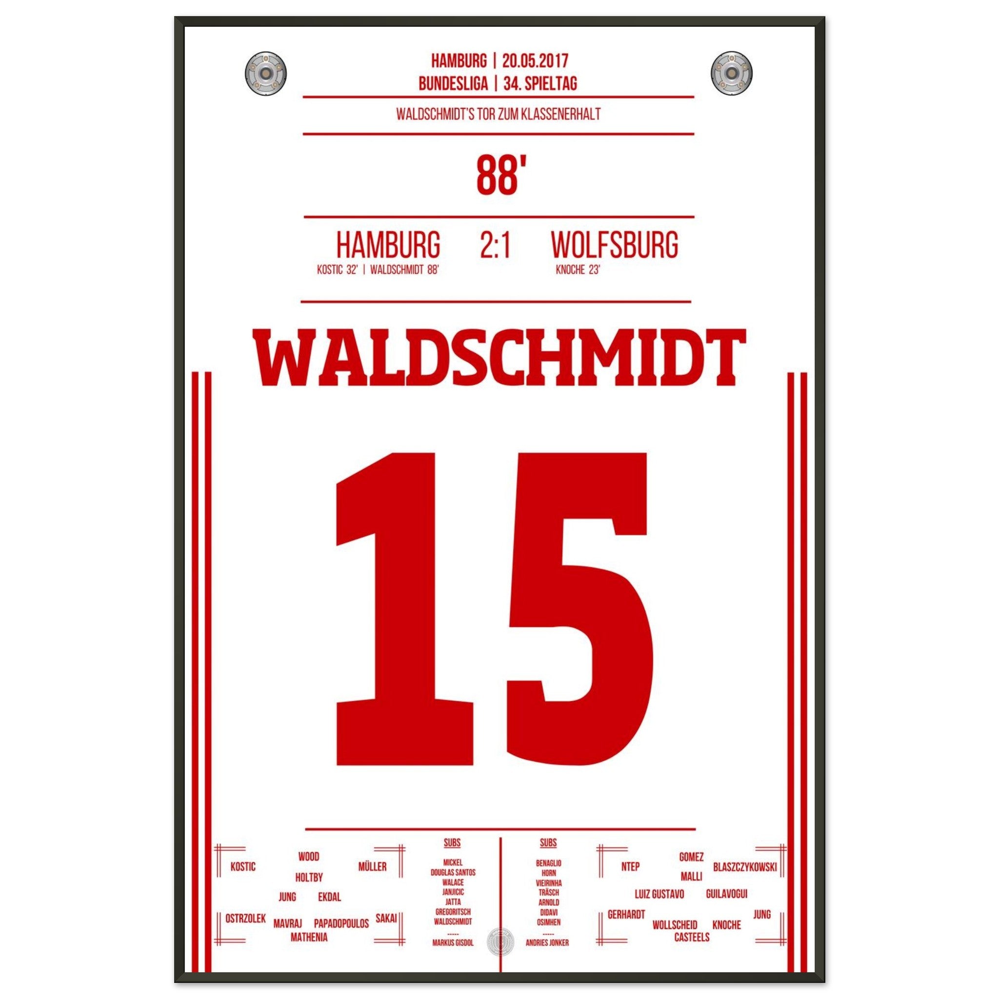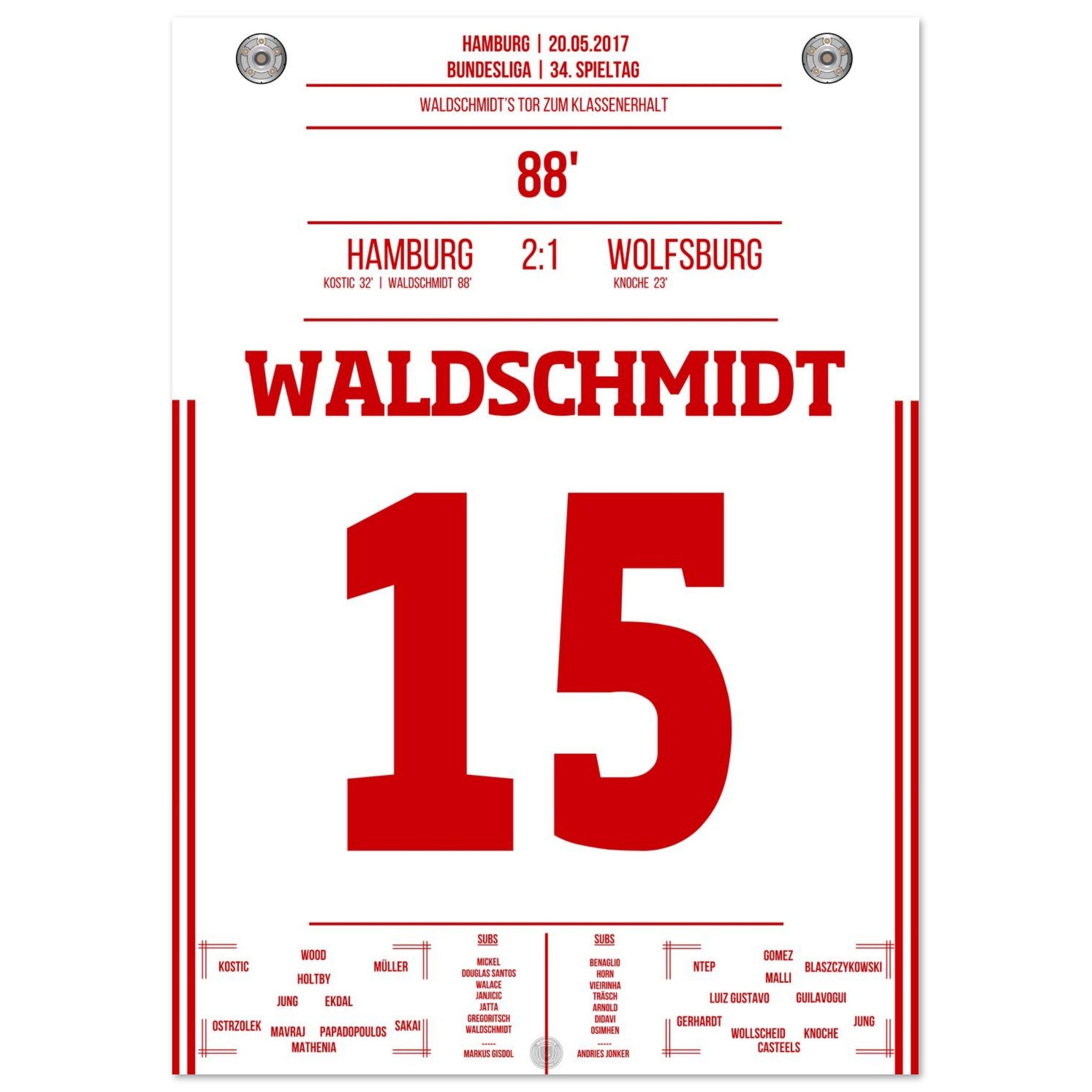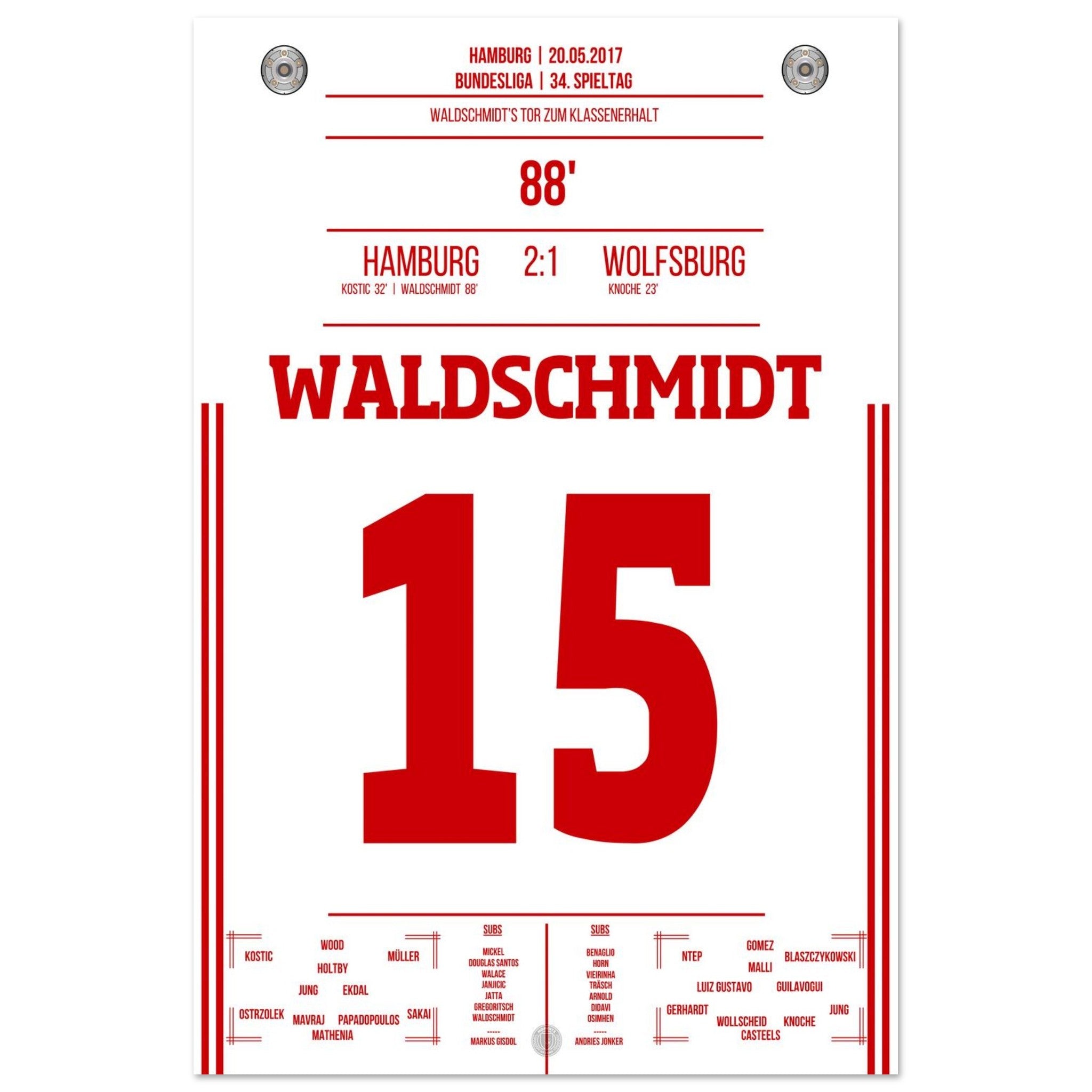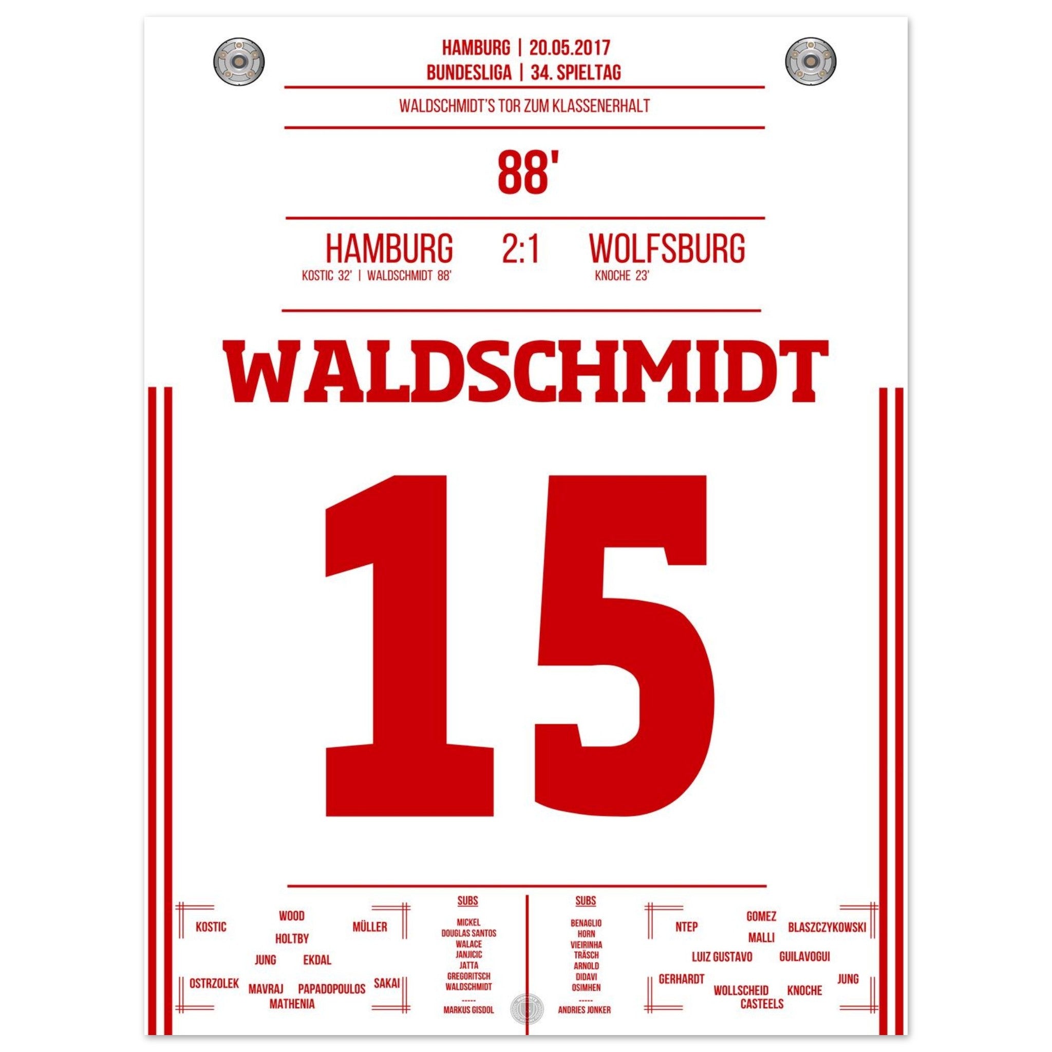20. Mai 2017 – Hamburg vs. Wolfsburg 2:1: In der 88. Minute wird Luca Waldschmidt zur Hamburger Legende: Sein Tor sichert den Klassenerhalt und lässt den Volkspark explodieren. Unser Poster feiert den Moment, in dem ein ganzes Stadion durchdrehte.
