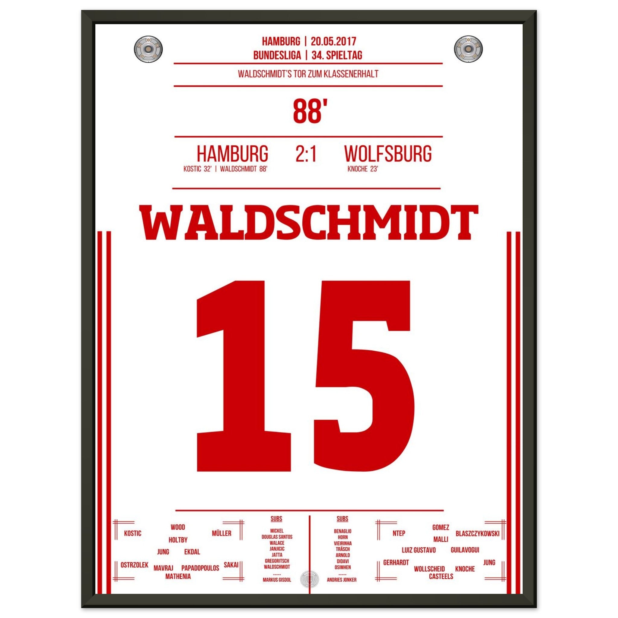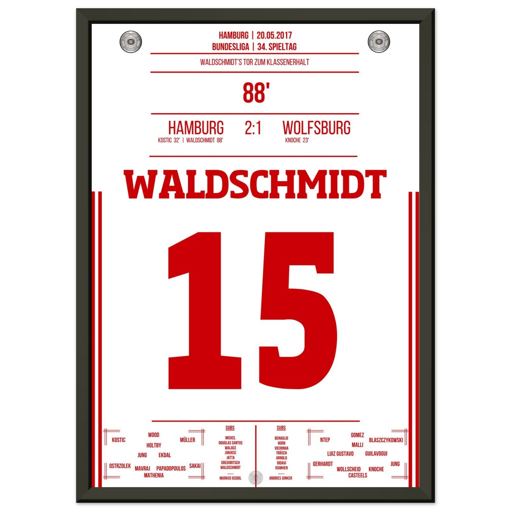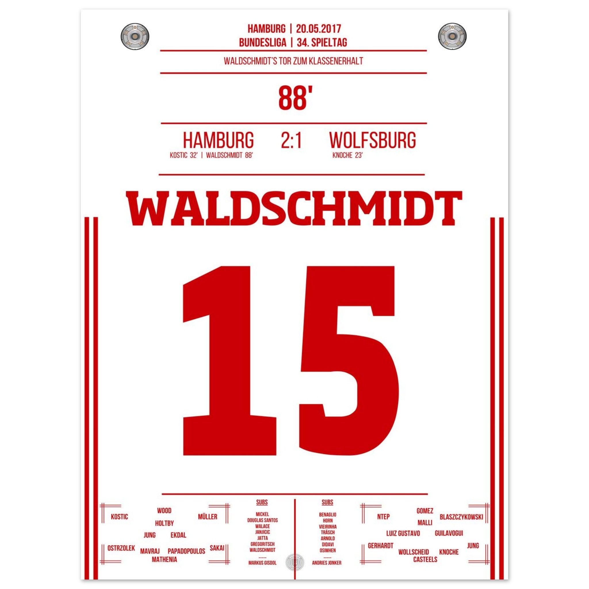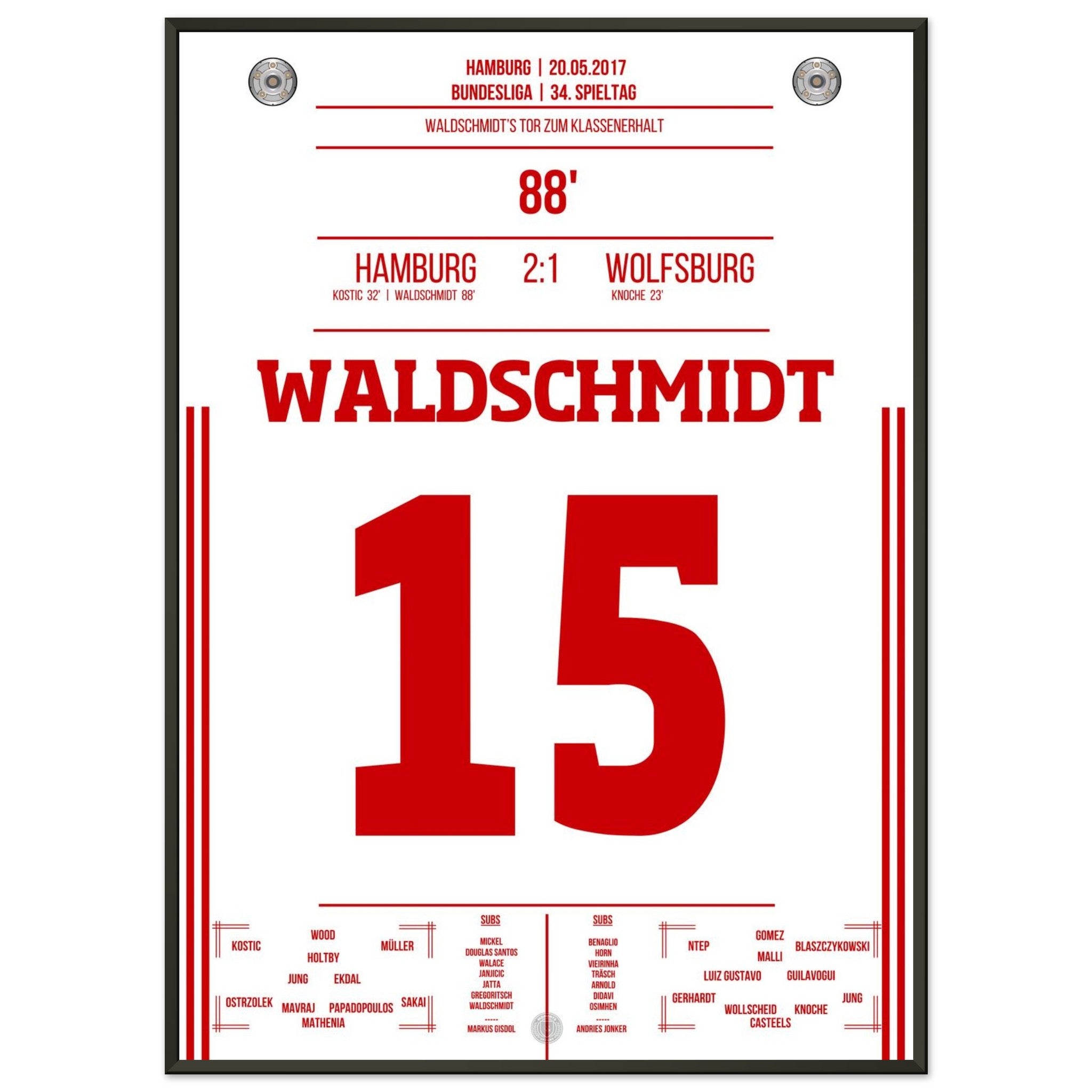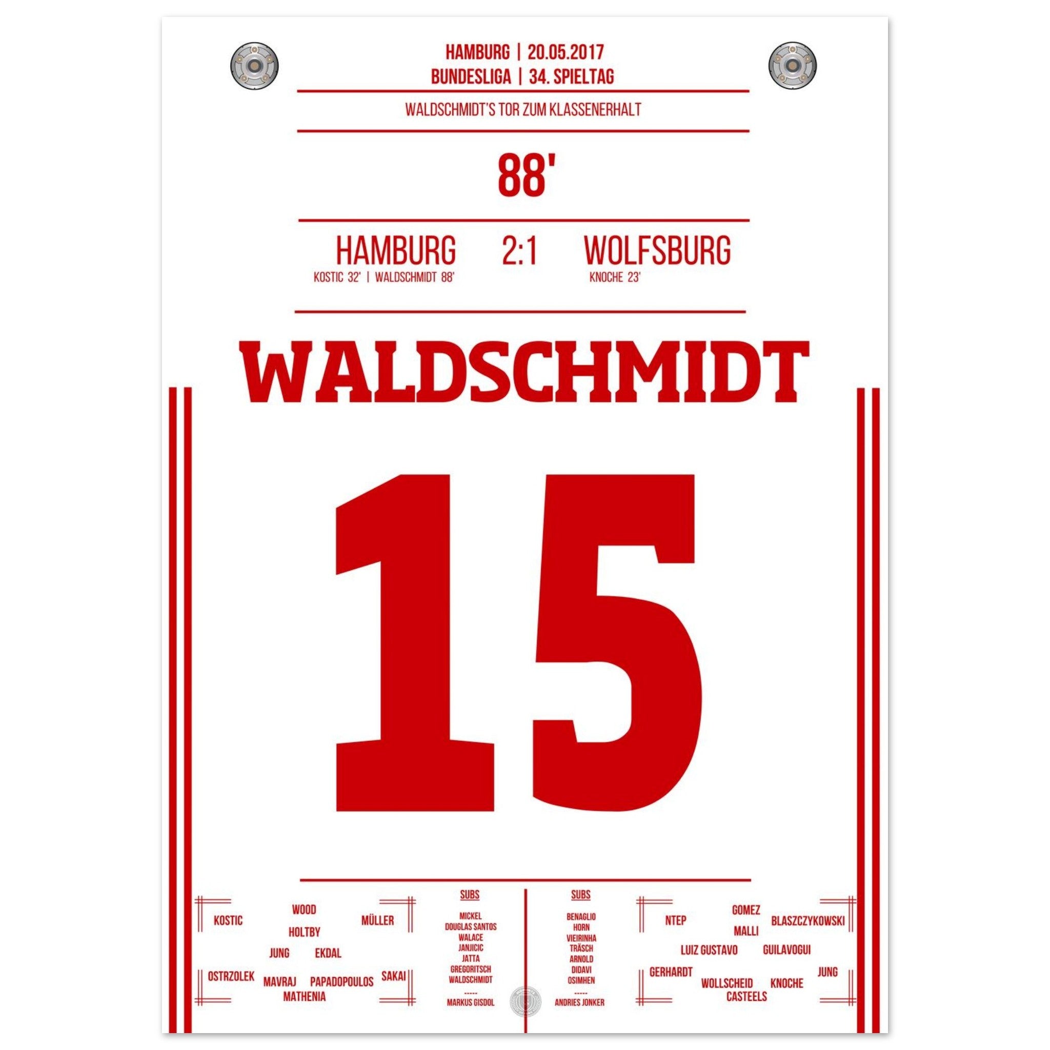 20. Mai 2017 – Hamburg vs. Wolfsburg 2:1: In der 88. Minute wird Luca Waldschmidt zur Hamburger Legende: Sein Tor sichert den Klassenerhalt und lässt den Volkspark explodieren. Unser Poster feiert den Moment, in dem ein ganzes Stadion durchdrehte.