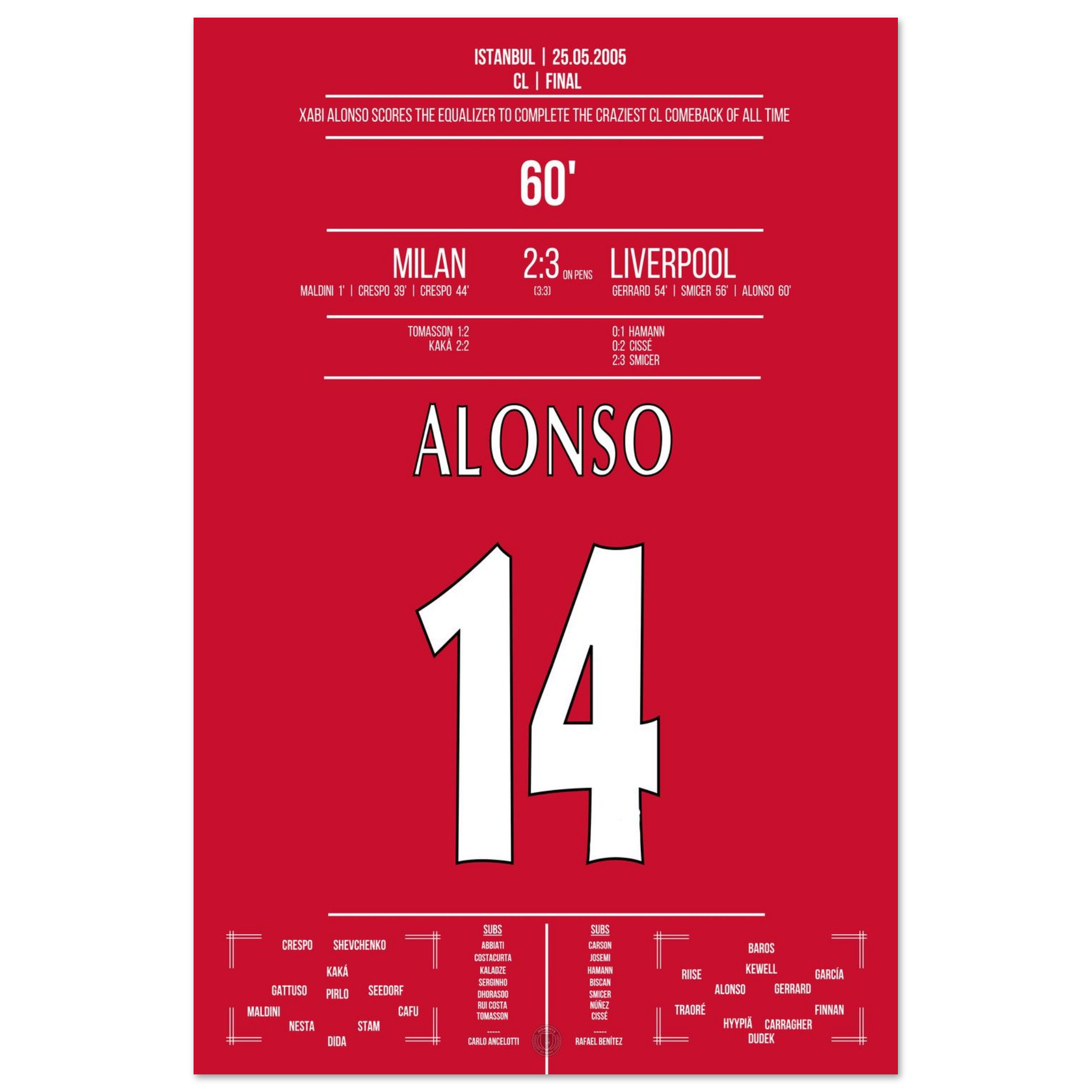 Nach Gerrard und Smicer ist es Xabi Alonso, der Geschichte schreibt: In der 60. Minute verwandelt er im Nachschuss seinen eigenen Elfmeter und macht das 3:3 perfekt – der Moment, in dem das Unmögliche Wirklichkeit wird.